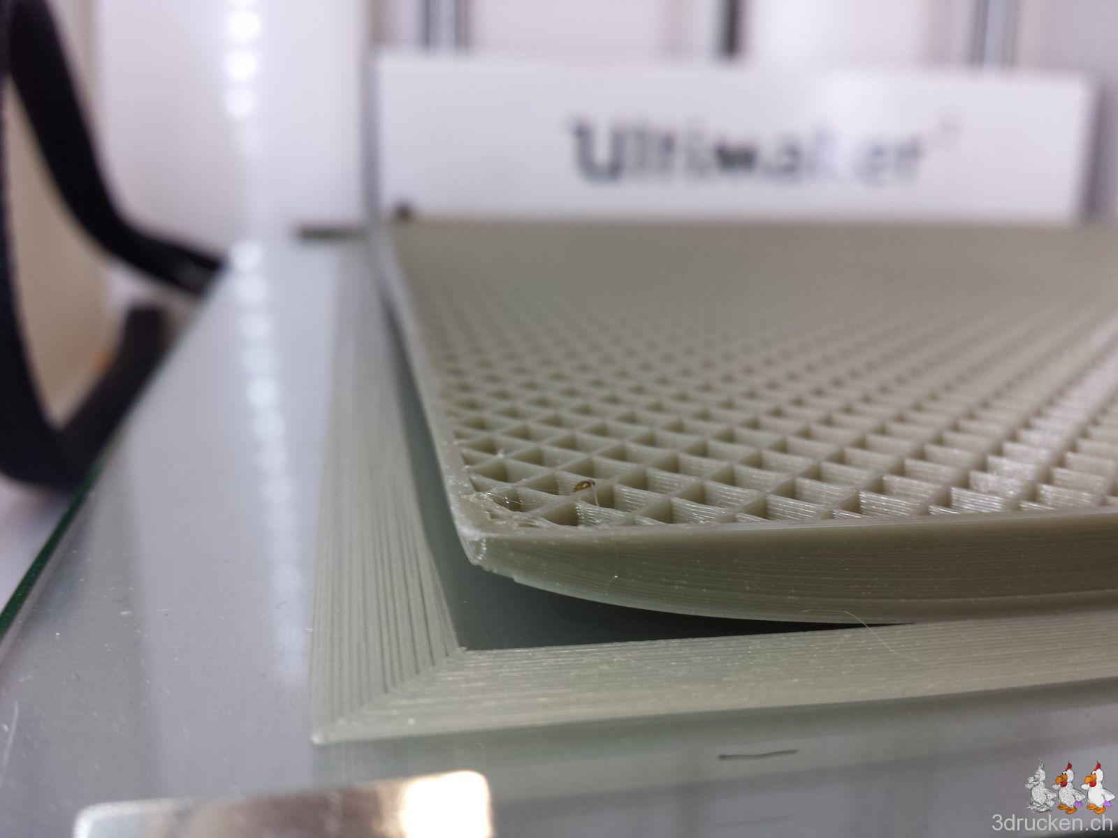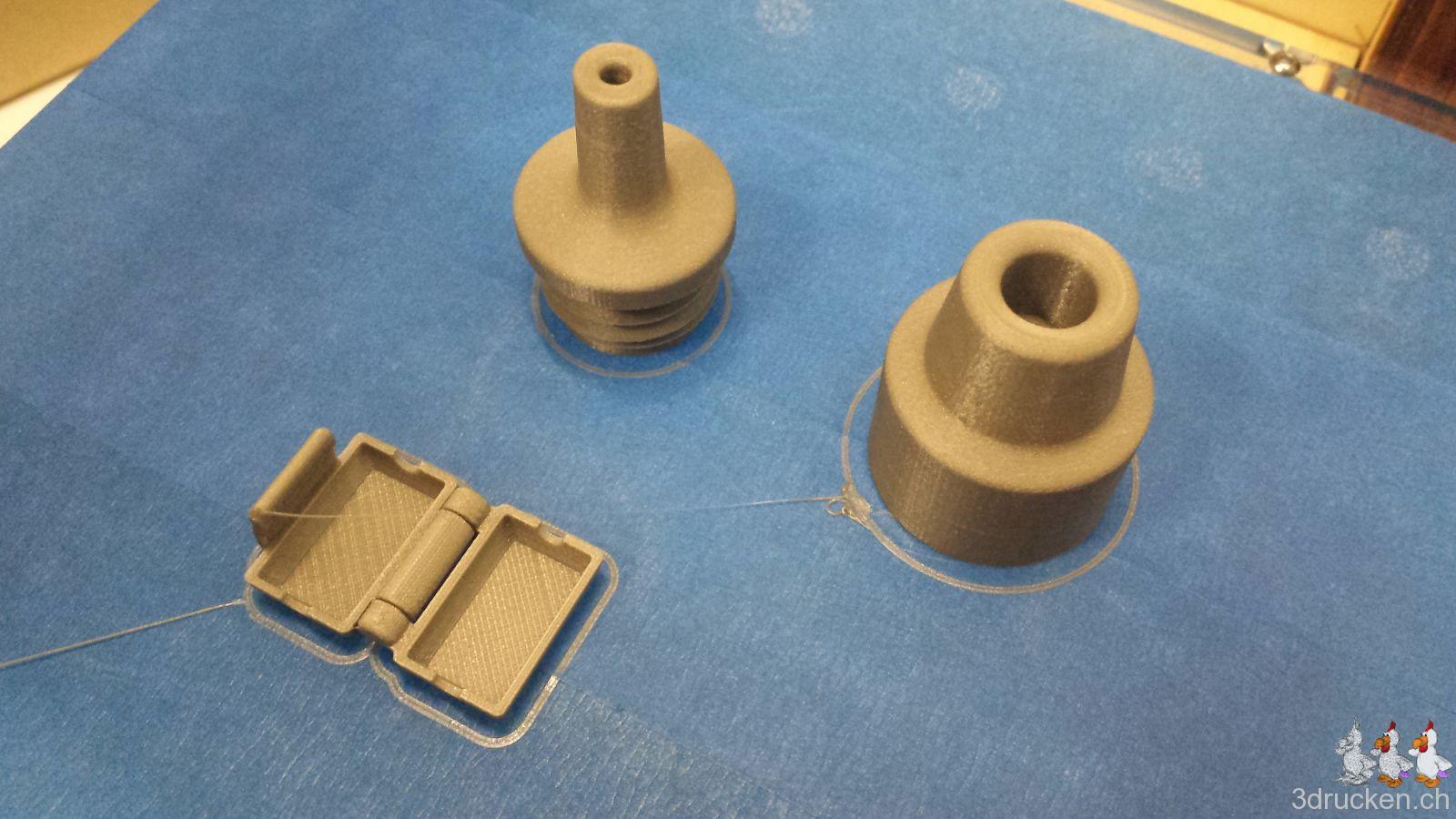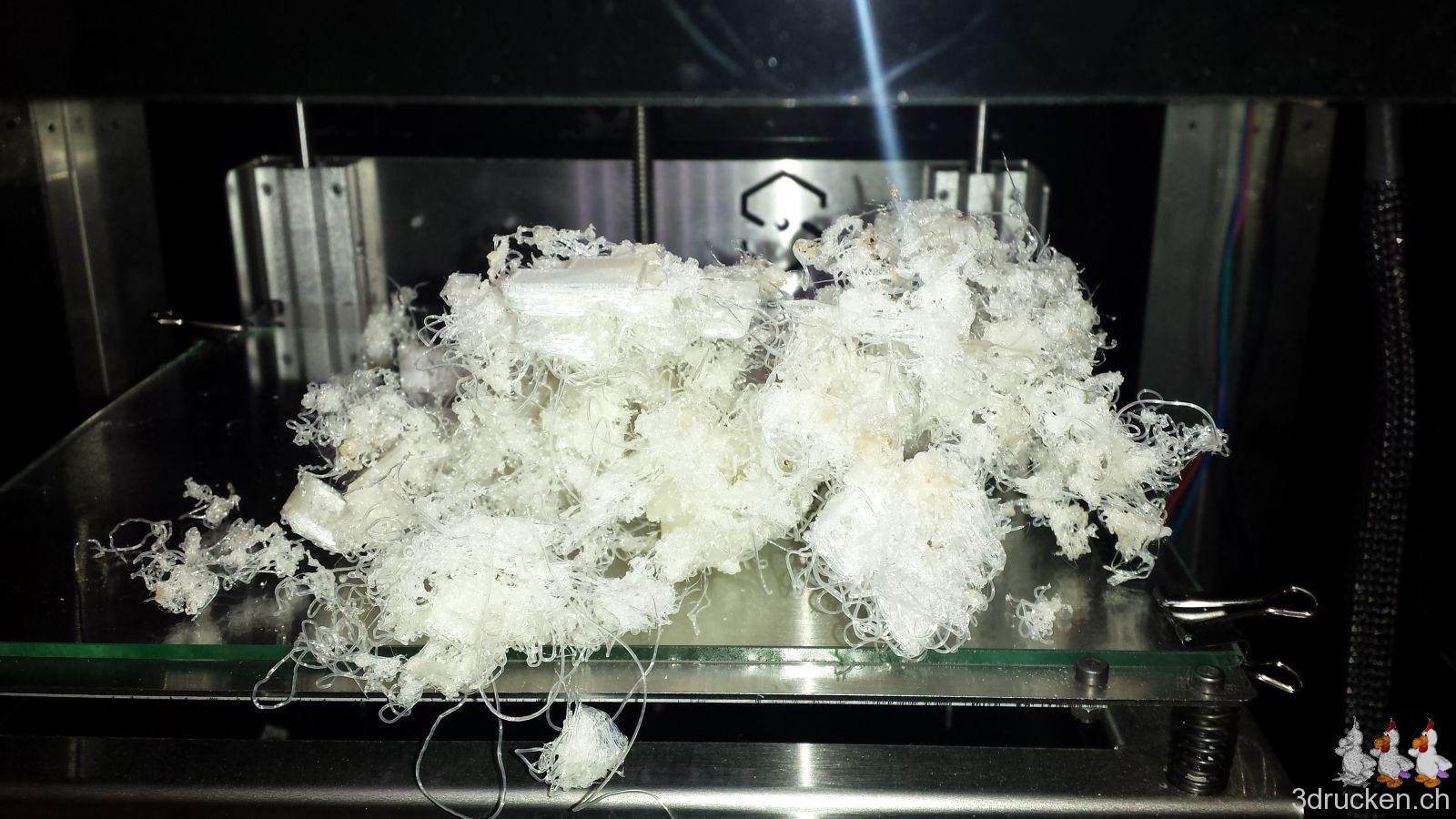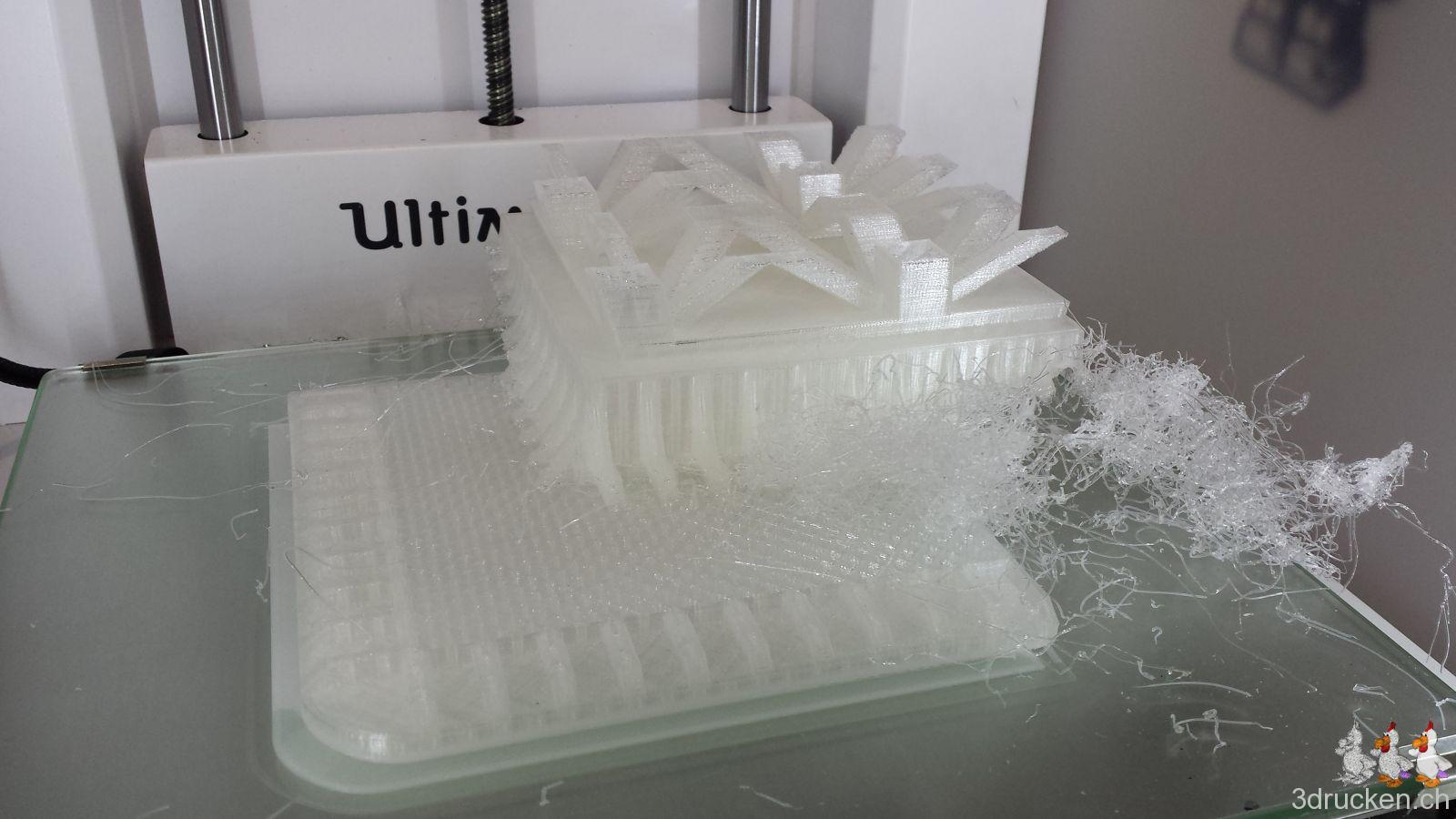 Gedruckt haben wir meistens bei 220° – 230° C, Tisch auf 80° C, mit zusätzlichem Ofen im Druckerraum, der sonst nicht beheizt ist. So gelang es uns, die Temperatur zwischen ca. 20 – 23° C zu halten und die Teile gut haftend auf dem Tisch zu halten, bis der Druck jeweils vorbei war. Für die Teile mit vielen Retractions haben wir die Einstellungen in Cura auf 0.2 mm (von 0.02 mm) Mindestlänge Vorschub vor dem nächsten Rückzug erhöht. Für die Haftung auf dem Drucktisch haben wir mit Haarspray und dem von Ultimaker mitgelieferten Leimstift experimentiert, und sind vom Haarspray zum Schluss wieder auf den Leim zurück gekommen. Der Leim lässt sich übrigens mit Wasser leicht wieder abwaschen.
