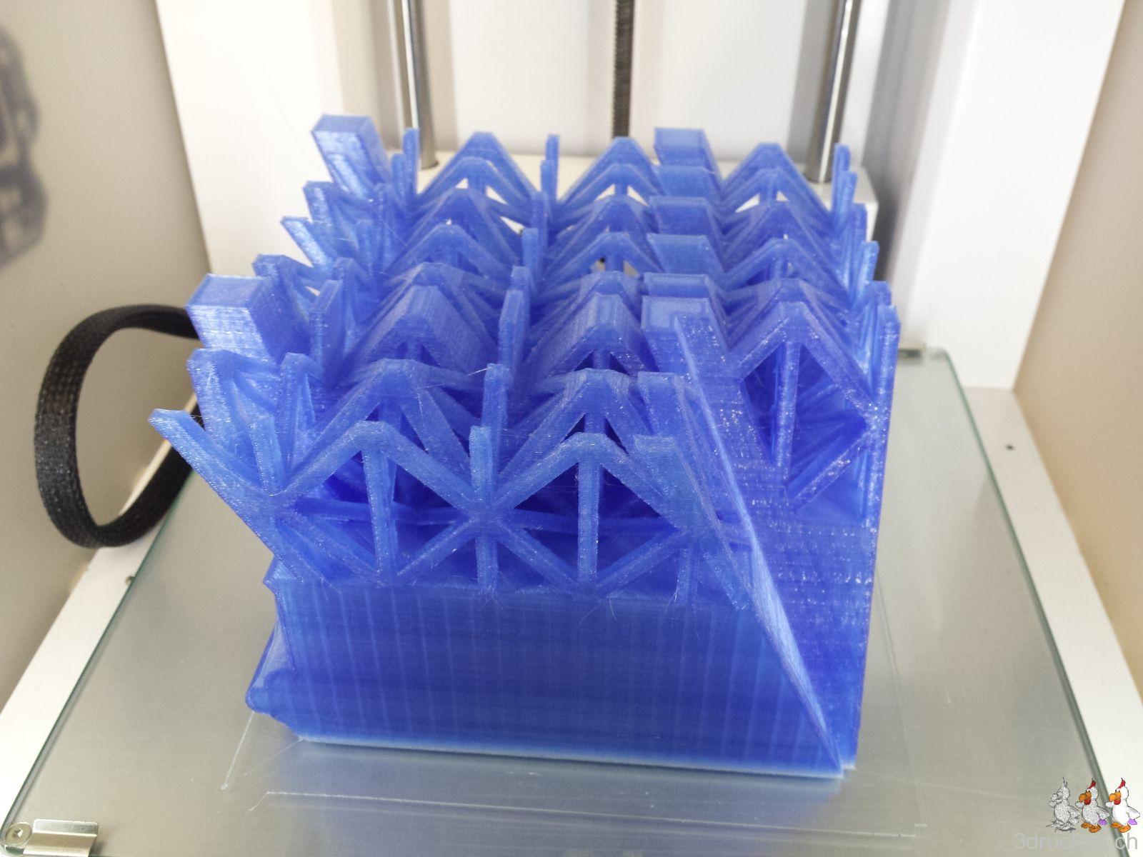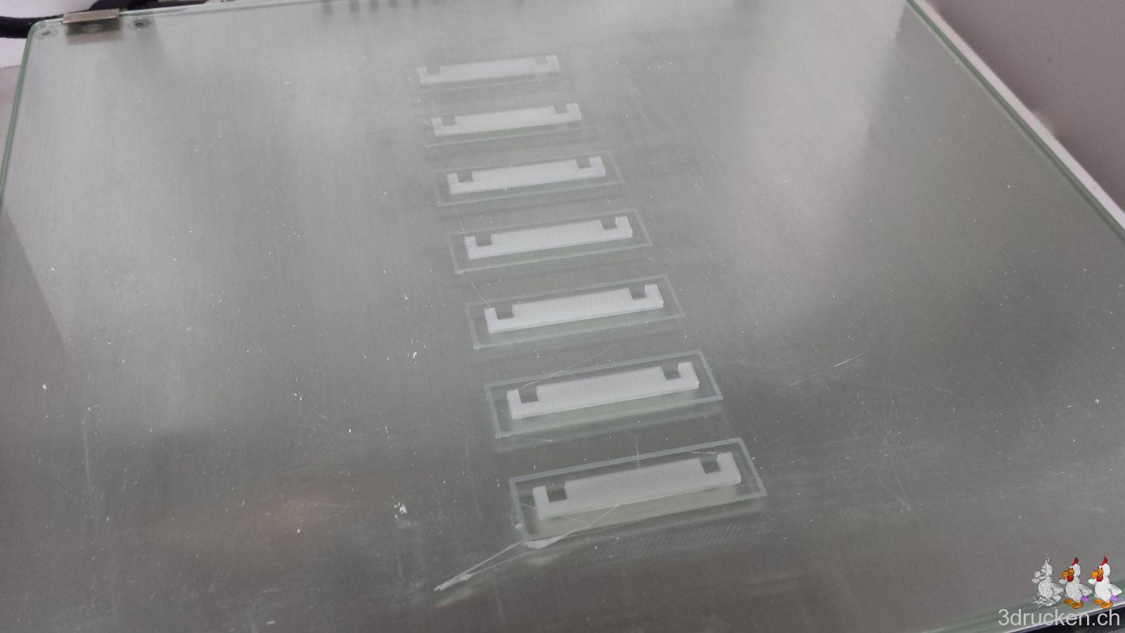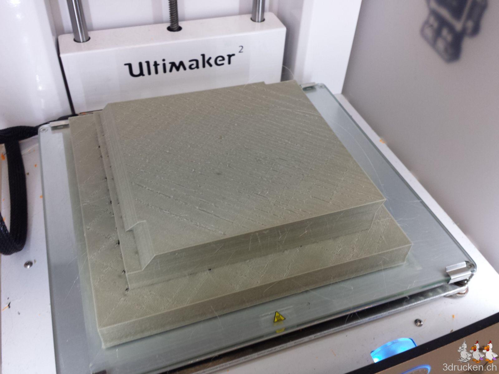 Gedruckt haben wir meistens bei 220° – 230° C, Tisch auf 80° C, mit zusätzlichem Ofen im Druckerraum, der sonst nicht beheizt ist. So gelang es uns, die Temperatur zwischen ca. 20 – 23° C zu halten und die Teile gut haftend auf dem Tisch zu halten, bis der Druck jeweils vorbei war. Für die Teile mit vielen Retractions haben wir die Einstellungen in Cura auf 0.2 mm (von 0.02 mm) Mindestlänge Vorschub vor dem nächsten Rückzug erhöht. Für die Haftung auf dem Drucktisch haben wir mit Haarspray und dem von Ultimaker mitgelieferten Leimstift experimentiert, und sind vom Haarspray zum Schluss wieder auf den Leim zurück gekommen. Der Leim lässt sich übrigens mit Wasser leicht wieder abwaschen.