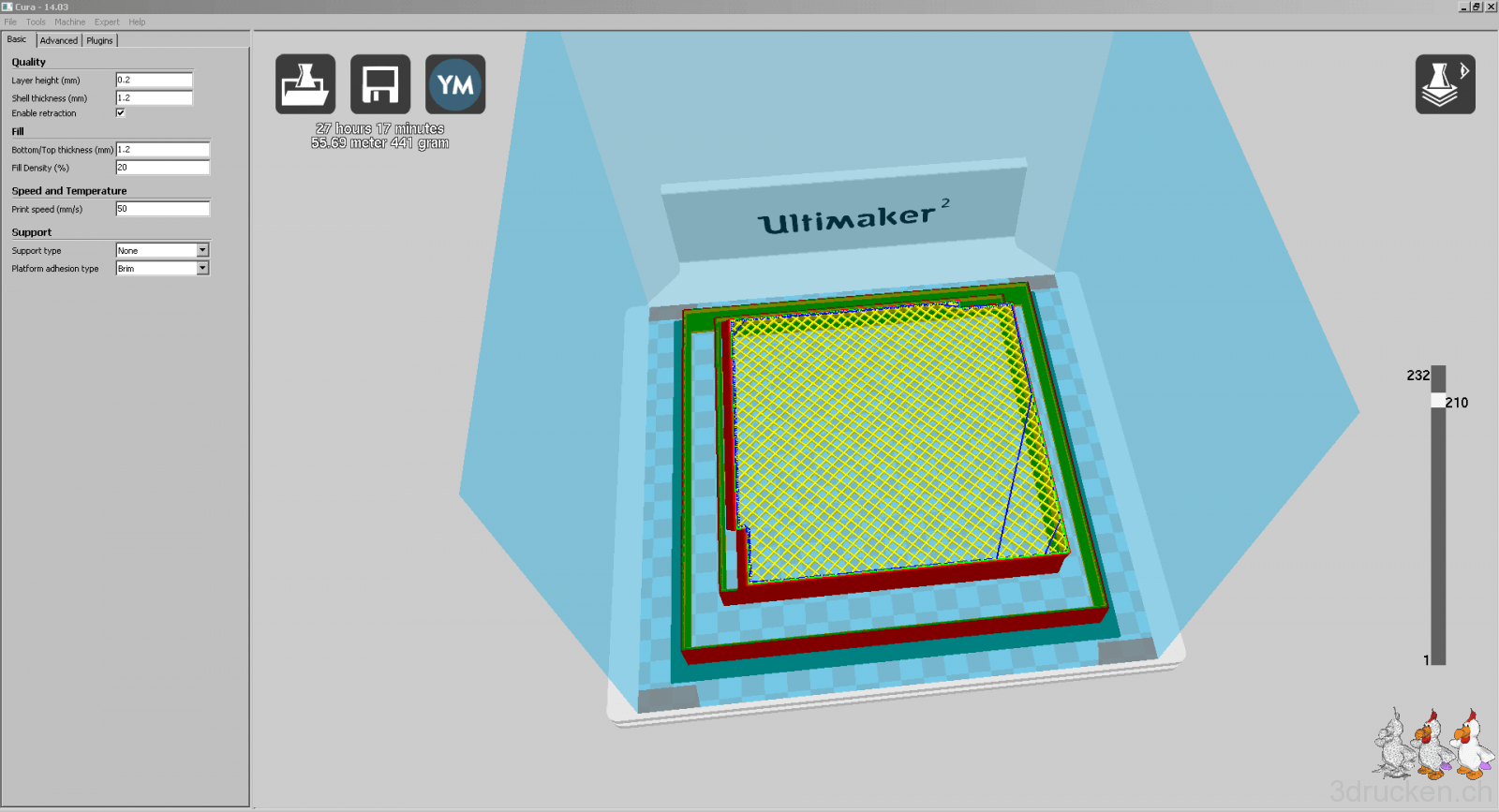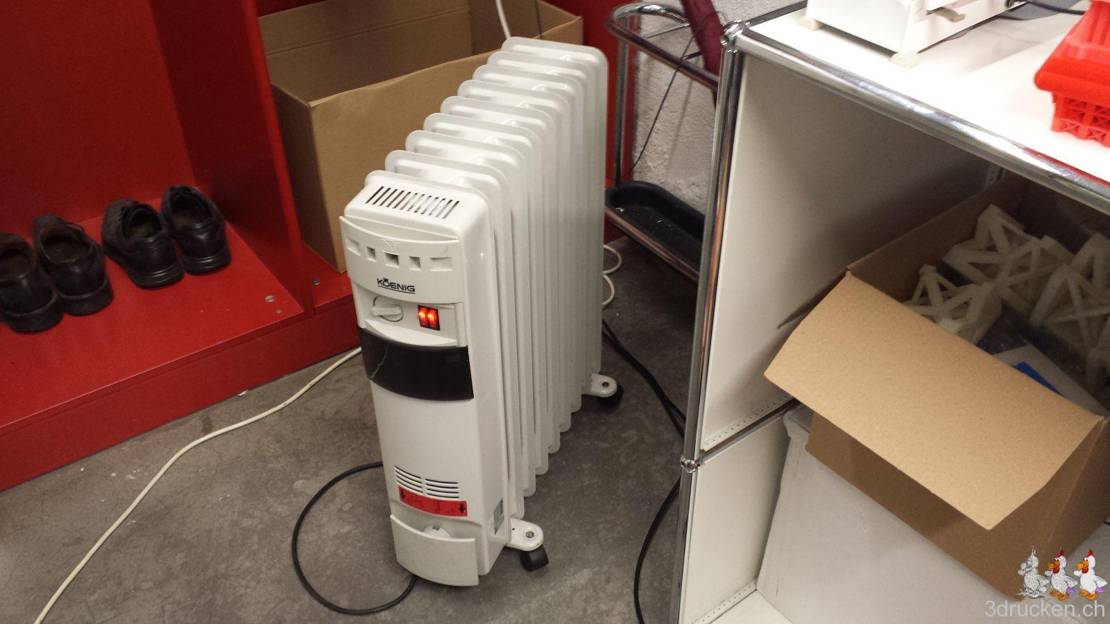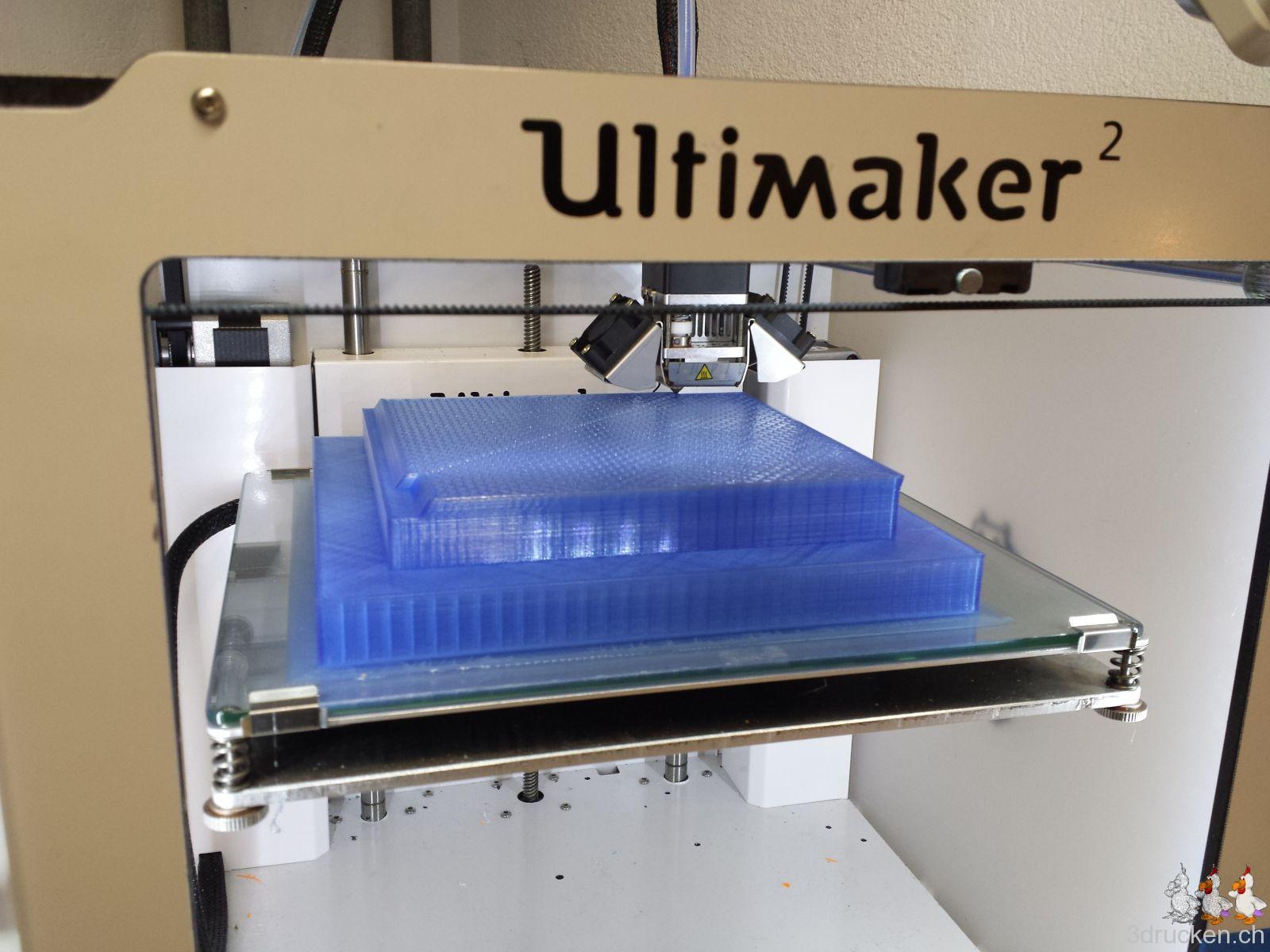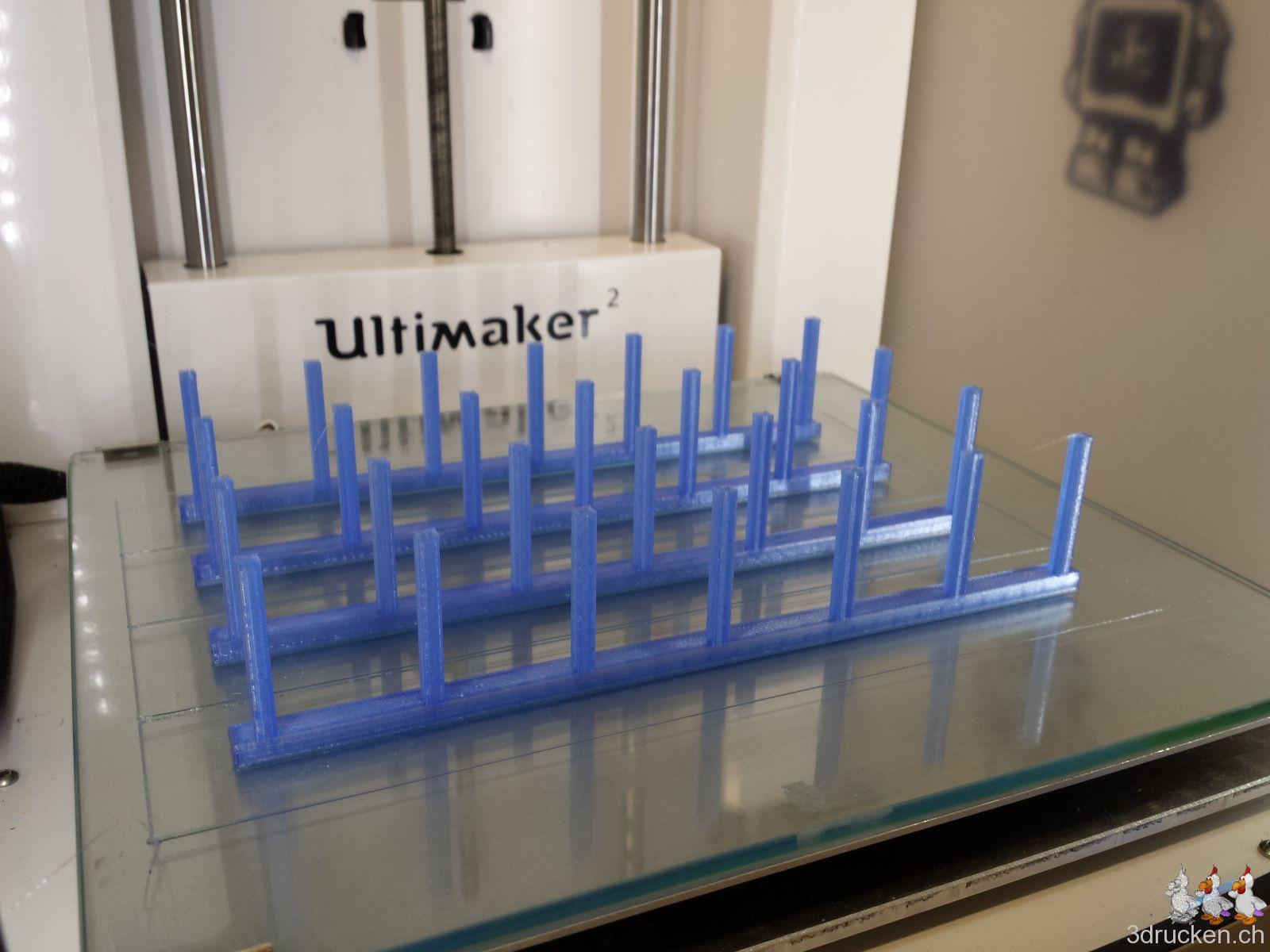 Gedruckt haben wir meistens bei 220° – 230° C, Tisch auf 80° C, mit zusätzlichem Ofen im Druckerraum, der sonst nicht beheizt ist. So gelang es uns, die Temperatur zwischen ca. 20 – 23° C zu halten und die Teile gut haftend auf dem Tisch zu halten, bis der Druck jeweils vorbei war. Für die Teile mit vielen Retractions haben wir die Einstellungen in Cura auf 0.2 mm (von 0.02 mm) Mindestlänge Vorschub vor dem nächsten Rückzug erhöht. Für die Haftung auf dem Drucktisch haben wir mit Haarspray und dem von Ultimaker mitgelieferten Leimstift experimentiert, und sind vom Haarspray zum Schluss wieder auf den Leim zurück gekommen. Der Leim lässt sich übrigens mit Wasser leicht wieder abwaschen.