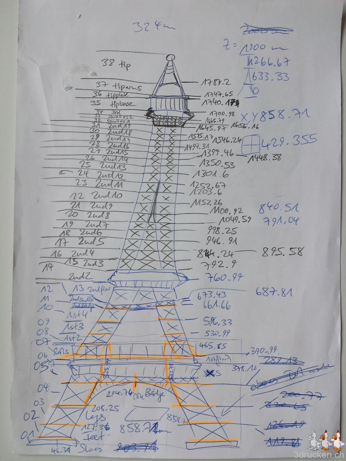 Im Mai 2014 haben wir damit begonnen, das tolle Modell des Eiffelturms so zu vergrössern und mit netfabb Basic zu schneiden, dass einer der vier Füsse gerade so auf dem Drucktisch des Ultimaker 2 Platz findet. Auf Papier haben wir uns fortlaufend eine Übersicht der einzelnen Teile gemacht, und dazu die Höhe des Schnittes vermerkt. Damals liessen wir noch offen, ob wir den Turm auch wirklich drucken. Mit dem Drucken haben wir begonnen, bevor alle Teile des Modells geschnitten waren. Als es komplexer wurde, und wir noch Druckparameter notieren wollten, haben wir zusätzlich zum Papier eine Tabelle auf Google Drive eingerichtet. So konnten wir dann auch den Fortschritt bei der Produktion festhalten, und den Vorrat an Druckmaterial aktuell ermitteln.
