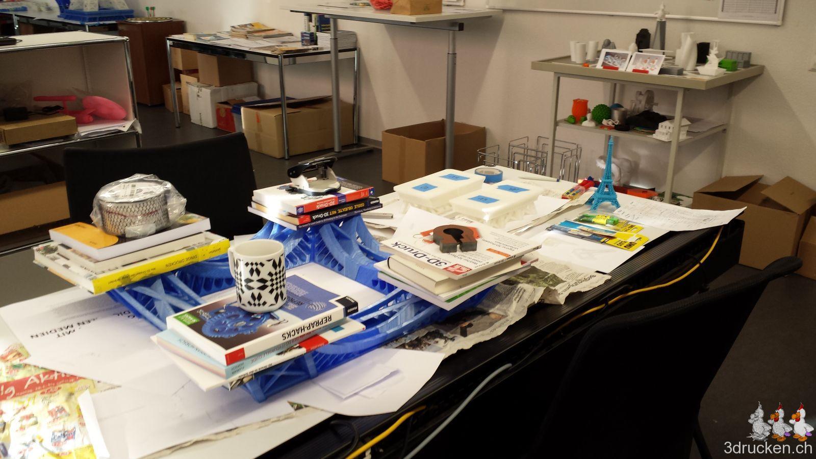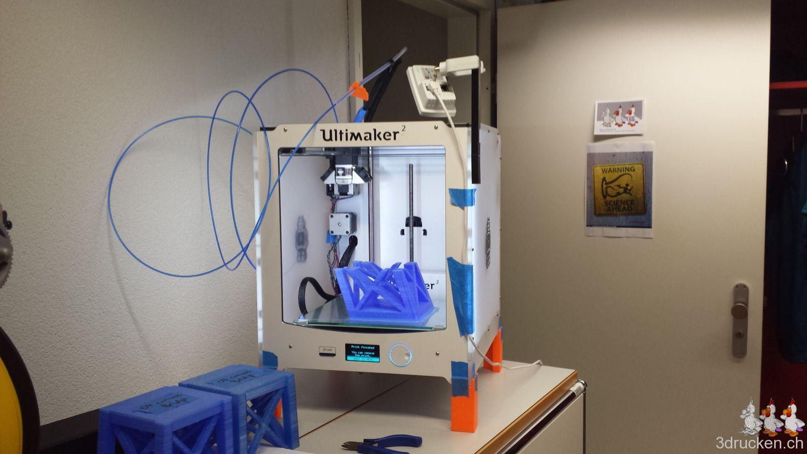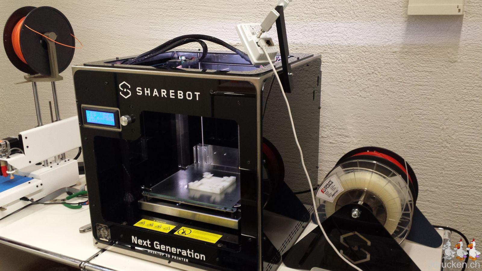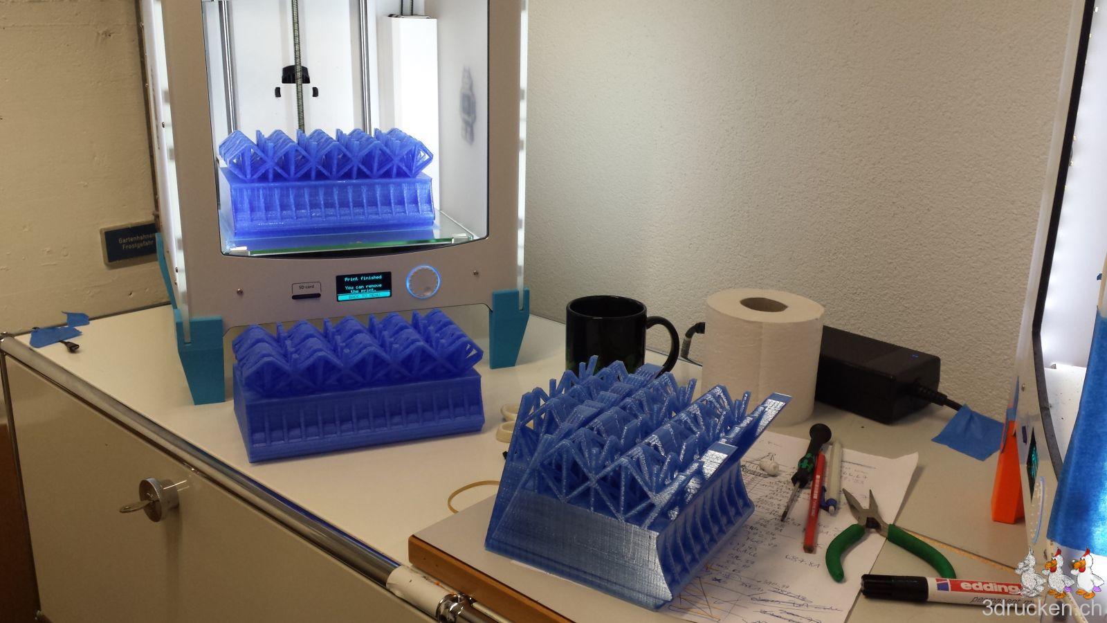 Die beiden Ultimaker 2 fielen im Sommer, als es heiss war, für längere Zeit aus, und nach mehrmaligem Wechseln der Düse druckte der eine mit der Originaldüse weiter, den anderen haben wir mit einer alternativen Düse von FiberOptic wieder in Betrieb nehmen können. Den Sharebot NG haben wir von der Firma coobx zum Testen für längere Zeit zur Verfügung gestellt bekommen. Das weisse (transparente) und rote Druckmaterial funktionierte zum Glück auch besser als das Blaue.