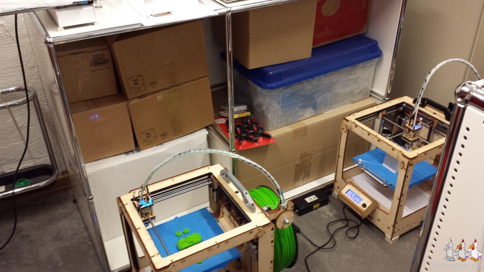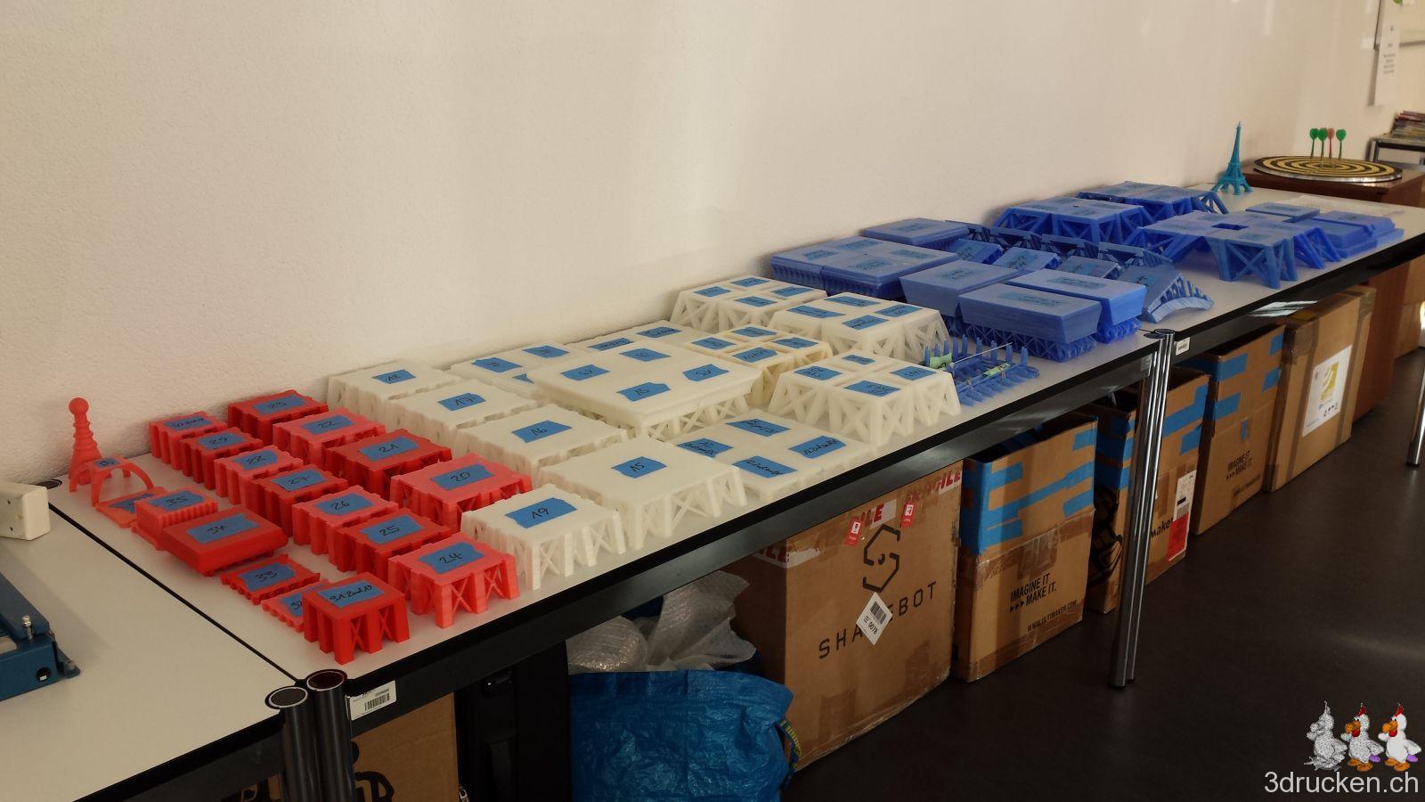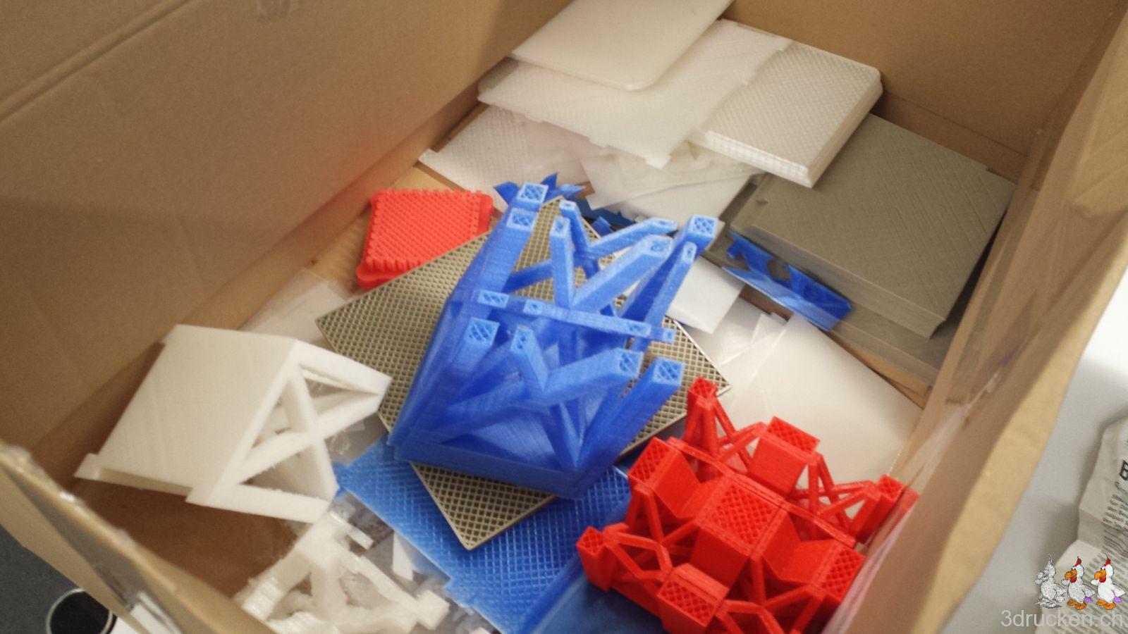 Die 100 Teile haben wir von 20.5.2014 bis 19.12.2014, also über 7 Monate verteilt gedruckt und fein säuberlich in Kisten aufbewahrt, nachdem bei der offenen Lagerung ein grosses Teil beschädigt wurde und nachgedruckt werden musste. Verwendet haben wir zu Beginn einen, dann zwei Ultimaker 2, und zum Schluss noch einen Sharebot NG dazu.