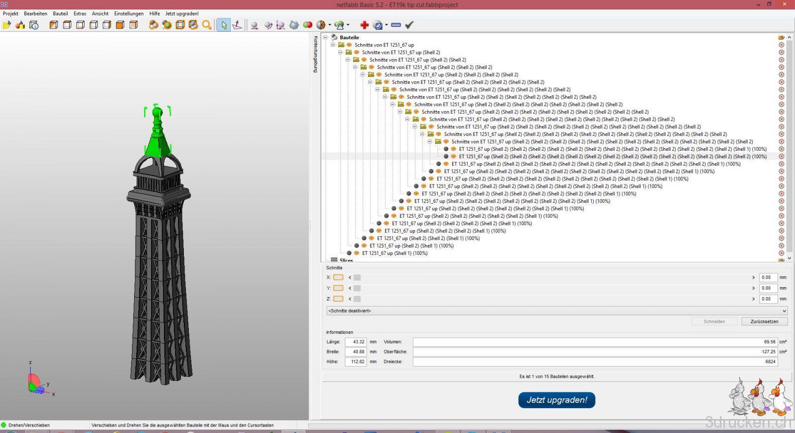 - Schnitte müssen genau sein -> mussten mehrmals nach Verifizieren neu Schneiden, leider kann netfabb keinen Schnitt rückgängig machen, so mussten wir vor jedem Schnitt eine neue Projektdatei zwischenspeichern. Nach ein paar Schnitten konnte Netfabb keine neuen Teile mehr schneiden, bzw. exportieren. Also haben wir einen Teil des Turms aus der Projektdatei weggelöscht, um den Rest dann weiter schneiden zu können.