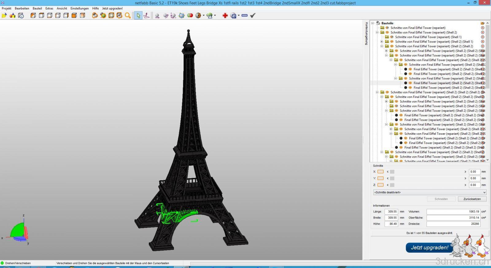 Durch geschicktes Schneiden und Wenden gelang es uns, alle Teile ohne Support zu drucken, die meisten Teile in 0.2 mm Schichten, ganz oben wo es fein wurde, in 0.1 mm Schichten. 1.2 mm Schells,1.2 mm Top / Bottom und 20% Füllung sollten den Turm stabil und standfest machen. Raft wurde keines verwendet, und bei den meisten Teilen entgegen unserer ersten Erwartung auch kein Brim. Ein Brim hat die unangenehme Eigenschaft, dass diese zusätzlich gedruckten Loops zum Schluss wieder vom Objekt weggeschnitten werden müssen, was zu unsauberen Kanten führen kann. Einzelne Teile erst in netfabb geschnitten, und dann in Tinkercad erneut, um Brückenteile zu erhalten, da dort schräg geschnitten werden sollte, und dies in netfabb nur geht, wenn man das Modell dreht. Auch die Geländer haben wir in Tinkercad geschnitten.