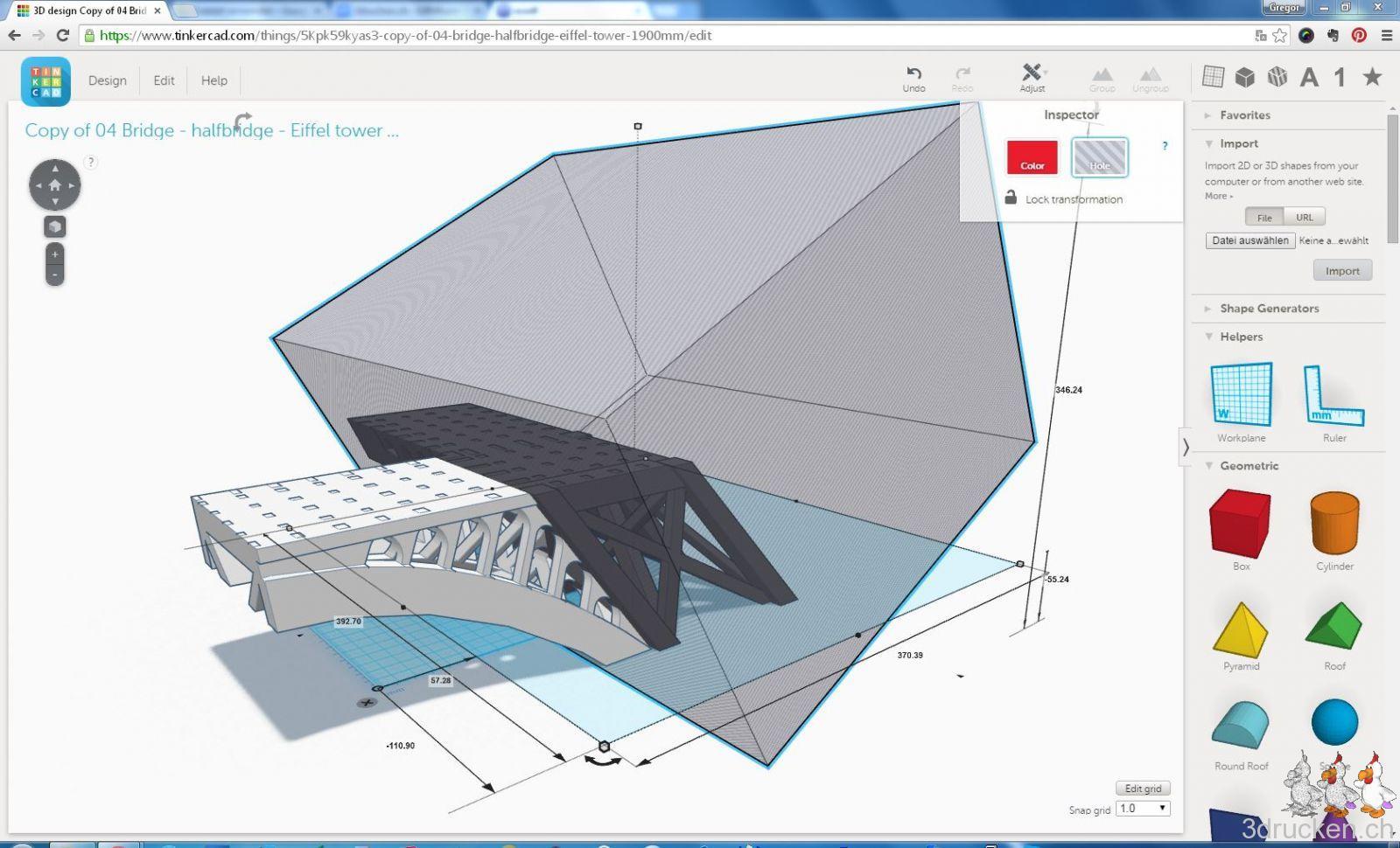 Mit der Montage haben wir bei den Füssen begonnen, da war es noch einfach. Weiter oben dann, beim Brückenteil und bei der Montage der Beine an die zweite Etage, wurde es schwieriger, und wir mussten die Sache mehrmals erst genau durchspielen, um dann beim Leim keine Zeit zu verschenken. Die Brücken haben wir mit dem stärkeren Leim UHU PLUS 300 ENDFEST zusammengefügt, da wir den Schnitt genau in der Mitte der Brücke nicht optimal gewählt haben. Nun sollte die Sache aber halten. Ganz zum Schluss haben wir die grossen Elemente der ersten Etage auf die Brückensektion geklebt, und ganz zum Schluss die Geländer montiert, für welche wir in Tinkercad kleine Teile zur Fixierung erstellt haben.