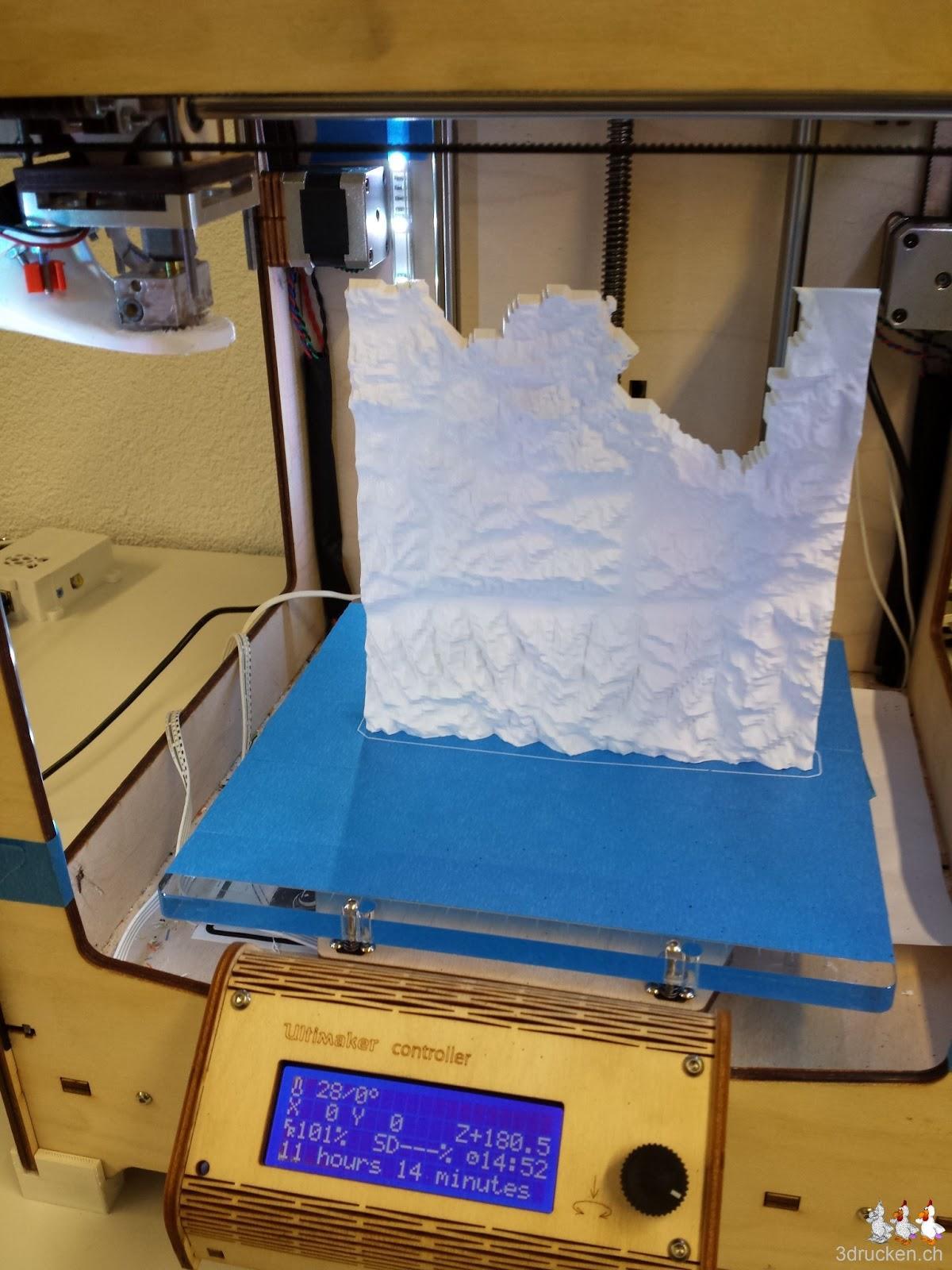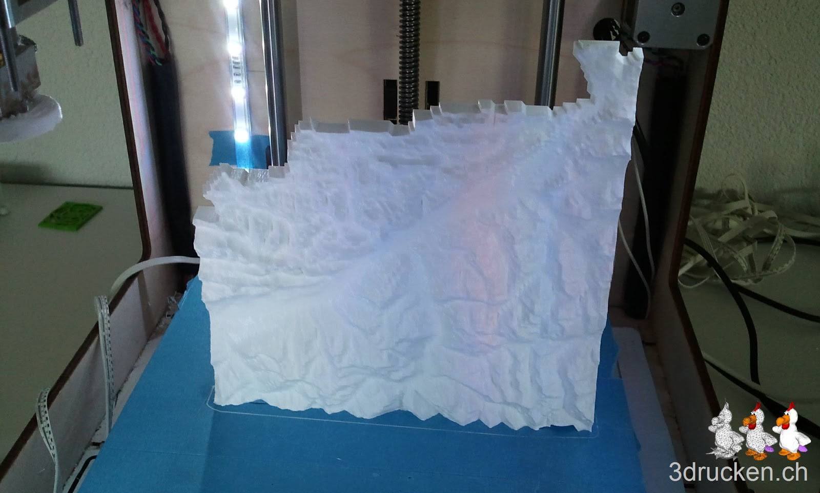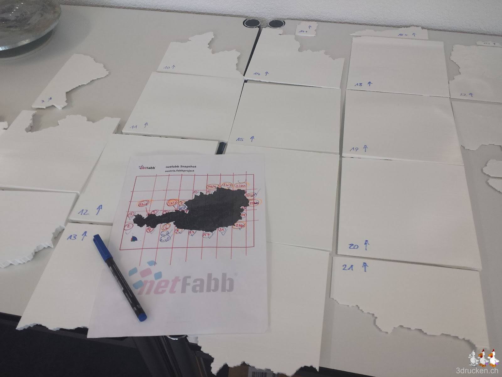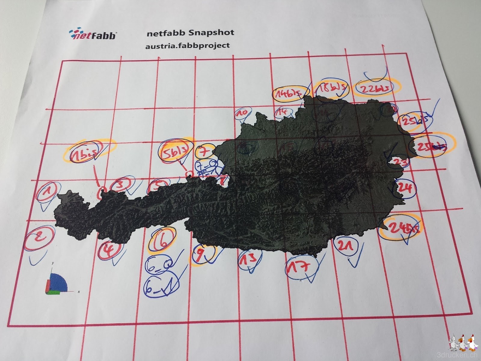 Wir haben dazu den selben einprägsamen Massstab 1:387’111 verwendet, in welchem wir auch schon das 90 cm breite Relief der Schweiz angefertigt hatten. Für Österreich ergibt das dann 30 Teile und 148.5 cm Breite. Die Satellitendaten stammen von viewfinderpanoramas.org. Wir schätzen die Druckzeit auf 200-250 h verteilt auf zwei Monate. Bis auf eine Ausnahme wurden die Einzelteile stehend gedruckt. Nun bleibt uns noch die Teile zusammen zu setzen, und einen geeigneten Platz zum Aufhängen zu suchen. Auf der Rückseite haben wir die Teile mit den selben Nummern versehen, wie auf dem Druckplan (A4 Blatt auf dem Foto als Grössenvergleich).
