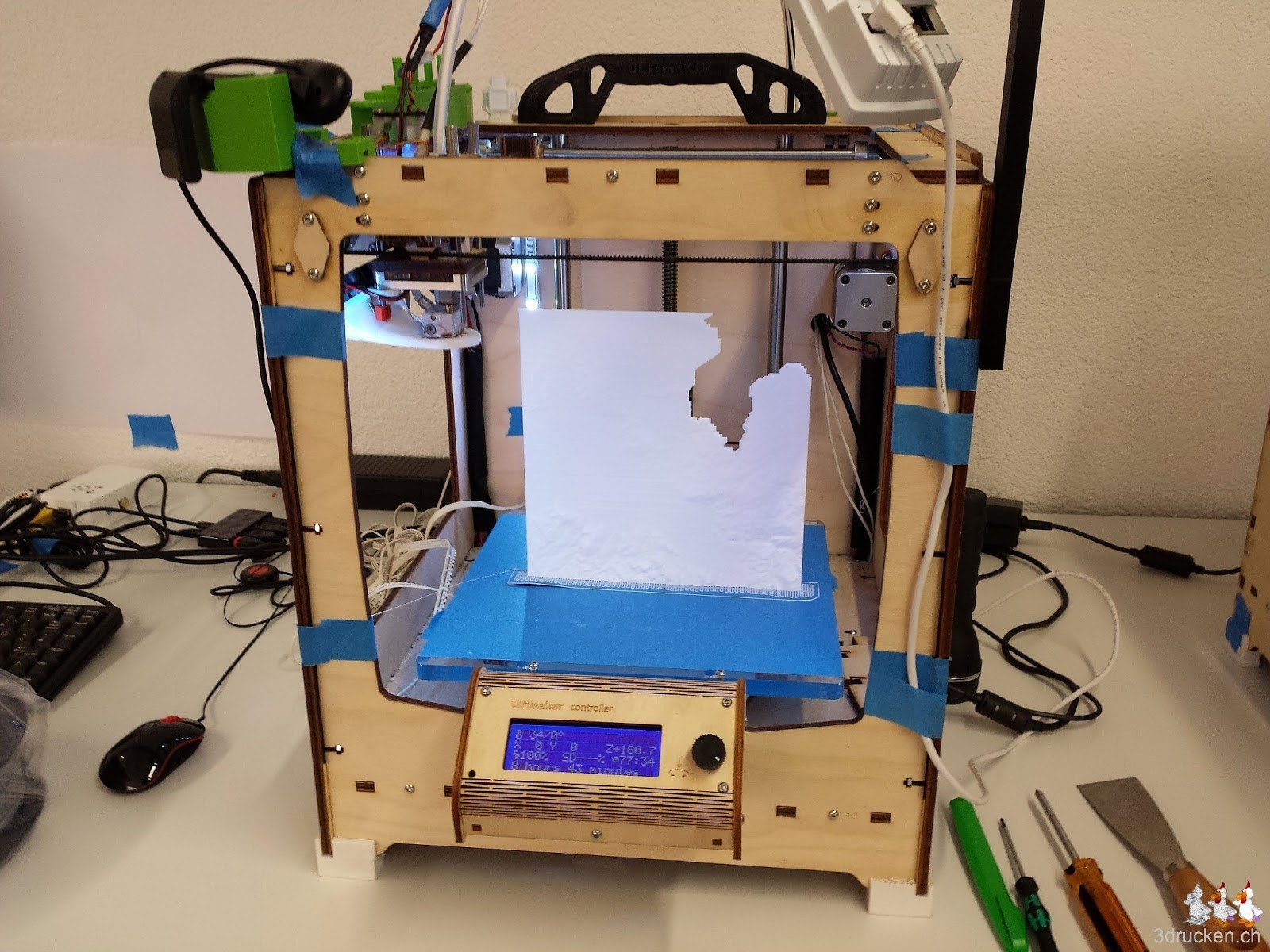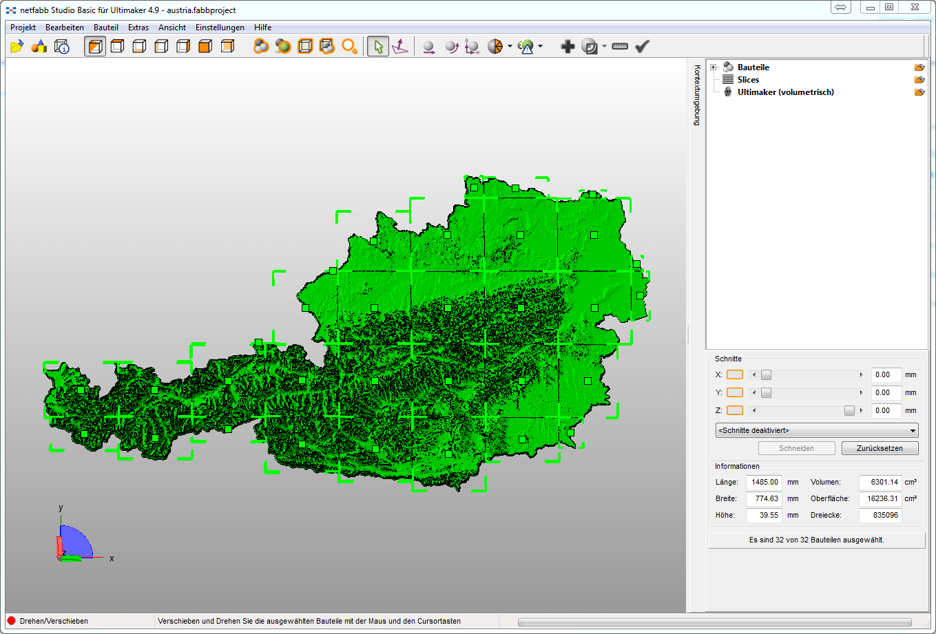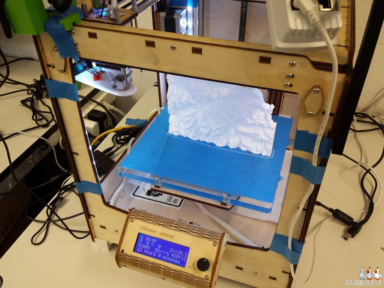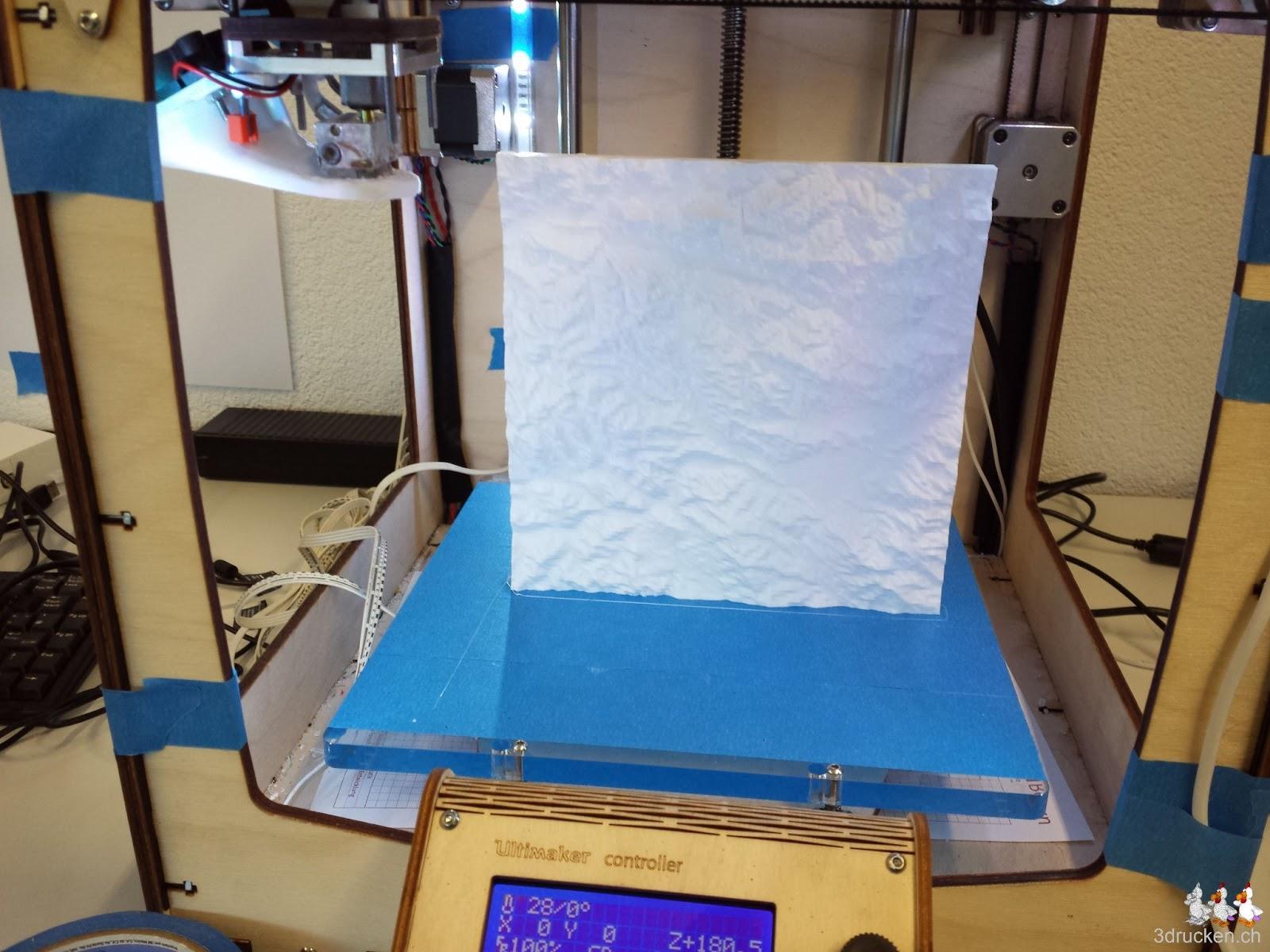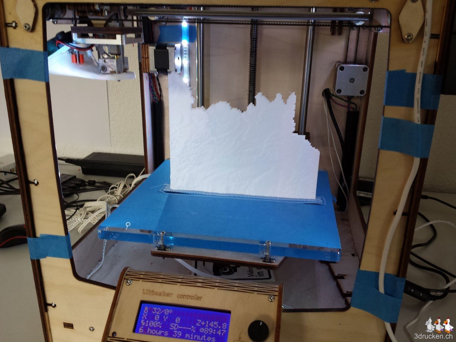 Wir haben dazu den selben einprägsamen Massstab 1:387’111 verwendet, in welchem wir auch schon das 90 cm breite Relief der Schweiz angefertigt hatten. Für Österreich ergibt das dann 30 Teile und 148.5 cm Breite. Die Satellitendaten stammen von viewfinderpanoramas.org. Wir schätzen die Druckzeit auf 200-250 h verteilt auf zwei Monate. Bis auf eine Ausnahme wurden die Einzelteile stehend gedruckt. Nun bleibt uns noch die Teile zusammen zu setzen, und einen geeigneten Platz zum Aufhängen zu suchen. Auf der Rückseite haben wir die Teile mit den selben Nummern versehen, wie auf dem Druckplan (A4 Blatt auf dem Foto als Grössenvergleich).
