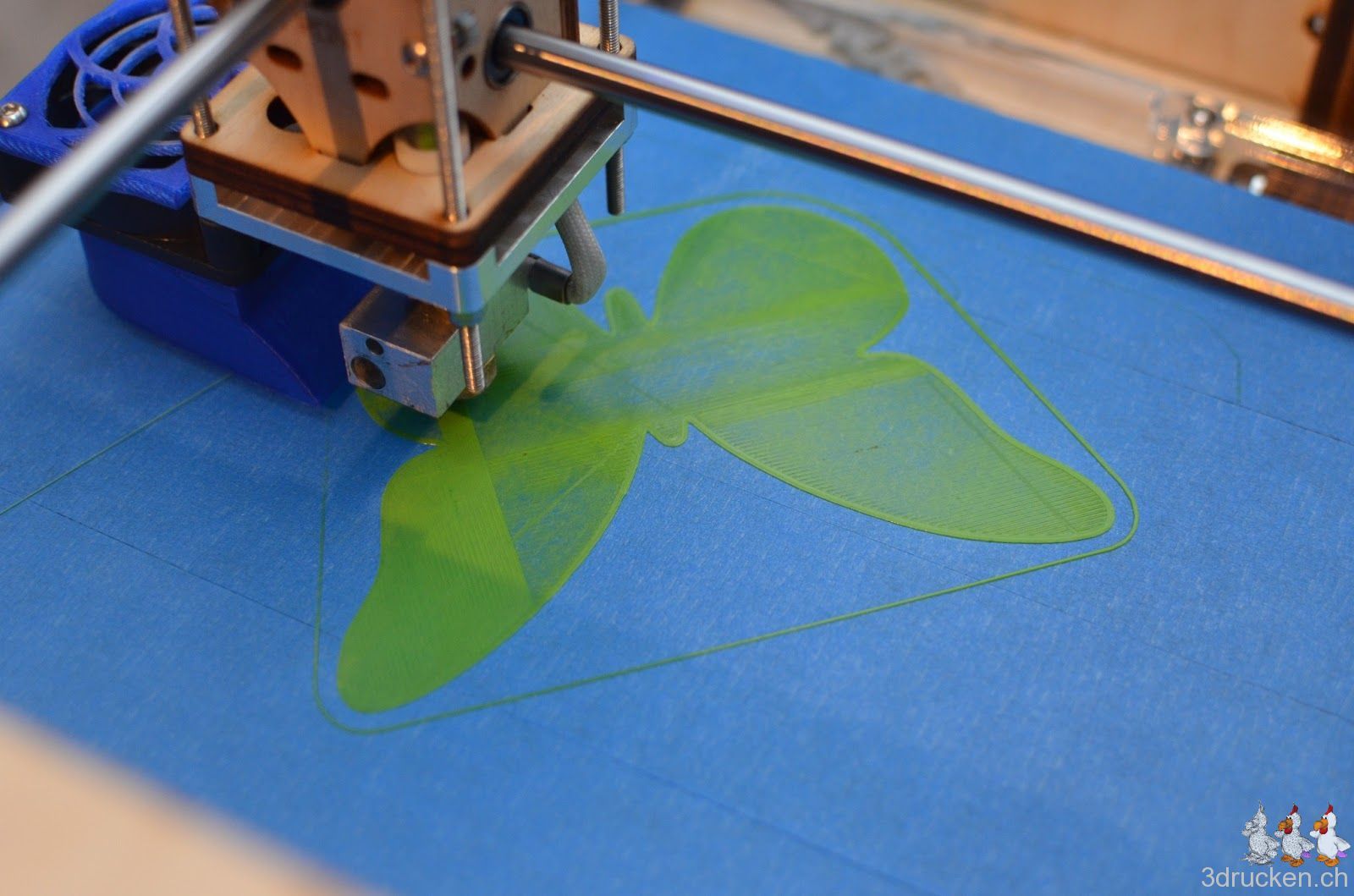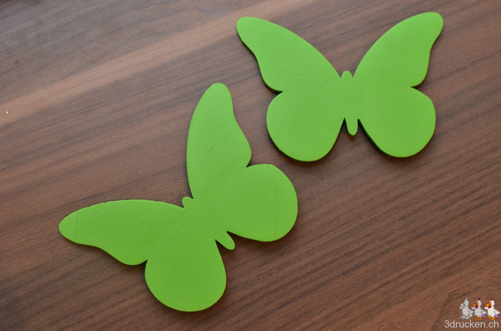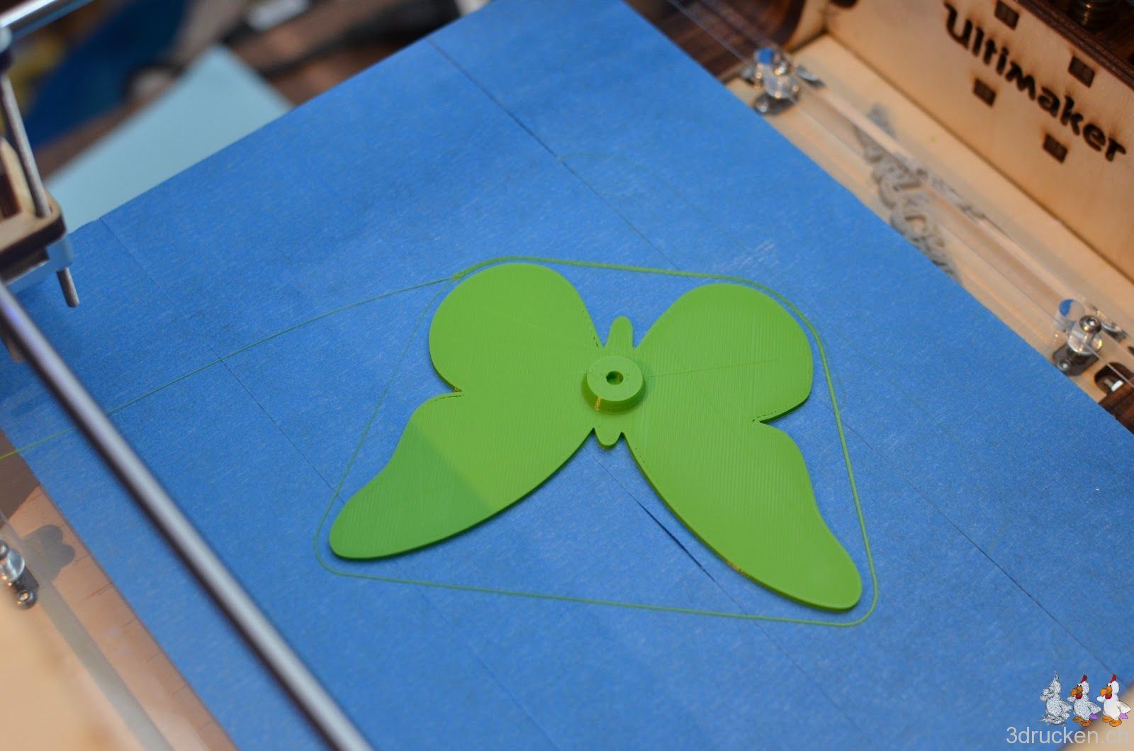 Der Frühling lässt schon grüssen, zumindest vom 3D-Drucker aus. Den Schmetterling haben wir mit 0.1 mm Schichten in Cura 13.01 geslicet und bei 215° C auf dem zweiten Ultimaker aus grünem Ultimaker-PLA gedruckt.