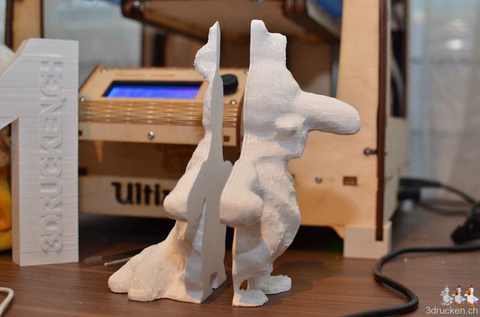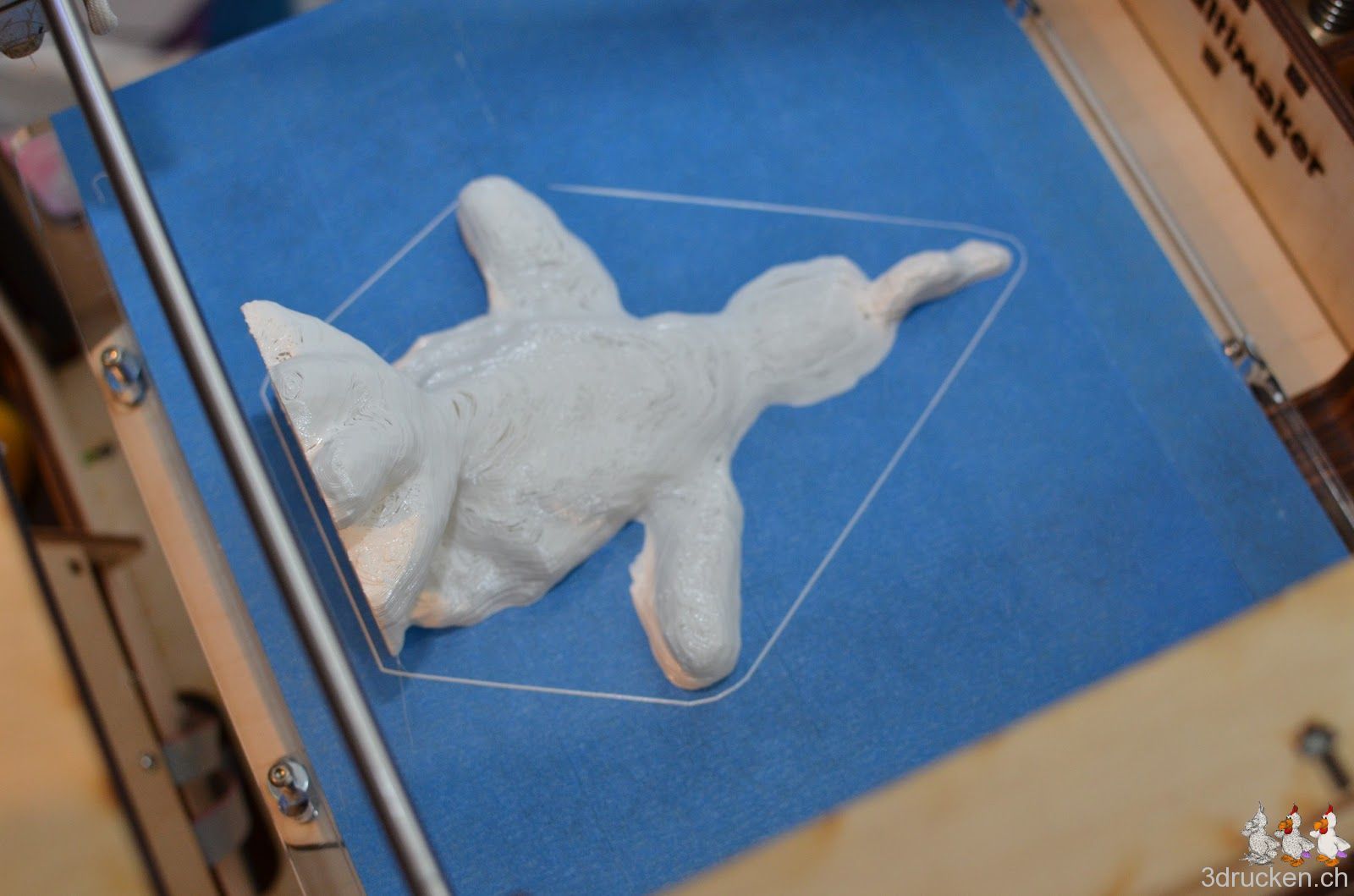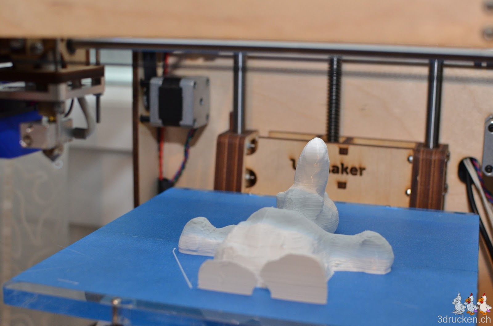 Das wollten wir schon lange tun, den Güggel in zwei Hälften schneiden, und flach auf den Drucktisch gelegt ausdrucken. So entstand der 165 mm hohe Güggel in 5 h ohne Support, 0 % Füllung und 0.2 mm Schichten. Bleibt noch das Zusammenkleben.