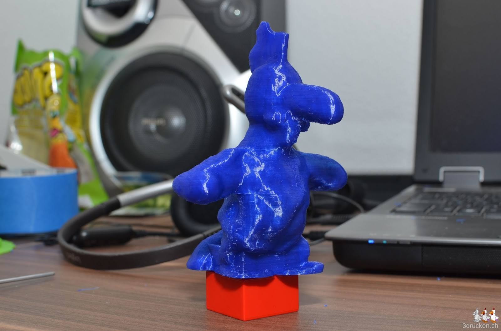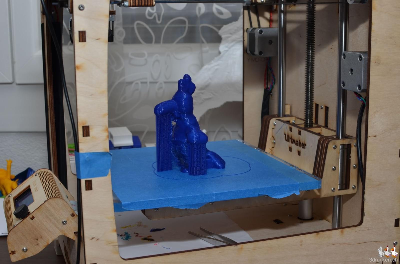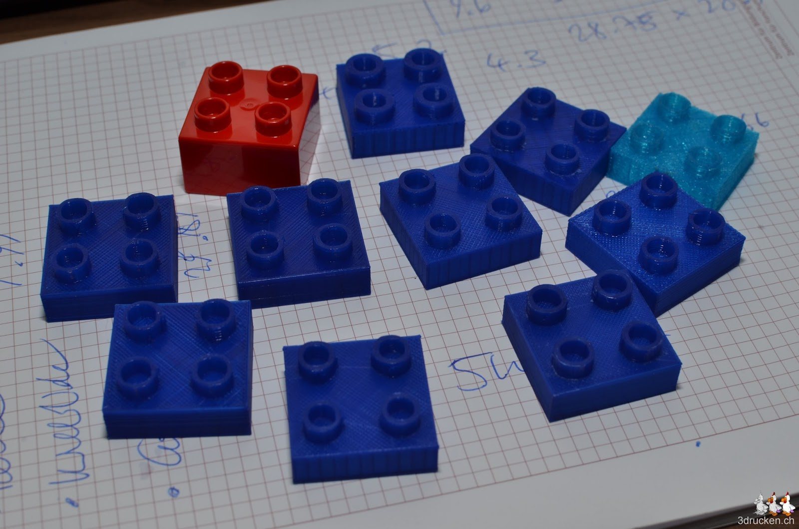 Wir brauchten einige Tests, um Duplos originalgetreu nachzudrucken. Bis zum Schluss ist uns das nicht genügend gut gelungen. Die von uns gedruckten Steine halten zwar auf oder unter dem Original, untereinander lassen sie sich aber nicht so stapeln, dass sie halten. Um einen Güggel mit Duplo Steckfuss für Amélie zu drucken hat es aber dann doch gereicht. Unserer ersten Version fehlt zwar die Möglichkeit flach auf einer Platte zu sitzen, Güggel sitzen aber bekanntlich eh etwas erhöht.
