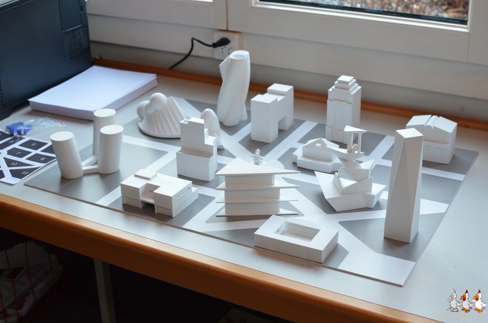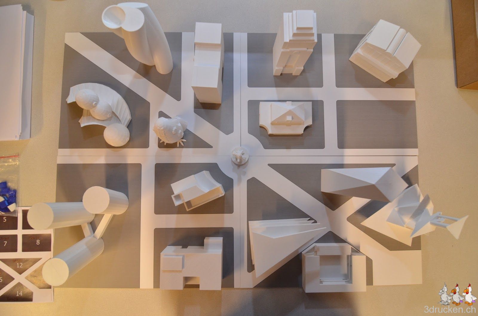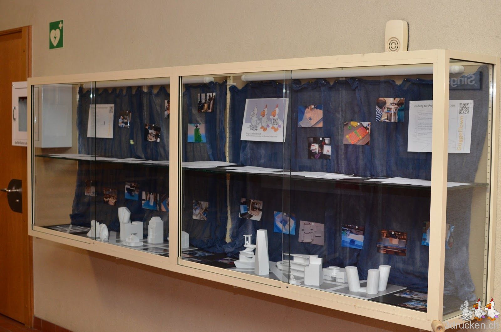 So, das war heute die letzte Veranstaltung des Kurses, alles ist bereit für die grosse Schlusspräsentation am nächsten Freitag. Wir haben heute den Schülerinnen und Schülern 10 gedruckte Gebäude mitgebracht, die Freude war gross. Die Posten für die Präsentation sind vorbereitet, die SuS hatten heute fast eine Stunde Zeit, um das Vorgehen auszuprobieren und abzusprechen. GüggelTown selber befindet sich in einer grossen Vitrine im Oberstufenschulhaus Zulg, wo sie zunächst Werbung für nächste Woche macht, und danach für einen Monat Neugierigen zur Ansicht bereitsteht.