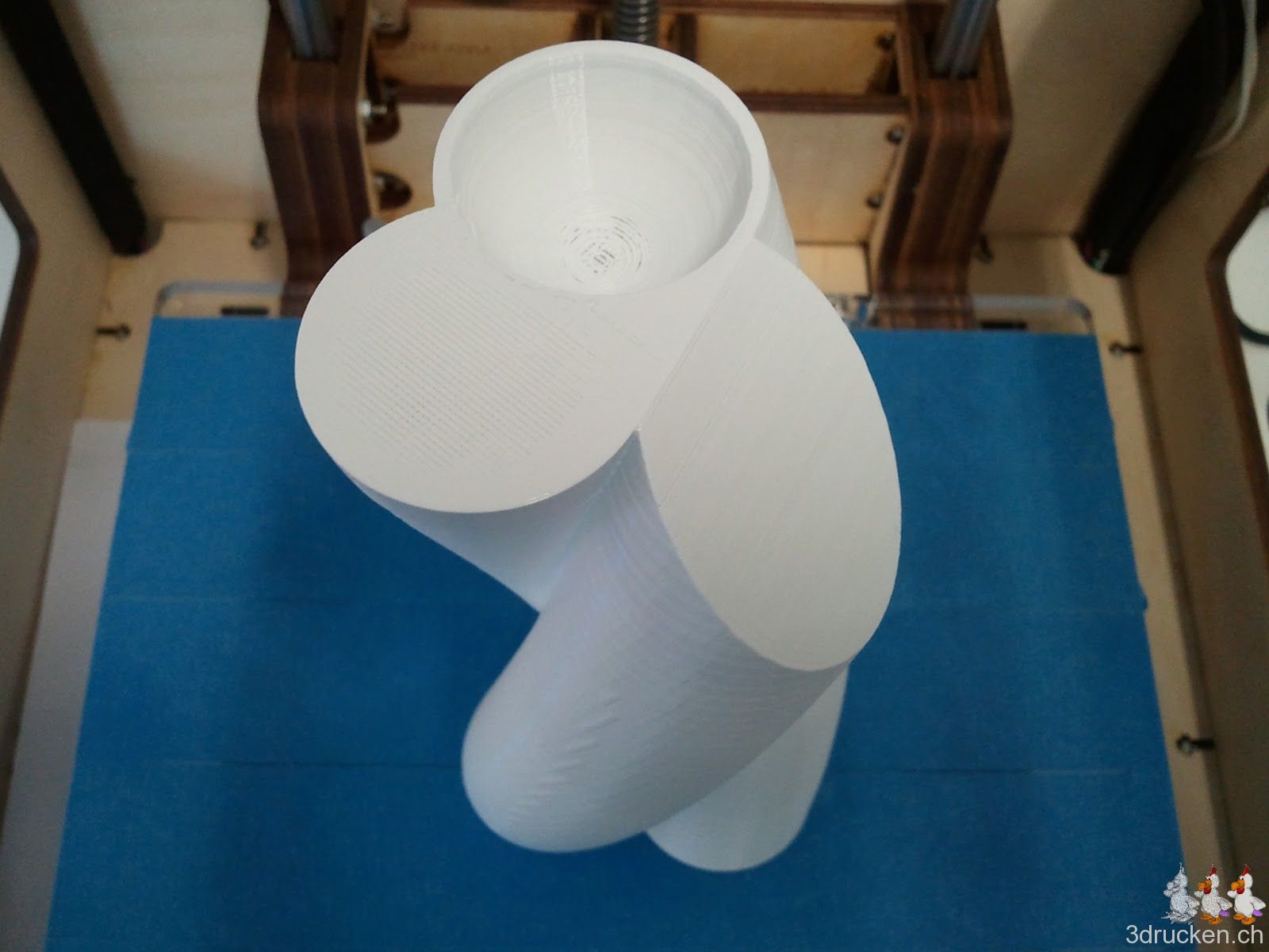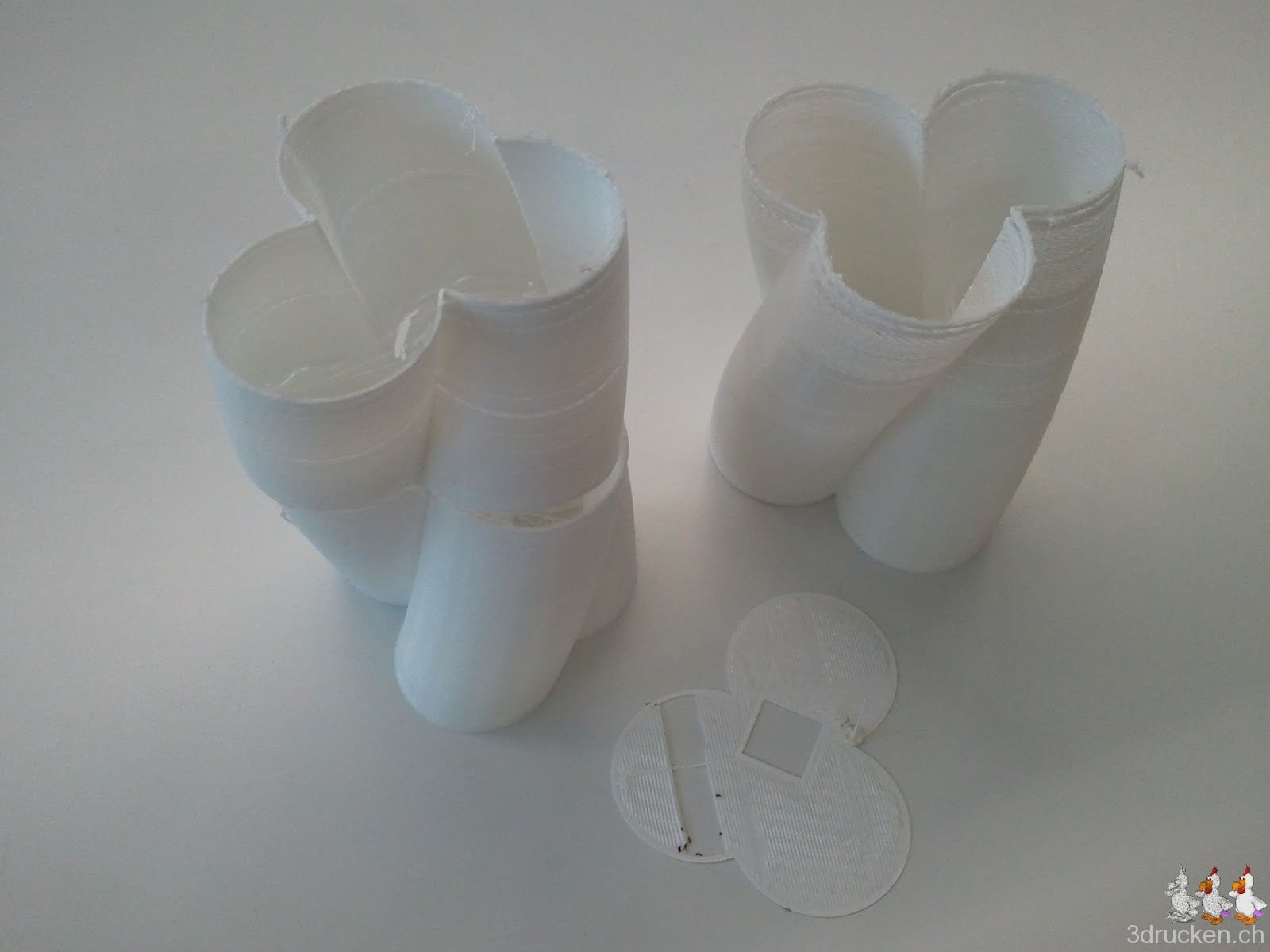 Nachdem wir 2 Fehldrucke auf dem ersten Ultimaker hatten, gaben wir dem Nachwuchsdrucker eine Chance und siehe da, der druckte den TorqueTower für Parzelle 1 von GüggelTown im zweiten Anlauf richtig schön. Geslicet mit Cura 12.12A in 0.2 mm Schichten, 0 % Füllung, ohne Support, mit 1 mm Deckschichten. Druckzeit 3 h 05 min.