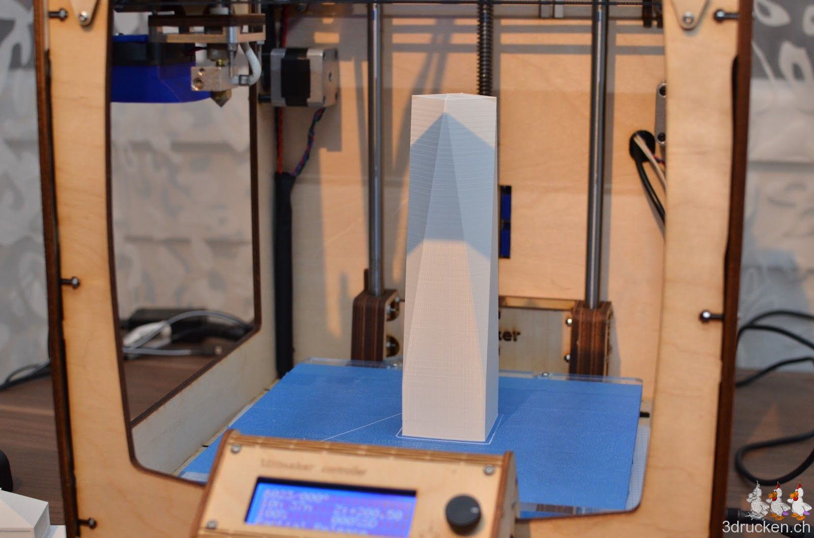 Diesmal im zweiten Versuch, da beim ersten leider der Drucktisch nicht ganz optimal ausgerichtet war. Bei diesem Druck war das besonders wichtig, ist das Gebäude doch mit 20 cm maximal hoch, bei nur 5 x 5 cm Grundfläche. Mit der guten Haftung auf dem Drucktisch wollten wir besonders den Verzug der Ecken vermeiden, damit das Gebäude möglichst selbständig stehen kann. Mit Cura 12.12A geslicet, bei 200° C und 50 mm/s in 0.2 mm Schichten aus weissem RepRap-PLA gedruckt. 5 % Füllung, kein Support, mit Rückzug, 1 mm Deckschichten. Druckzeit 5 h.