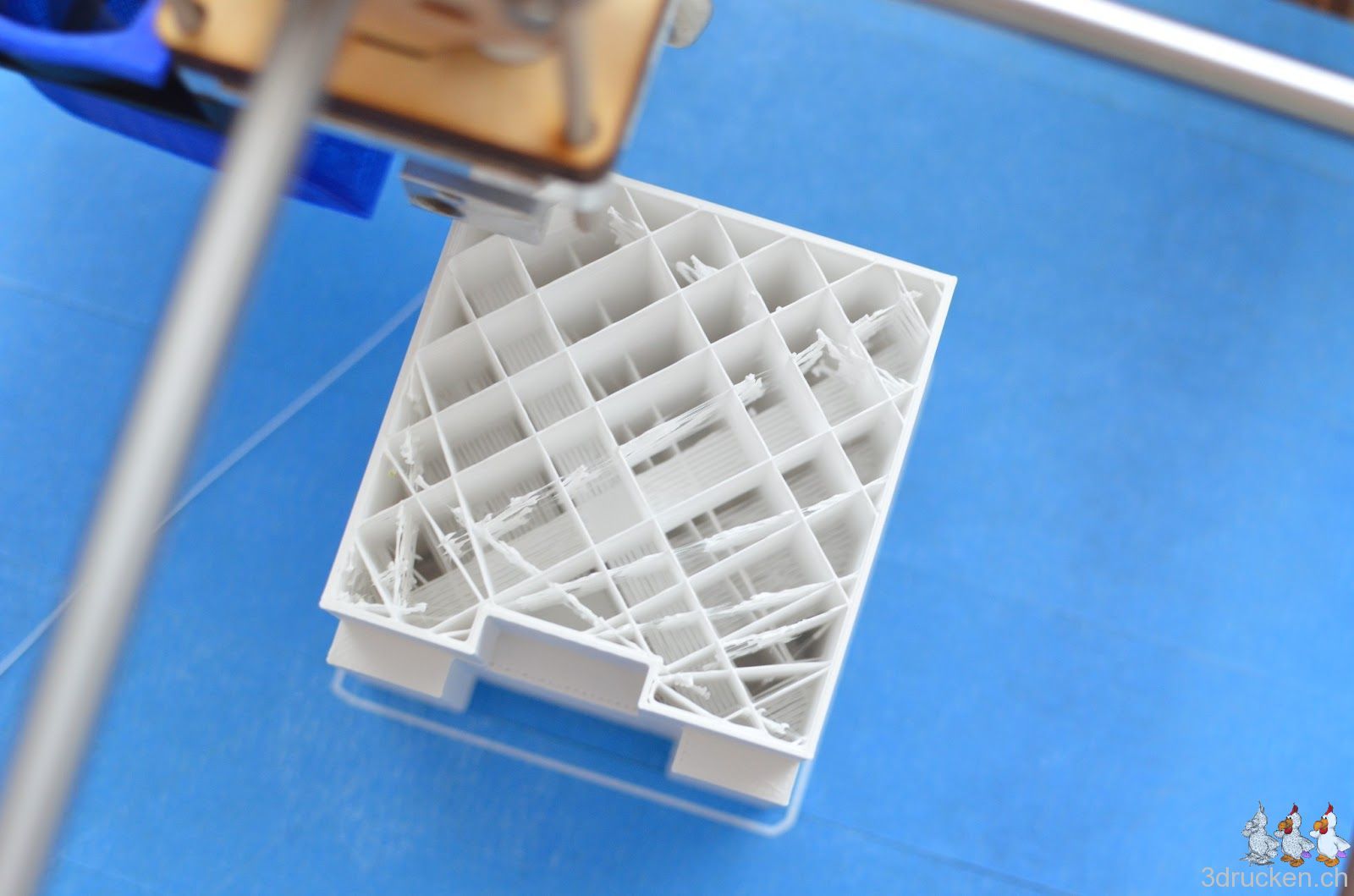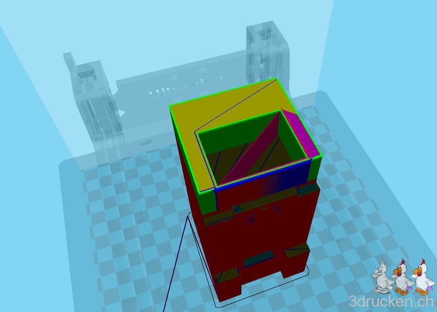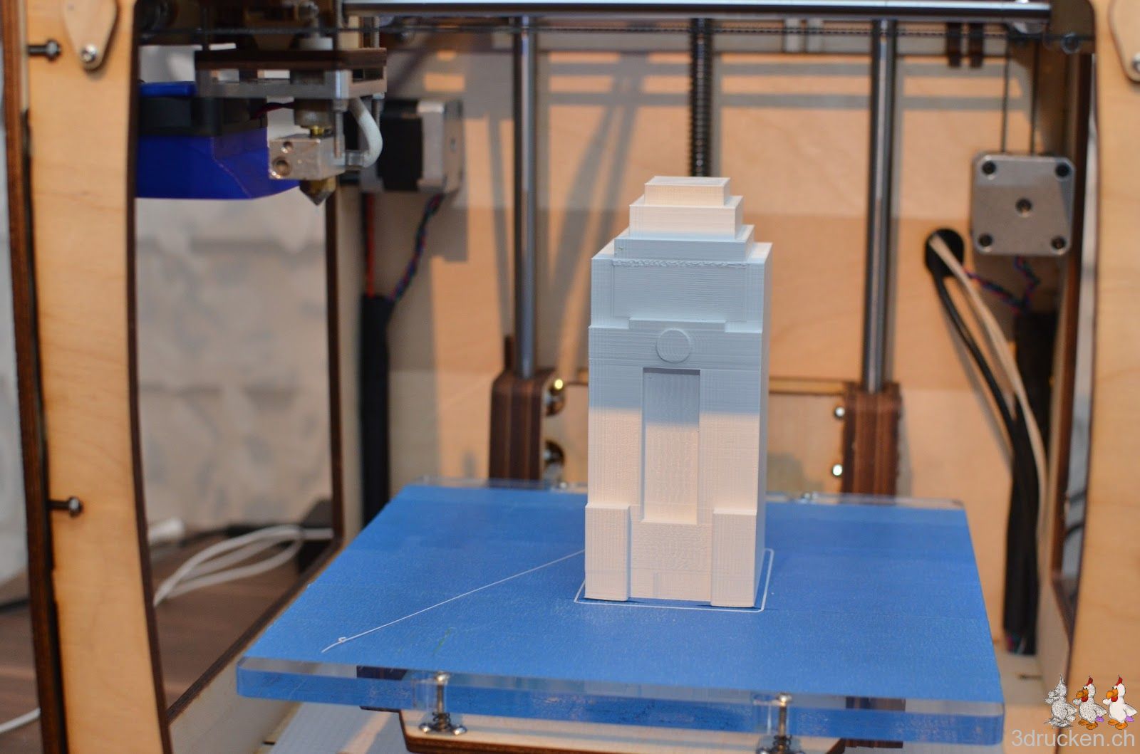 Trotz eines grösseren versteckten Hohlraums im oberen Bereich des Gebäudes, gelang der Druck des Gebäudes von Parzelle 5 beim ersten Versuch. Mit Cura 12.12A geslicet, bei 200° C und 50 mm/s in 0.2 mm Schichten aus weissem RepRap-PLA gedruckt. 5 % Füllung, kein Support, mit Rückzug, 1 mm Deckschichten. Druckzeit 8 h 45 min.