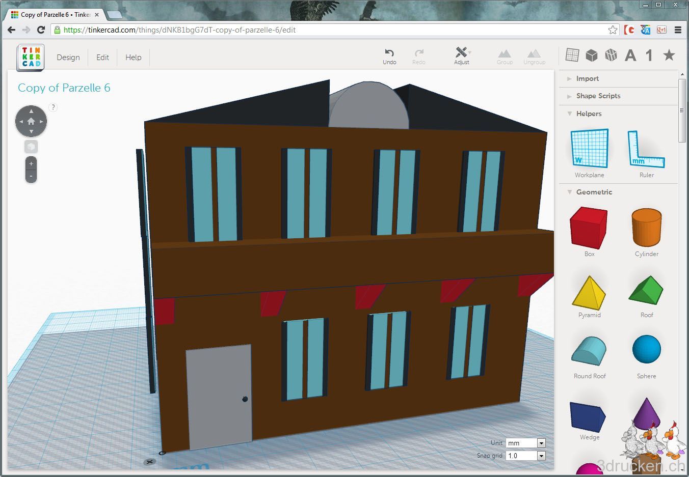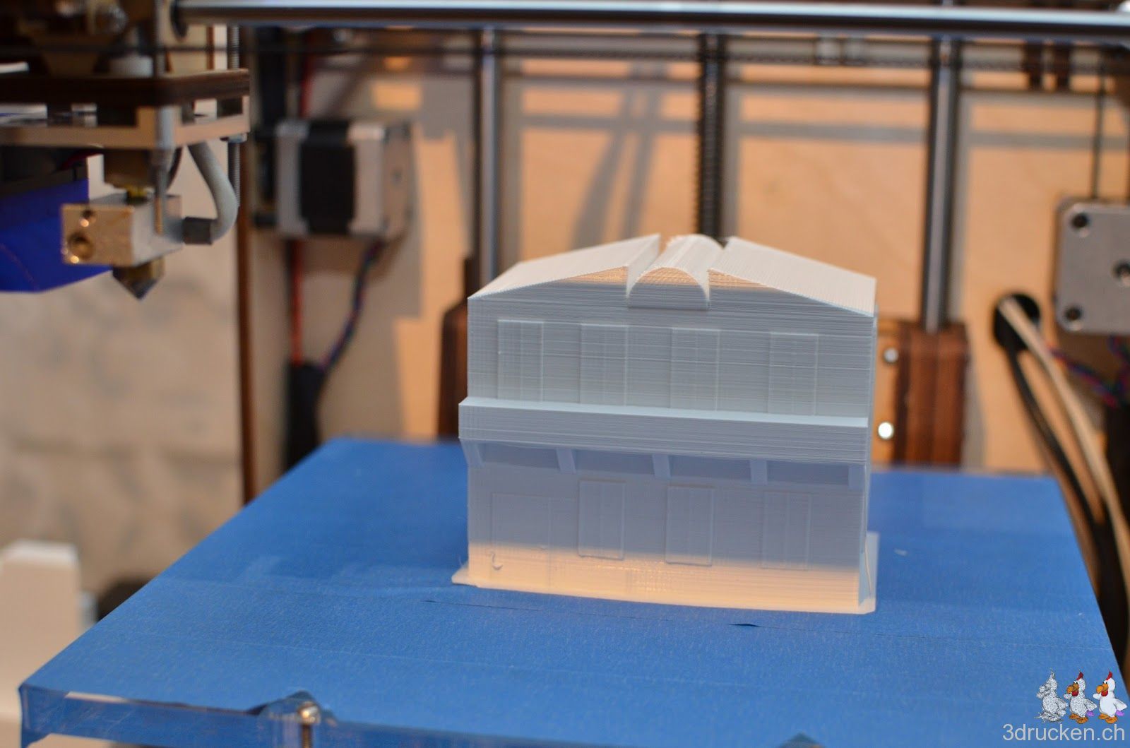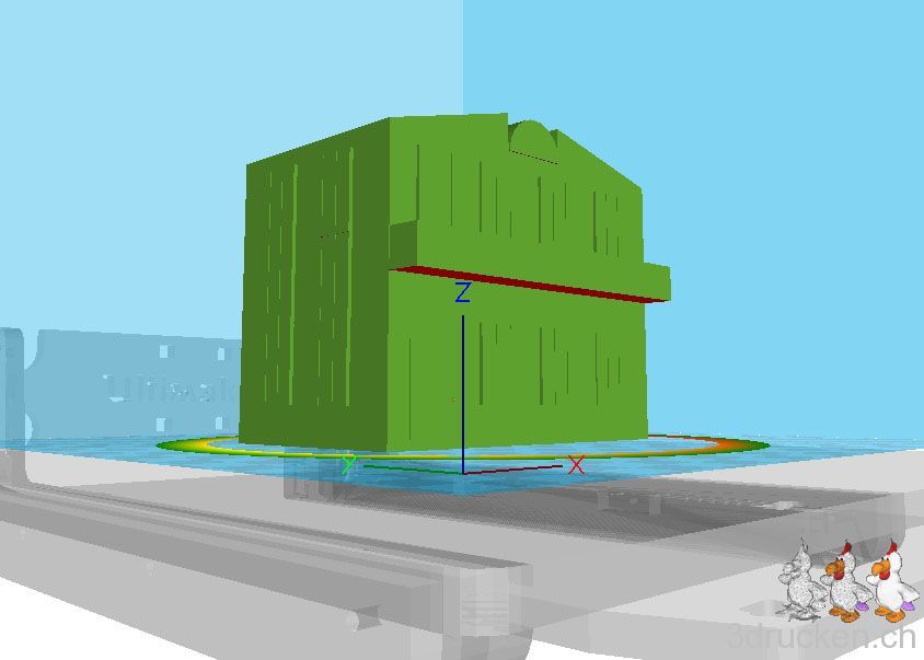 Im ersten Anlauf, allerdings nach Anpassung der Frontpartie durch Hinzufügen von 5 tragenden Winkelelementen von 45° direkt in Tinkercad. Gedruckt auf dem zweiten Ultimaker zuhause in ca. 9 h. Settings ansonsten identisch mit den anderen Gebäuden. Leider erst nach dem Druck haben wir festgestellt, dass auf der, von vorne gesehen linken Seite, die Fenster alle nicht genau am Haus anliegend waren. Der Ultimaker hat die Fenster zwar gedruckt, wir mussten sie aber mit doppelseitigem Klebeband ankleben, mit Sekundenkleber wollten sie nicht halten.
