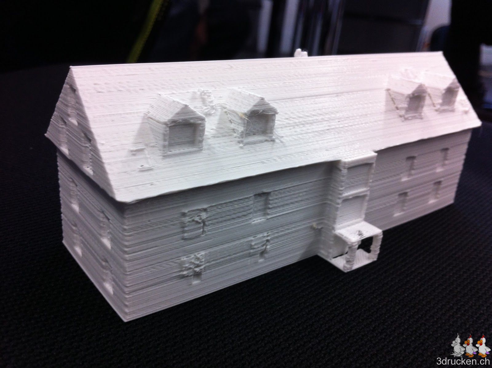 Gestern Abend starteten wir noch den „richtigen“ Druck vom Hausmodell. Diesmal wählten wir als Temperatur 215° C. Nach 11 Stunden und 35 Minuten war der Druck beendet.