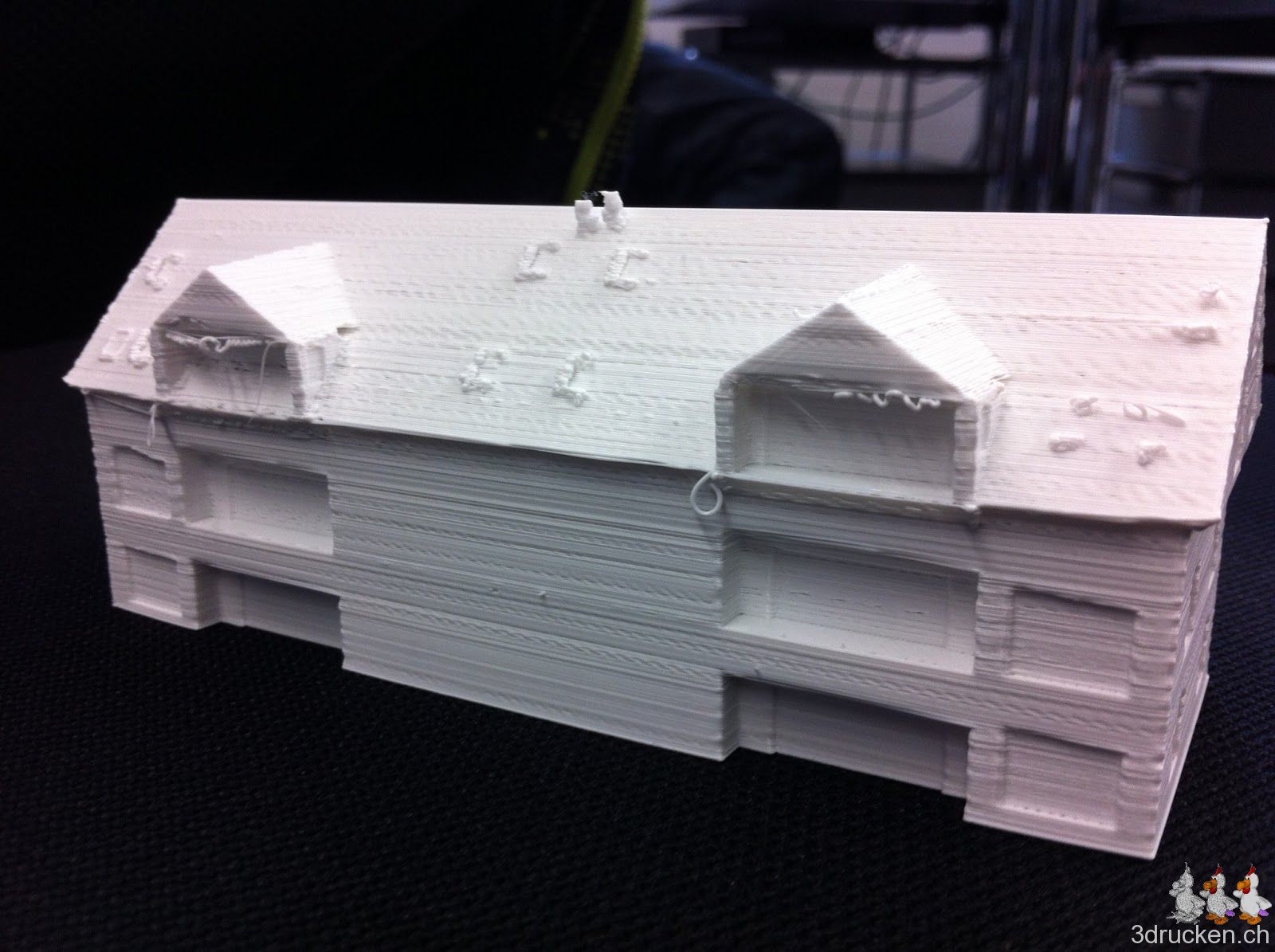Das Haus wurde nur bedingt besser gedruckt, als der „Testdruck“. Einzelne Flächen sind nicht schön gedruckt worden. Das liegt daran, dass der Ultimaker zwischendurch Probleme mit dem Fluss hatte. Grundsätzlich sind wir mit dem Ausdruck zufrieden. Es wäre aber mehr möglich gewesen.