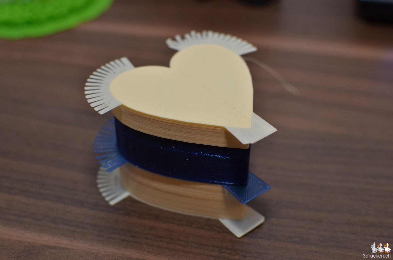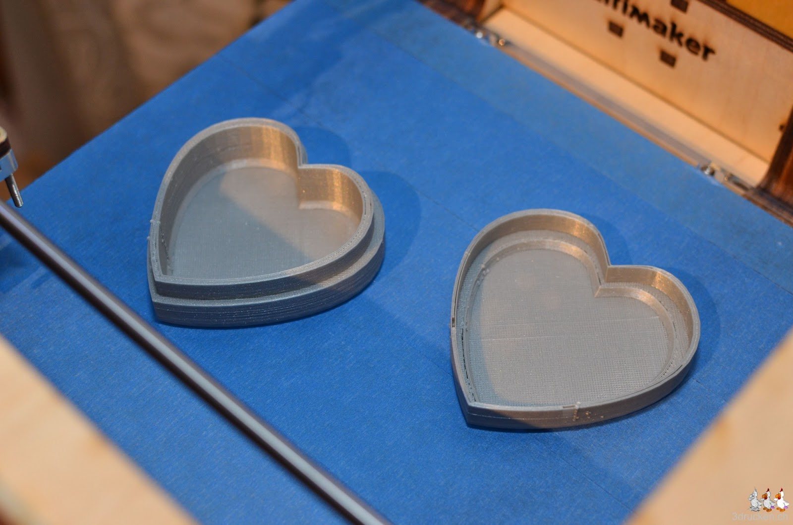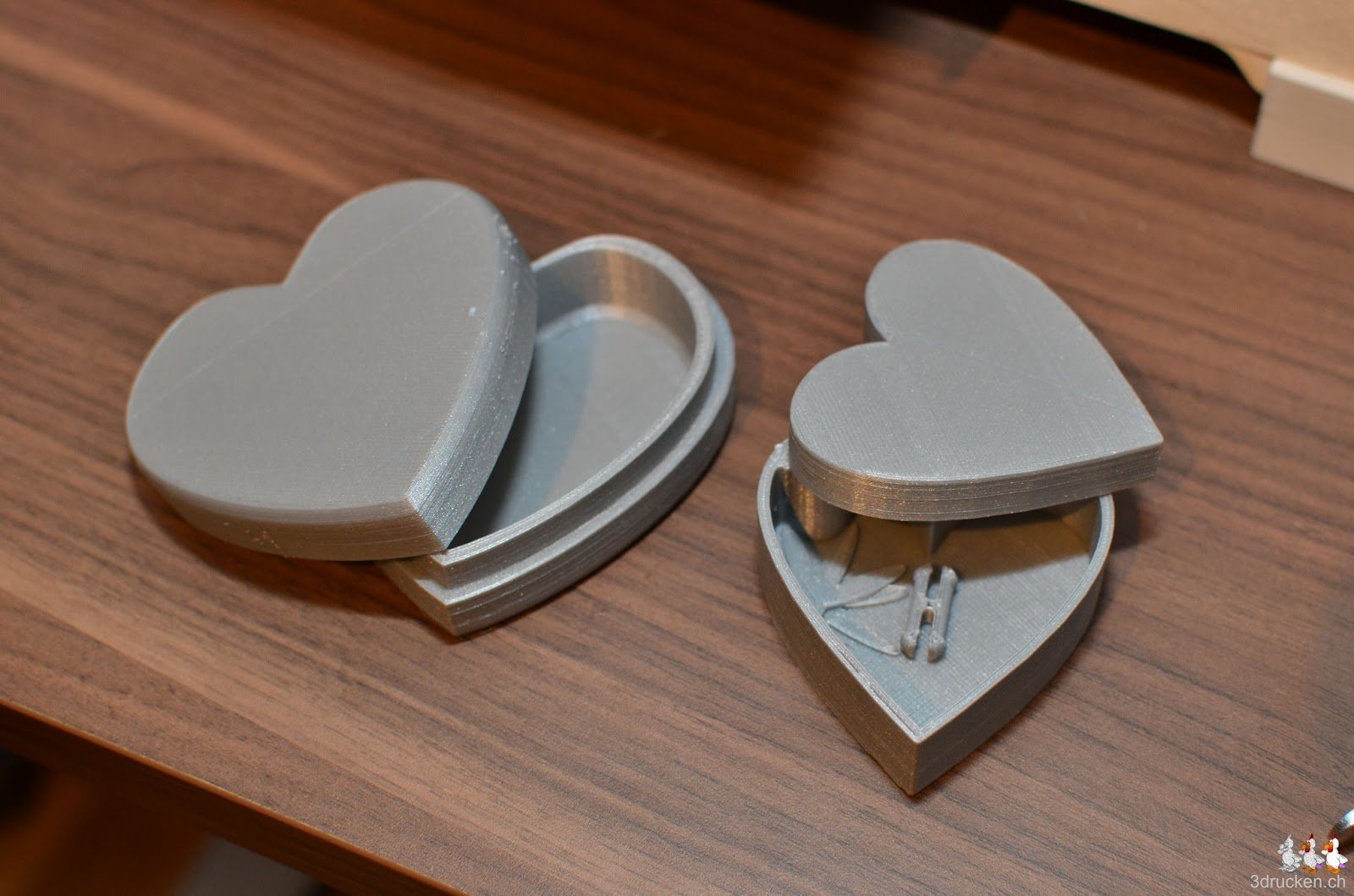 Für das Goldkettchen von Amélie haben wir eine neue Box in Herzform gedruckt. Hier die Testdrucke zweier Modelle von Thingiverse. Das erste haben wir neu entdeckt, das zweite hatte ich schon in vergrösserter Form als Geburtstagsgeschenk für meine Frau gedruckt.