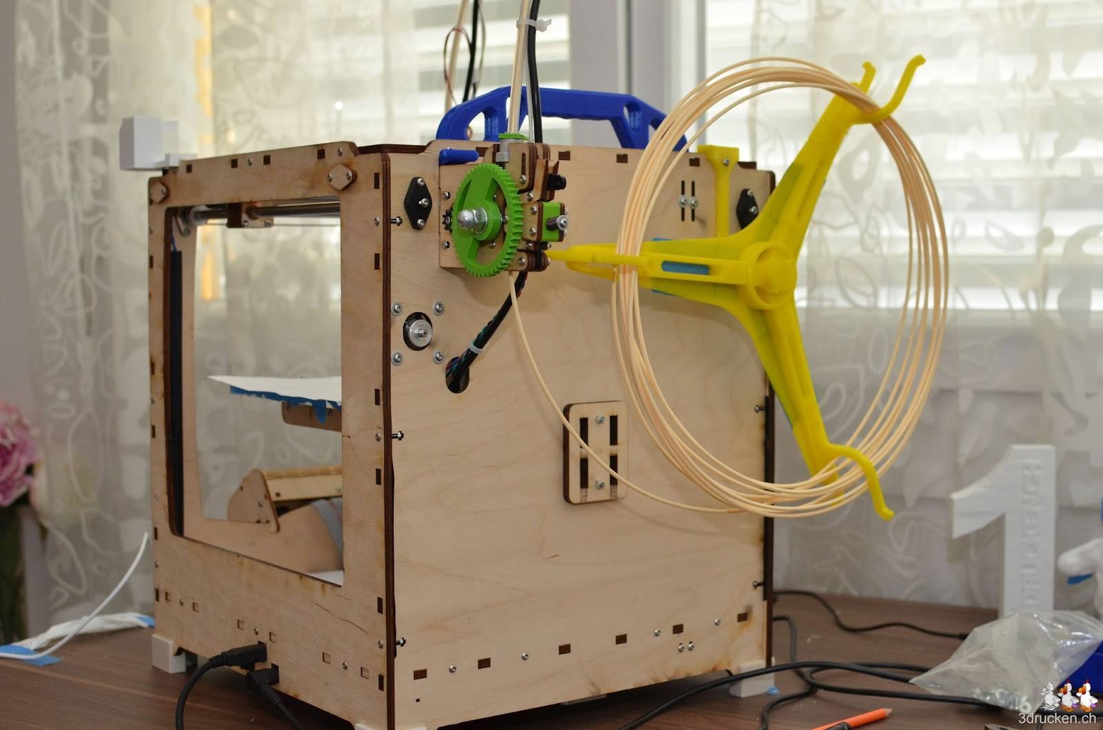 Nun eine der beiden Boxen und die gewünschten Farben aus der grossen Auswahl von faberdashery aussuchen lassen, und dann produzieren. Die Wahl fiel auf die Farben Buttercream und Galaxy Blue. Geslicet mit Cura 13.03 in 0.2 mm Schichten, 20 % Füllung. Gedruckt bei 220° C, ständig aufpassend, dass sich der Draht nicht kreuzt.