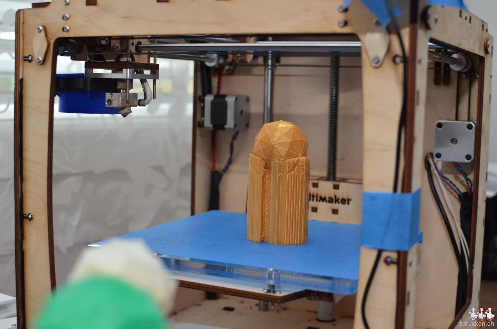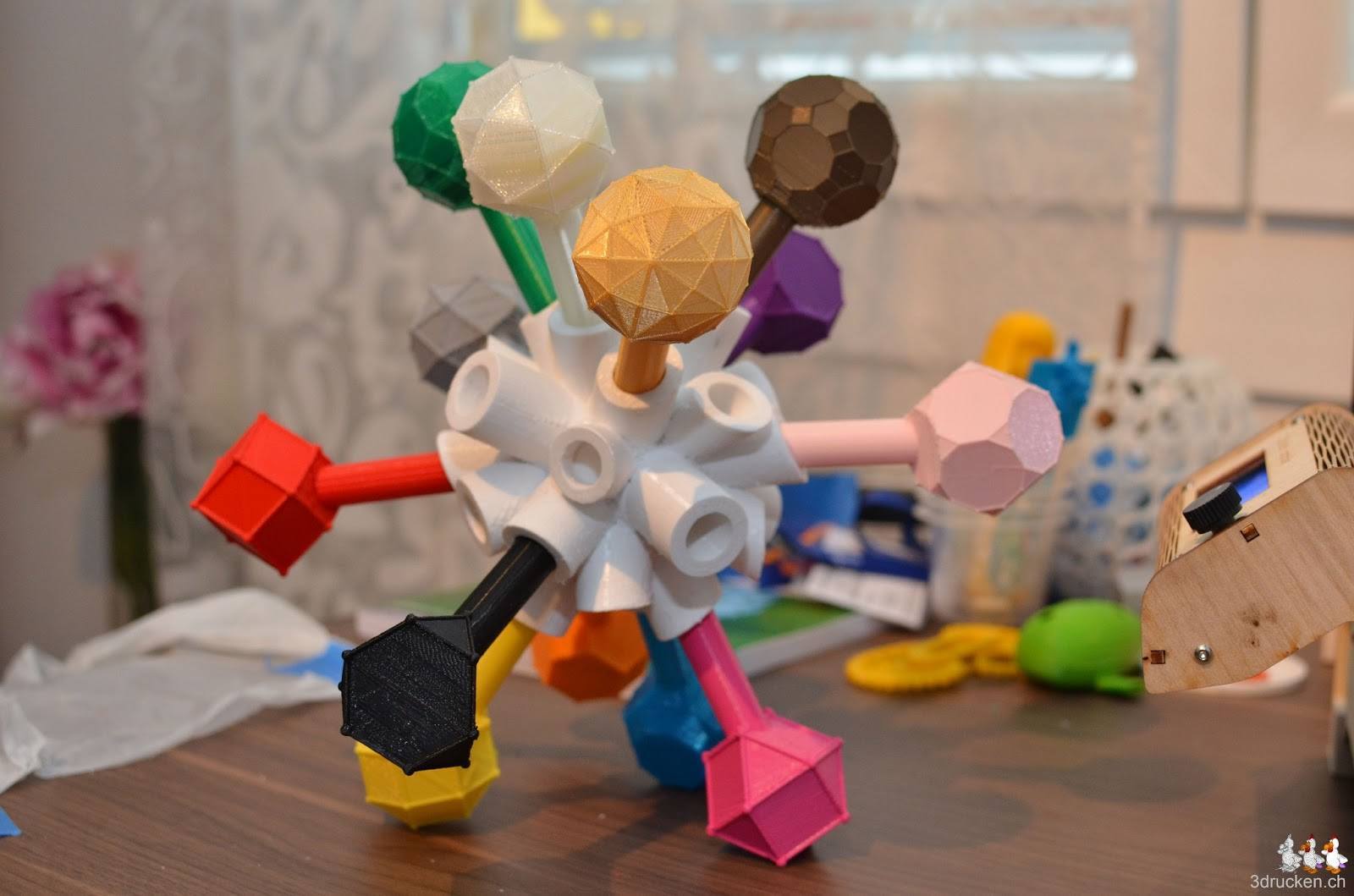 Die Zuordnung der Catalanischen Körper zu den Modellen von The Gem ist einiges schwieriger, da es auf den ersten Blick mehrere ähnliche Körper gibt. Die Flächen sind am Bildschirm schwer zu zählen, als direkt an den ausgedruckten Objekten. Ein guter Grund die Modelle auszudrucken und sich die Körper anhand der Modelle einzuprägen.Eine weitere Schwierigkeit sind die verschiedenen Farben, welche wir benötigen, um alle Körper zu drucken. Von den Faberdashery-Farben haben wir nur je 10 m Länge, dachten wir… beim Nachmessen stellen wir fest, dass es ziemlich genau 11 m sind. Hinzu kommt, dass die Schätzung der Menge Filament durch Cura ungenau oder fehlerhaft ist. Für den Druck des goldenen Hexakisikosaeder mit seiner Oberfläche aus 120 unregelmässigen Dreiecken gab Cura einen Materialverbrauch von 9.13 m an, weshalb wir die Füllung auf 5 % reduziert haben. Beim Nachmessen stellten wir aber fest, dass nur ca. 6.80 m Filament benötigt wurden. Unsere Vermutungen sind, dass Cura entweder den Support (75 % Materialanteil), mit vollen 100 % berechnet, oder aber das gesamte Objekt nur mit dem Materialanteil des Supports druckt. 75 % von 9.13 m sind 6.8475 m.