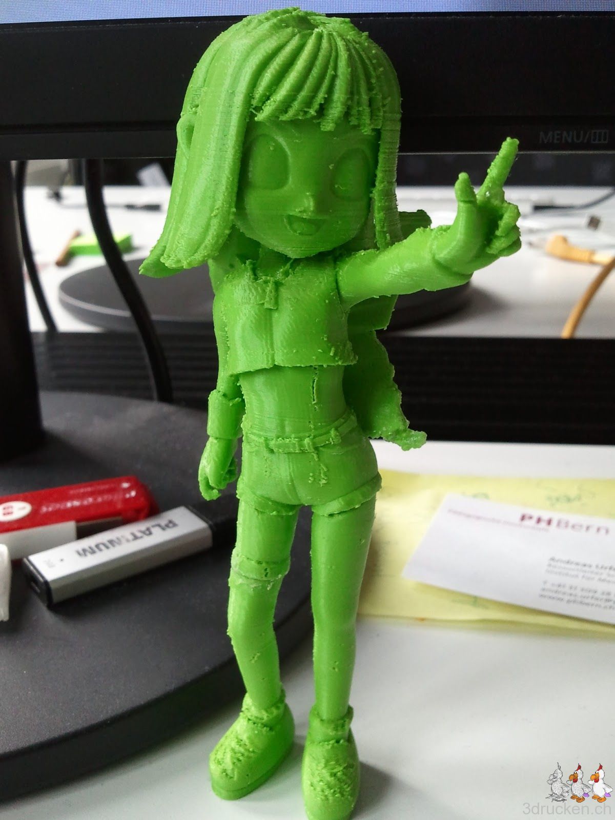 Nach der gelben Fee hier nun die grüne aus dem zweiten Ultimaker. Identische Einstellungen beim Slicen, gedruckt aus grünem Ultimaker-PLA, welches bei den neuen Kits dabei war. Leider sind uns beim Entfernen des Supports das rechte Bein, die Zeigfinger und das unterste Stück der Flügel abgebrochen. Wir haben die Teile so gut es ging mit Sekundenkleber wieder fixiert.