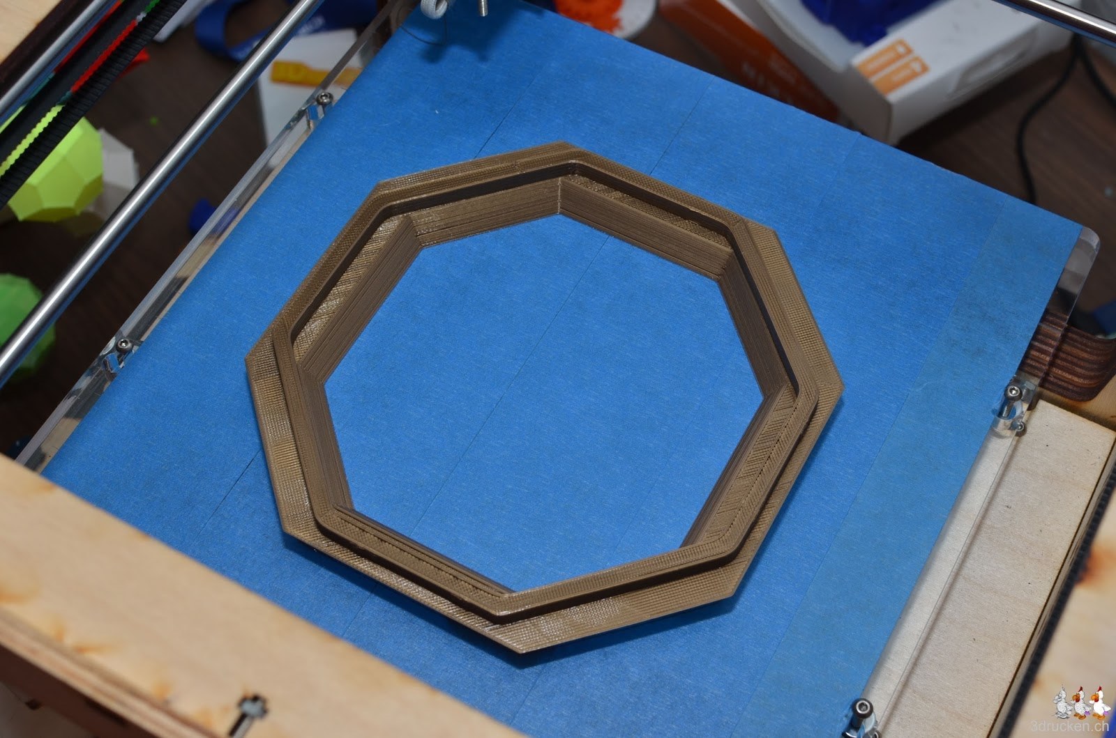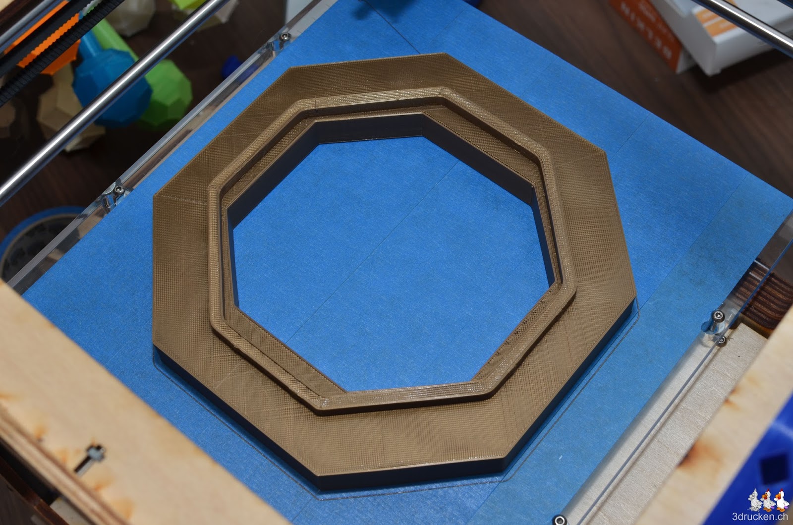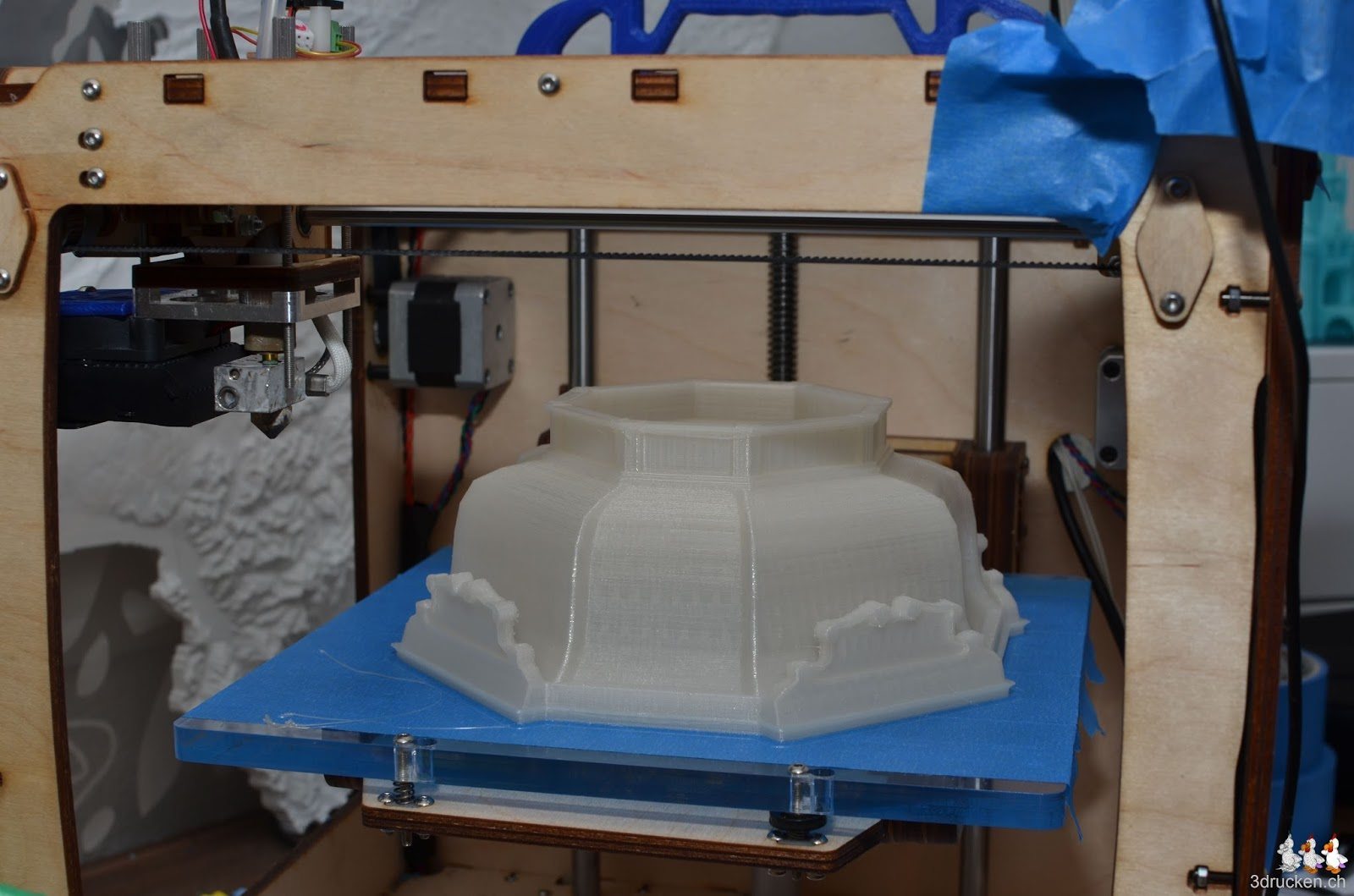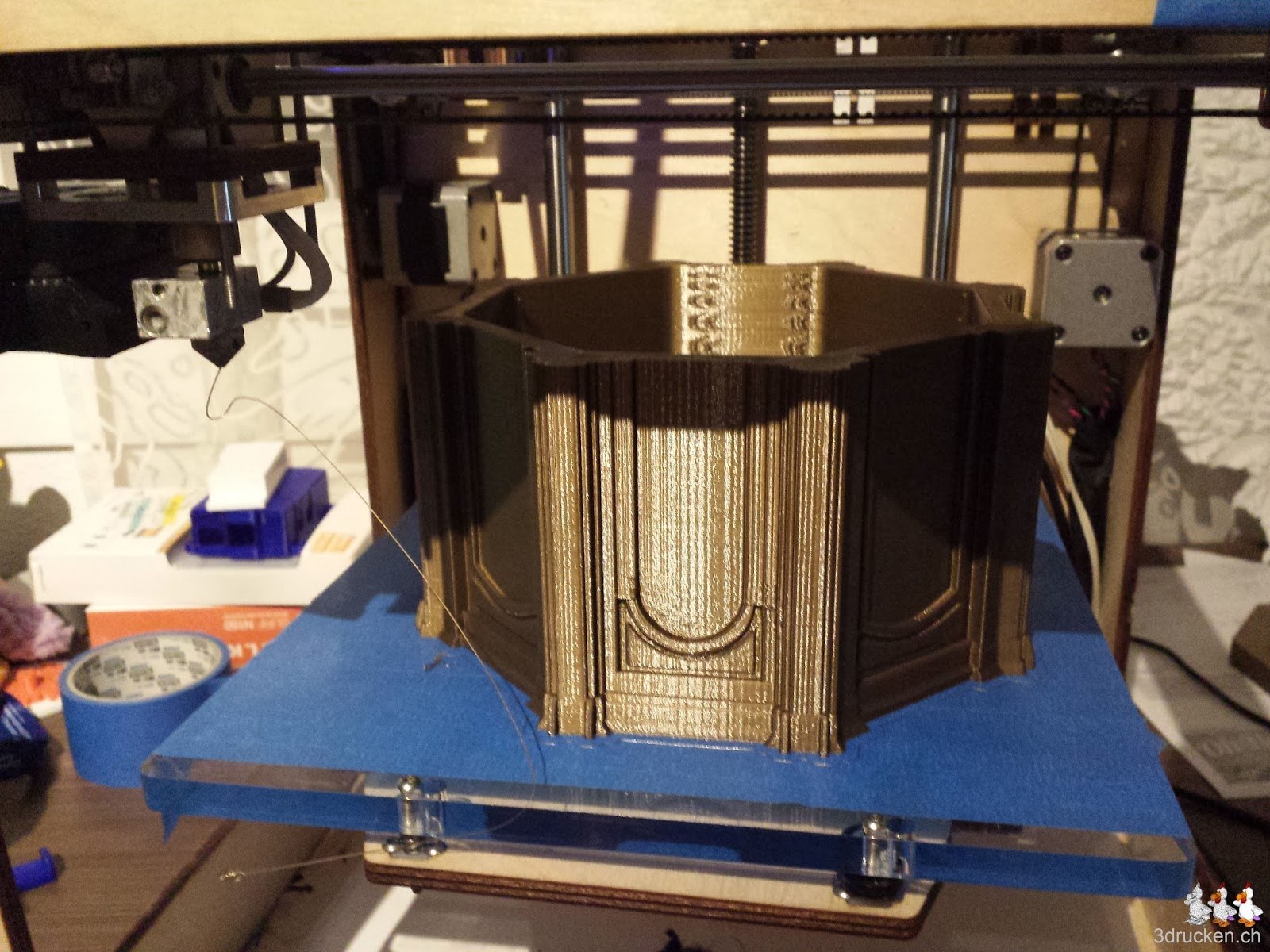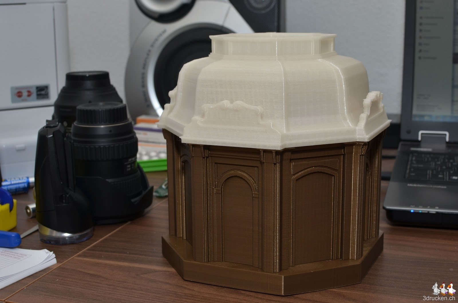 Das tolle Modell des Kaiserpavillons in Schönbrunn wurde uns freundlicherweise von b bauer http://bauermaker.tumblr.com/tagged/kaiserpavillon zur Verfügung gestellt. Wir haben es in Cura auf 1900% vergrössert, was eine Höhe von 18.5cm am fertigen Objekt ergibt. Gedruckt aus Gold/Brass PLA von Ultimaker, und transparentem PLA von orbi-tech in 0.24mm Schichten mit 20% Füllung und danach zusammengesteckt. Druckzeit total 34h 31min.