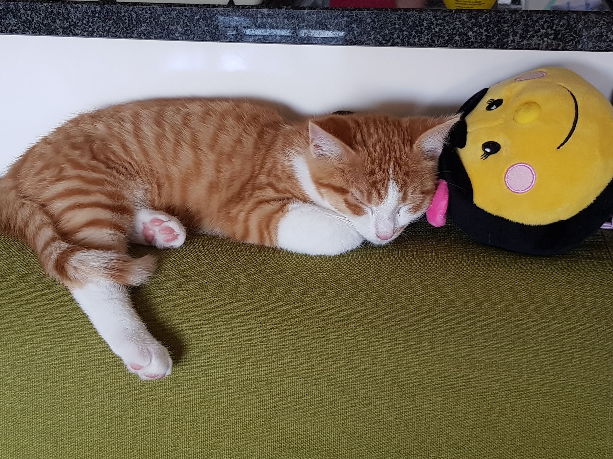Derweil wächst Kater Charly schnell, und weil Wachsen so anstrengend ist, gönnt er sich öfters mal ein Nickerchen. Hier mit seinem Kuscheltier, der Biene.