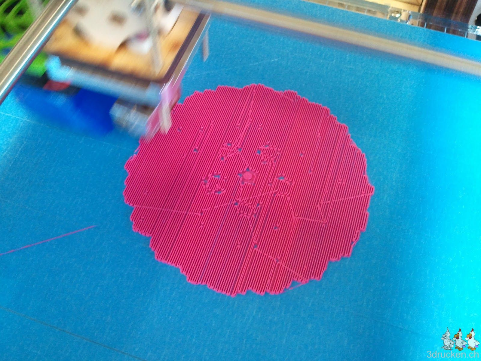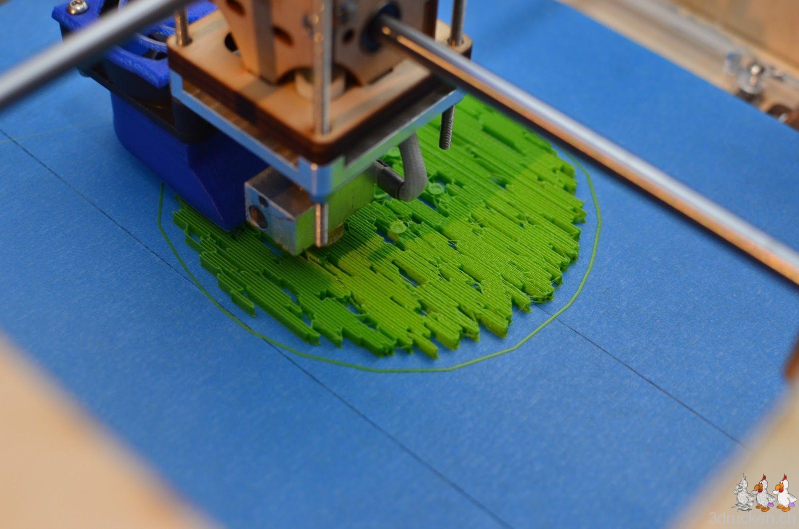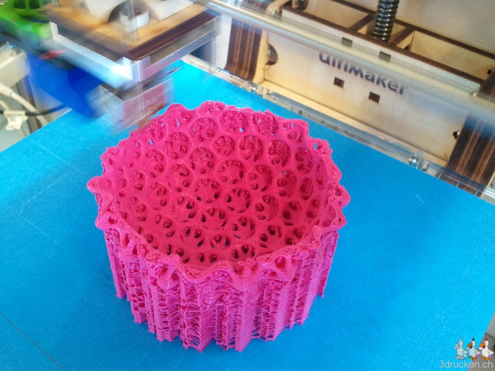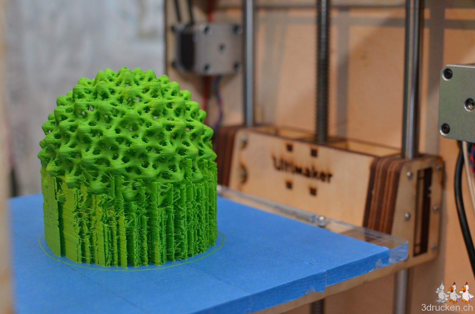 Das verwendete Profil aus der Google Gruppe mit 0.16 mm-Schichten weist mindestens eine Schwachstelle auf. Der Druckkopf bleibt am Anfang sehr tief über dem Drucktisch stehen, falls für den ersten Layer eine andere Temperatur eingetragen wurde, und wartet bis geheizt wurde. Man sollte wohl lieber alles mit der selben Temperatur drucken.
