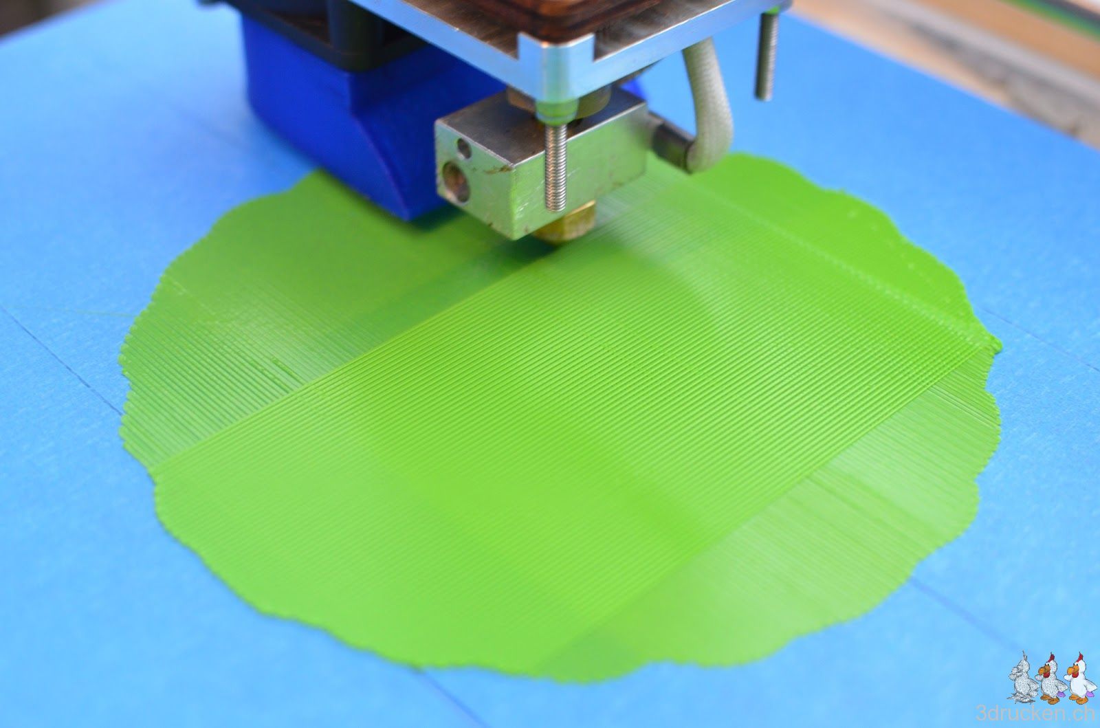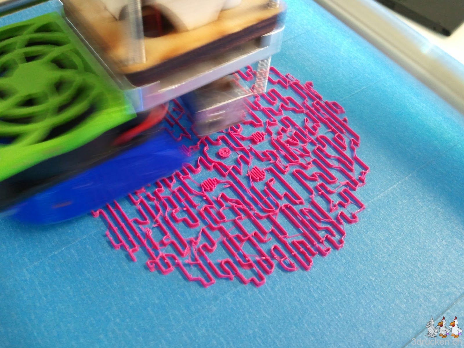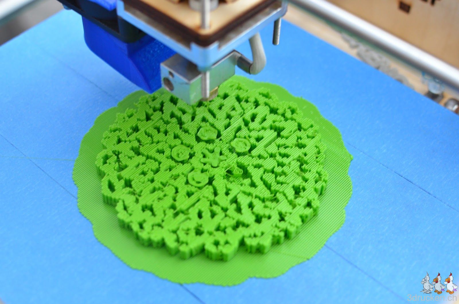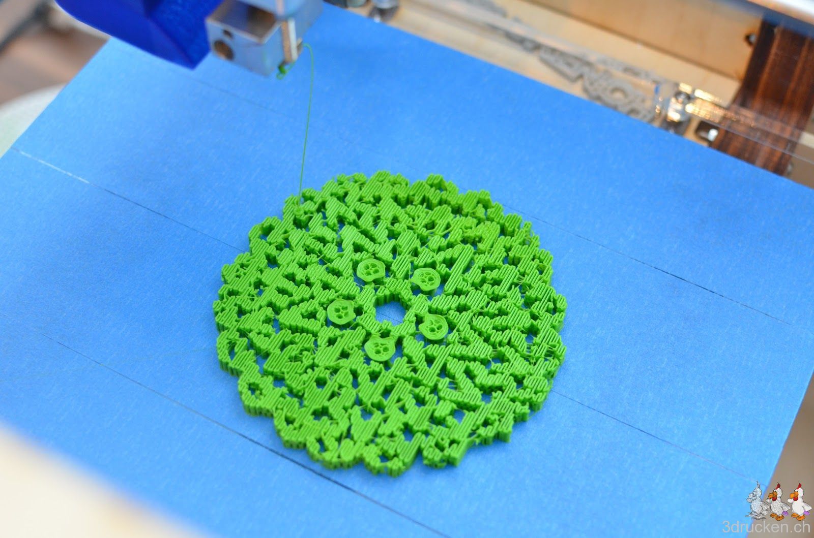 Das verwendete Profil aus der Google Gruppe mit 0.16 mm-Schichten weist mindestens eine Schwachstelle auf. Der Druckkopf bleibt am Anfang sehr tief über dem Drucktisch stehen, falls für den ersten Layer eine andere Temperatur eingetragen wurde, und wartet bis geheizt wurde. Man sollte wohl lieber alles mit der selben Temperatur drucken.