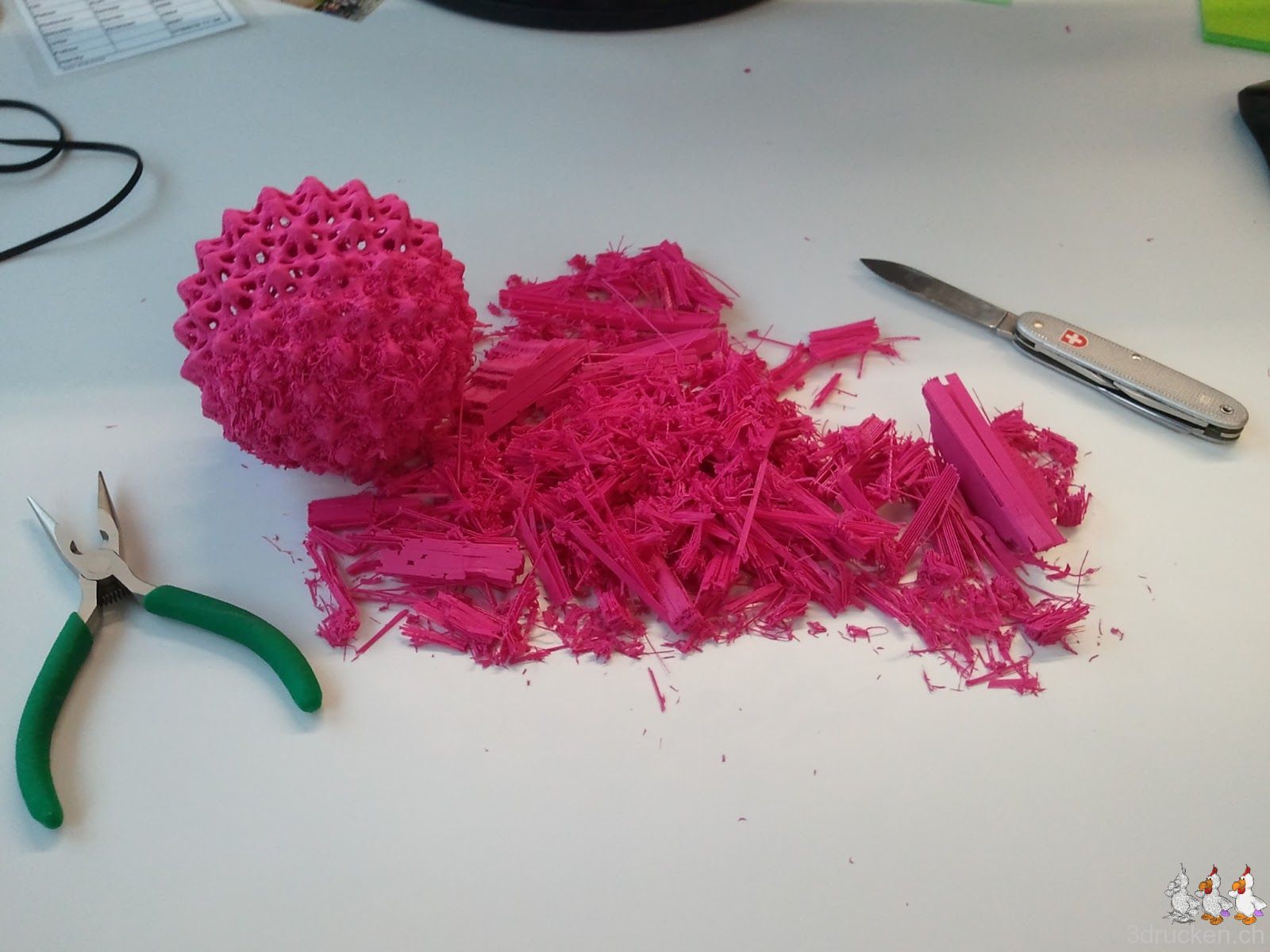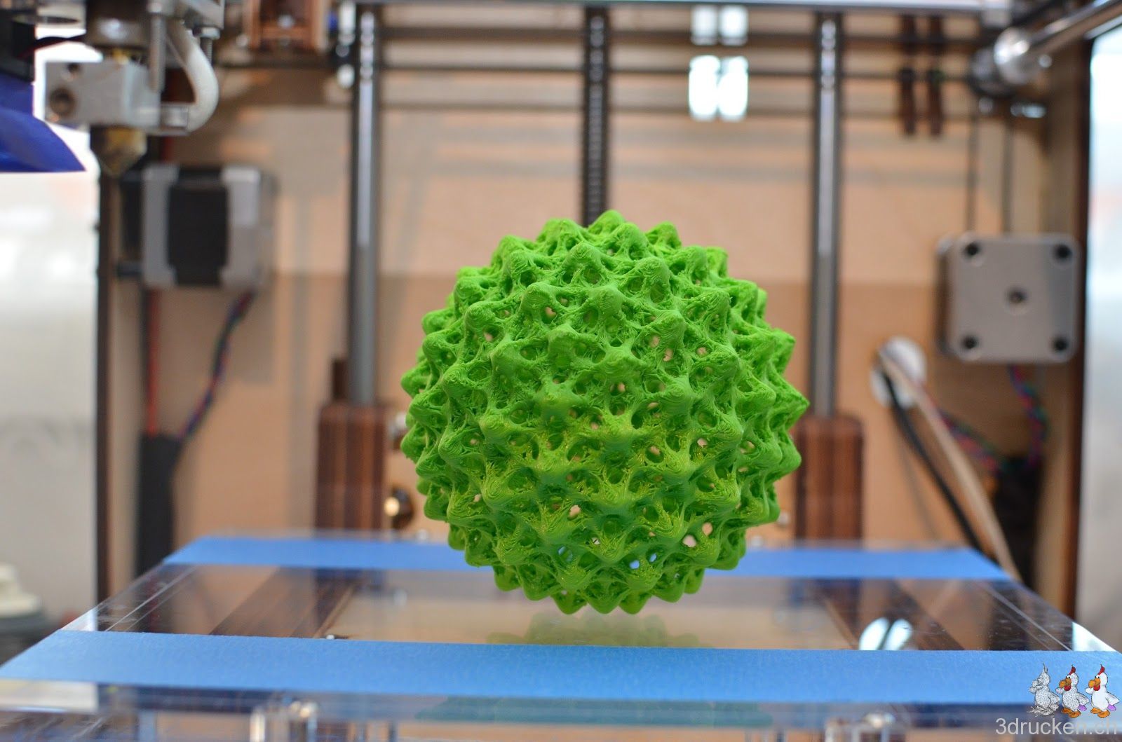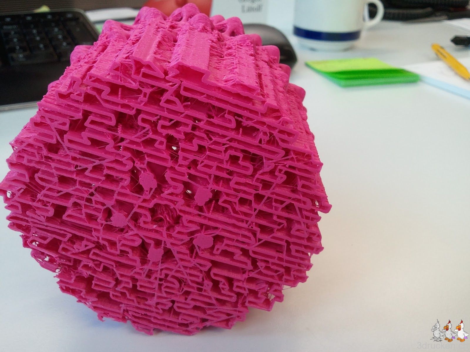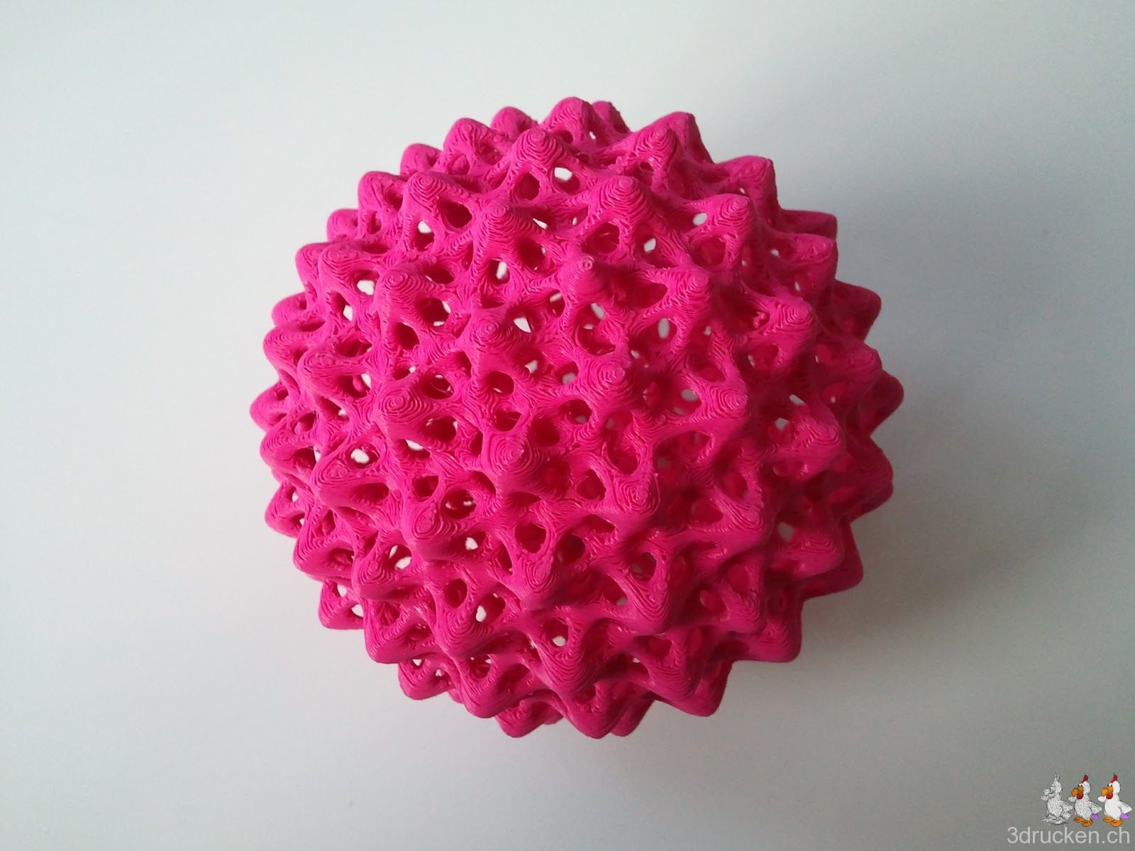 0.2 mm-Schichten, 0 % Füllung, gedruckt in 9 h 10 min bei getunten 215° C. Die Kugel ist nach dem Entfernen des Supports nur 33 g schwer.
