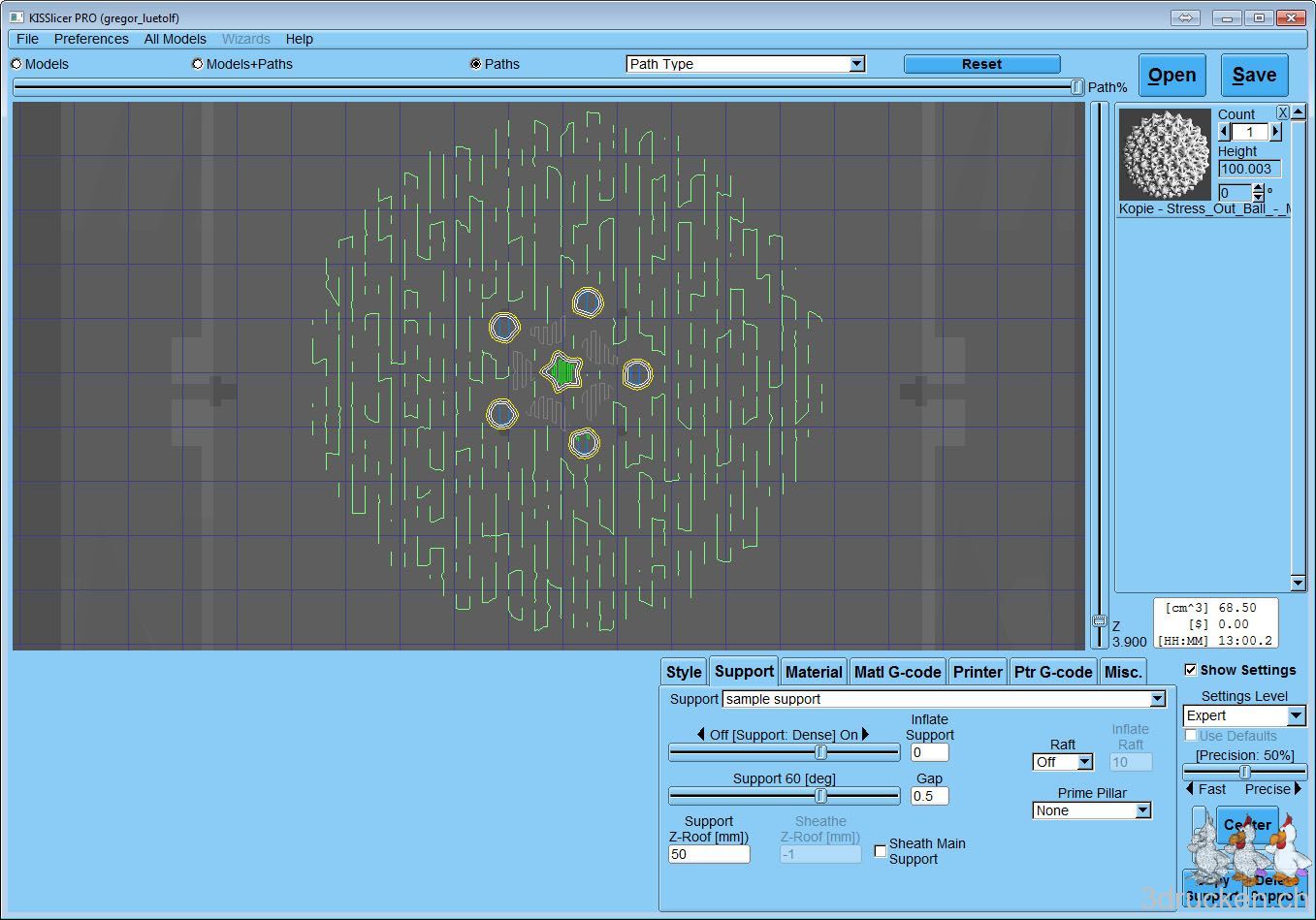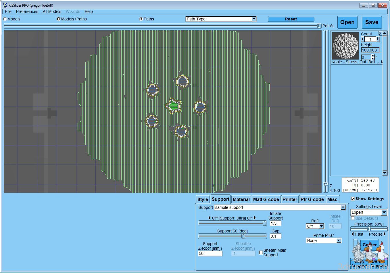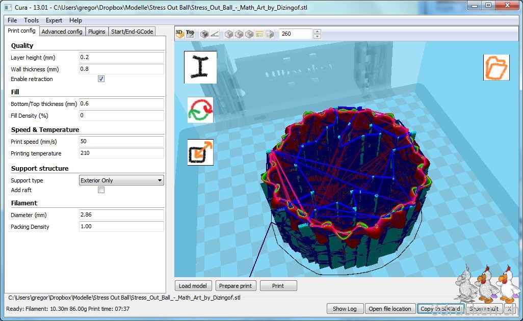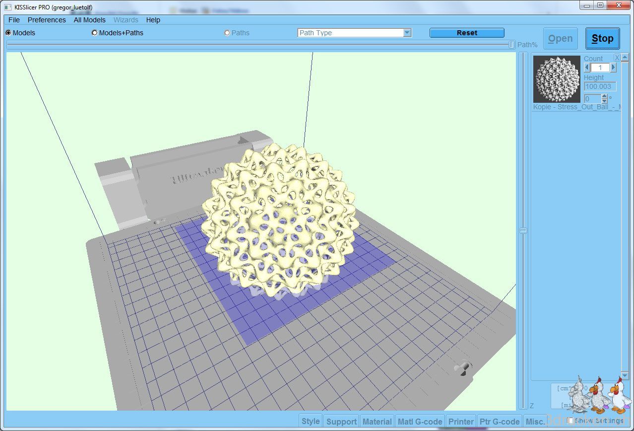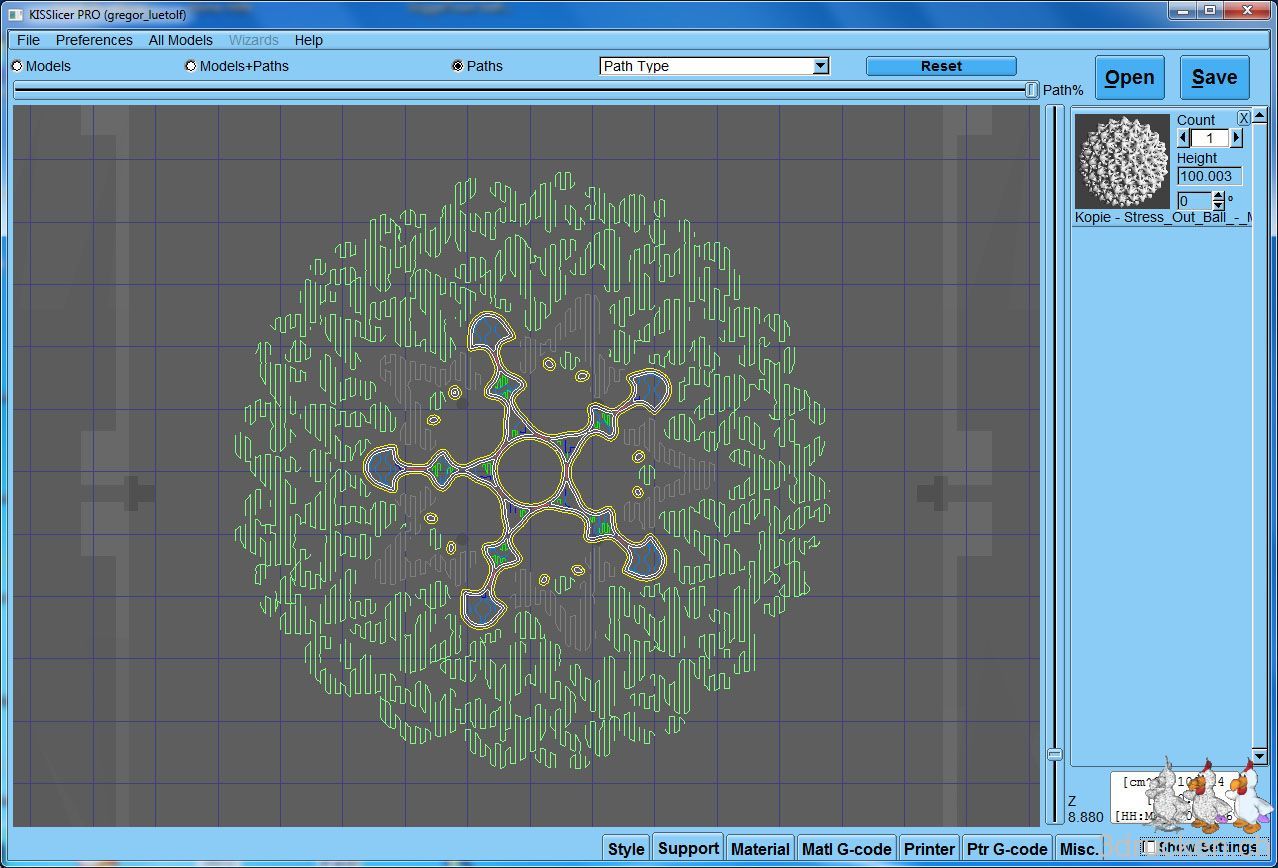 Nachdem wir auf Florian Horschs Anraten hin, uns vorerst nur mit Cura beschäftigt haben, wagen wir uns zurück zu einem ersten Versuch mit dem KISSlicer. Dies wegen der Möglichkeit, den Support bei Objekten flexibler zu konfigurieren, und wegen der Geschwindigkeit beim Slicen. Wir kennen KISSlicer schon von unserer Arbeit am BfB 3DTouch, haben ihn aber noch nicht in Kombination mit dem Ultimaker verwendet. Heute brachte uns das Modell des Stress Out Ball auf die Idee, einen Vergleich von Cura mit KISSlicer beim komplizierten Support zu wagen.