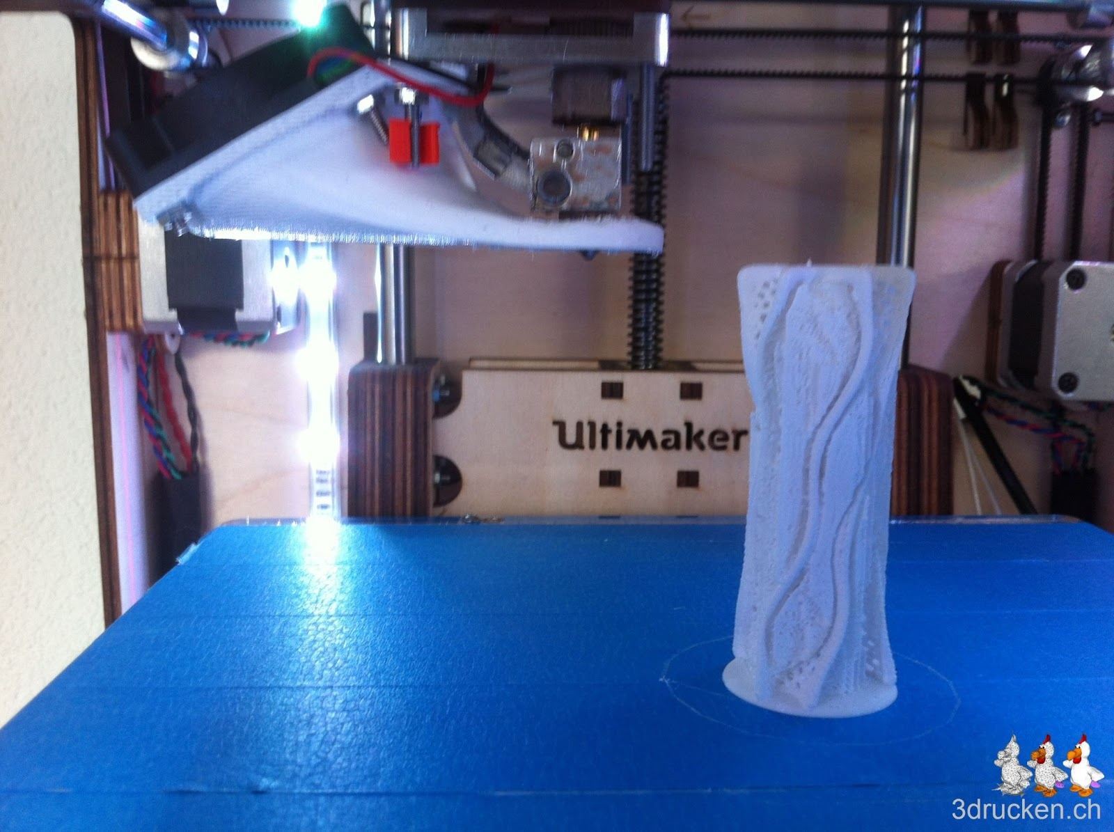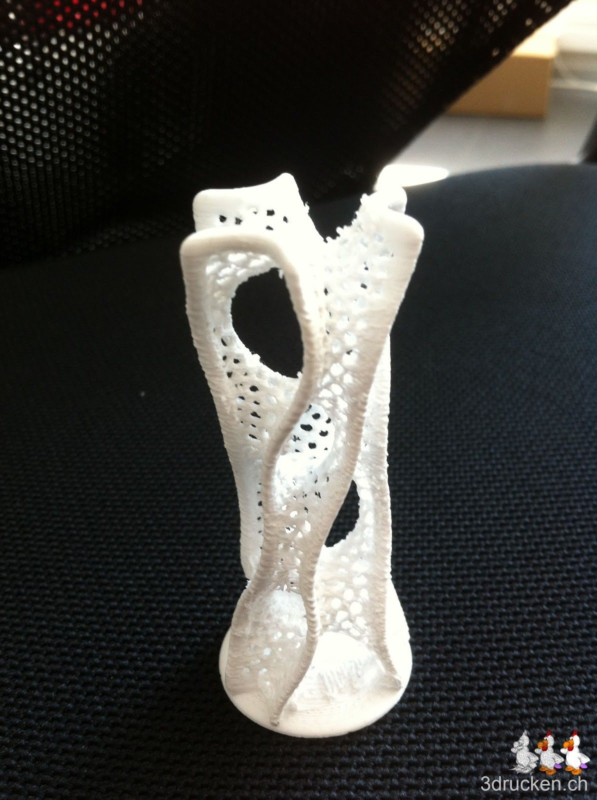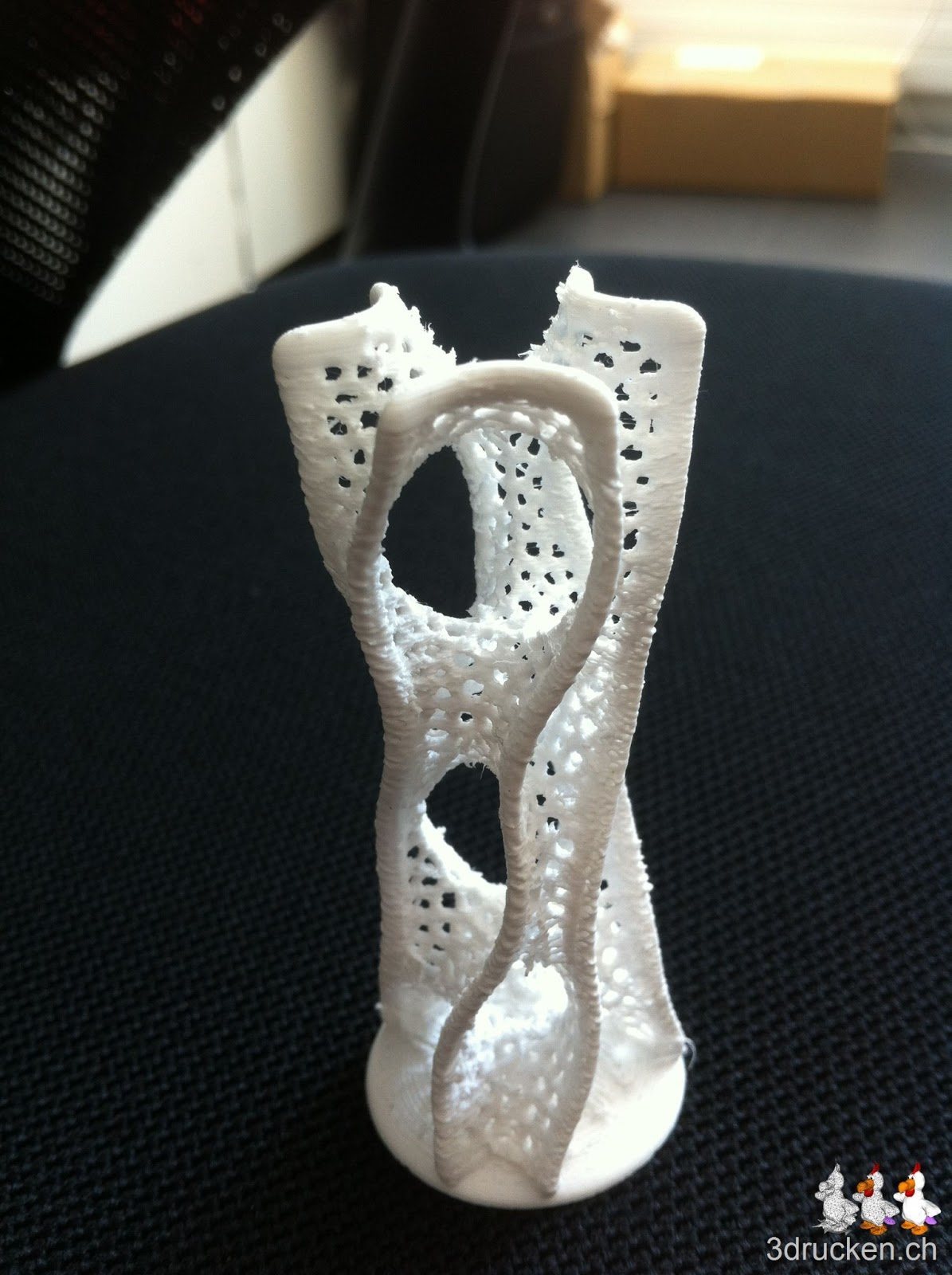 Im Verlauf vom Morgen druckten wir einen Kustgegenstand, genannt Voronoi D Tower – Math Art, gezeichnet von Dizingof. Die Details vom Objekt kamen mit 0.1 mm Layer schön zum Vorschein. Das Objekt druckten wir mit dem Support-Typ „Everywhere“.