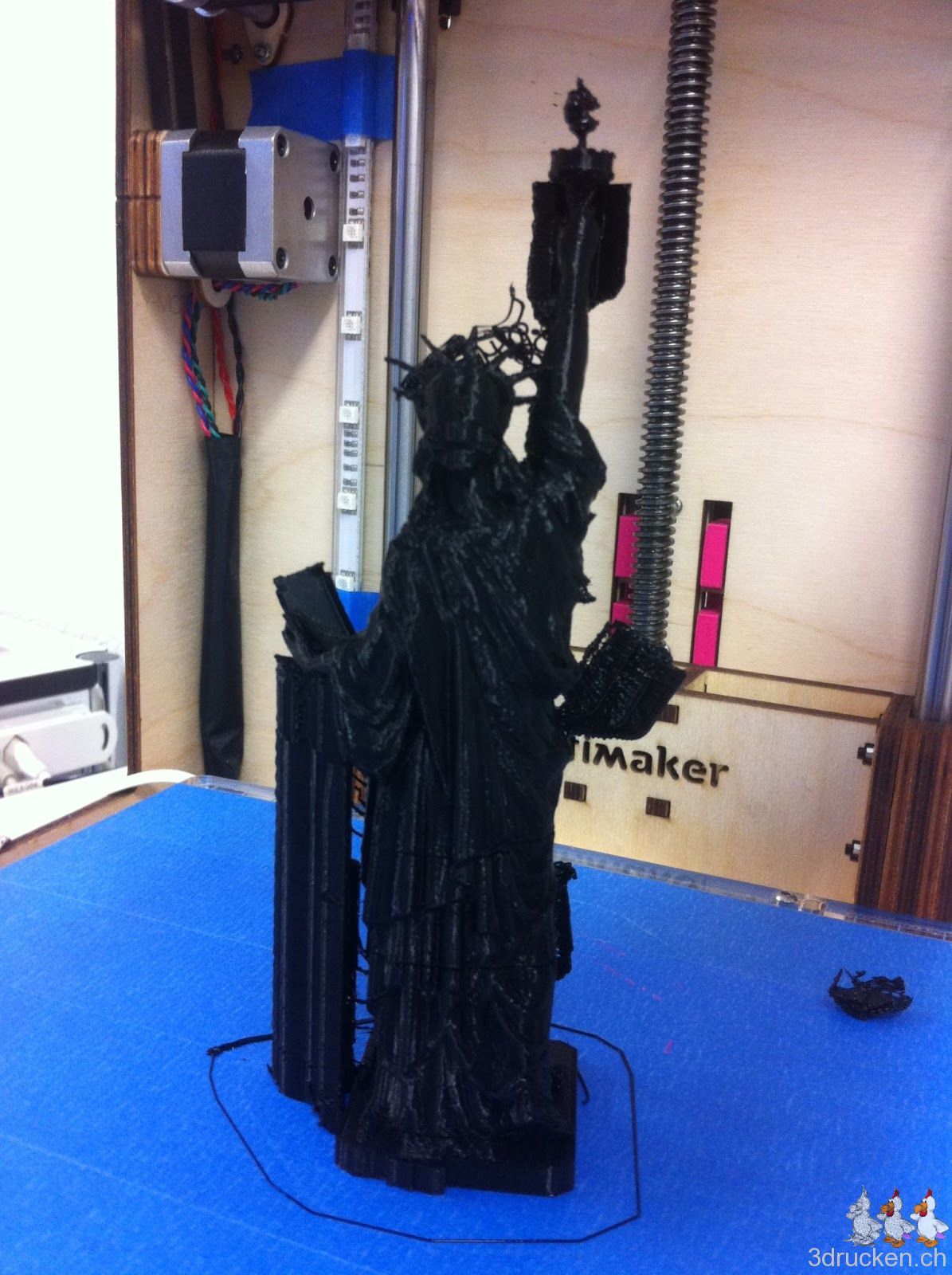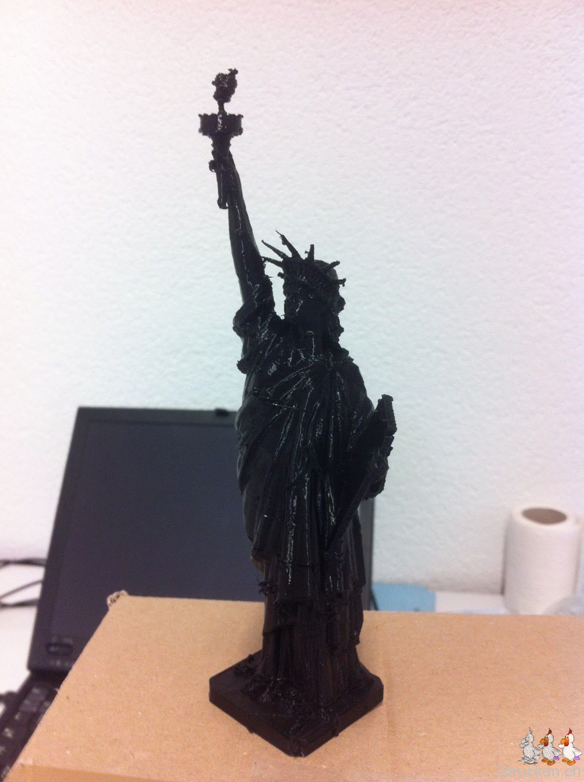 Über das Wochenende wurde eine anderes grösseres Modell der Freiheitsstatue gedruckt. Der Druck dauerte ganze 4 Stunden und 22 Minuten. Mit 0.2mm Schichtdicke und 20 % Füllung entstand bei bei 220° C die ca. 15 cm grosse Freiheitsstatue.