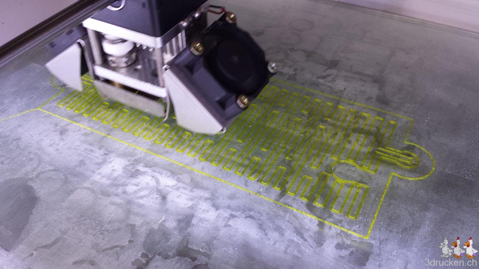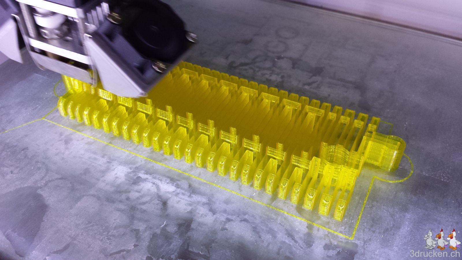 Wir haben diese Idee mit Hilfe von Tinkercad auf die Lego Duplo Schienen angepasst und versuchen unser Glück mit dem Druck aus gelb transparentem PLA auf dem Ultimaker 2 mit neuer Düse und Isolator. Allerdings bei lediglich 50 mm/s für den Anfang.