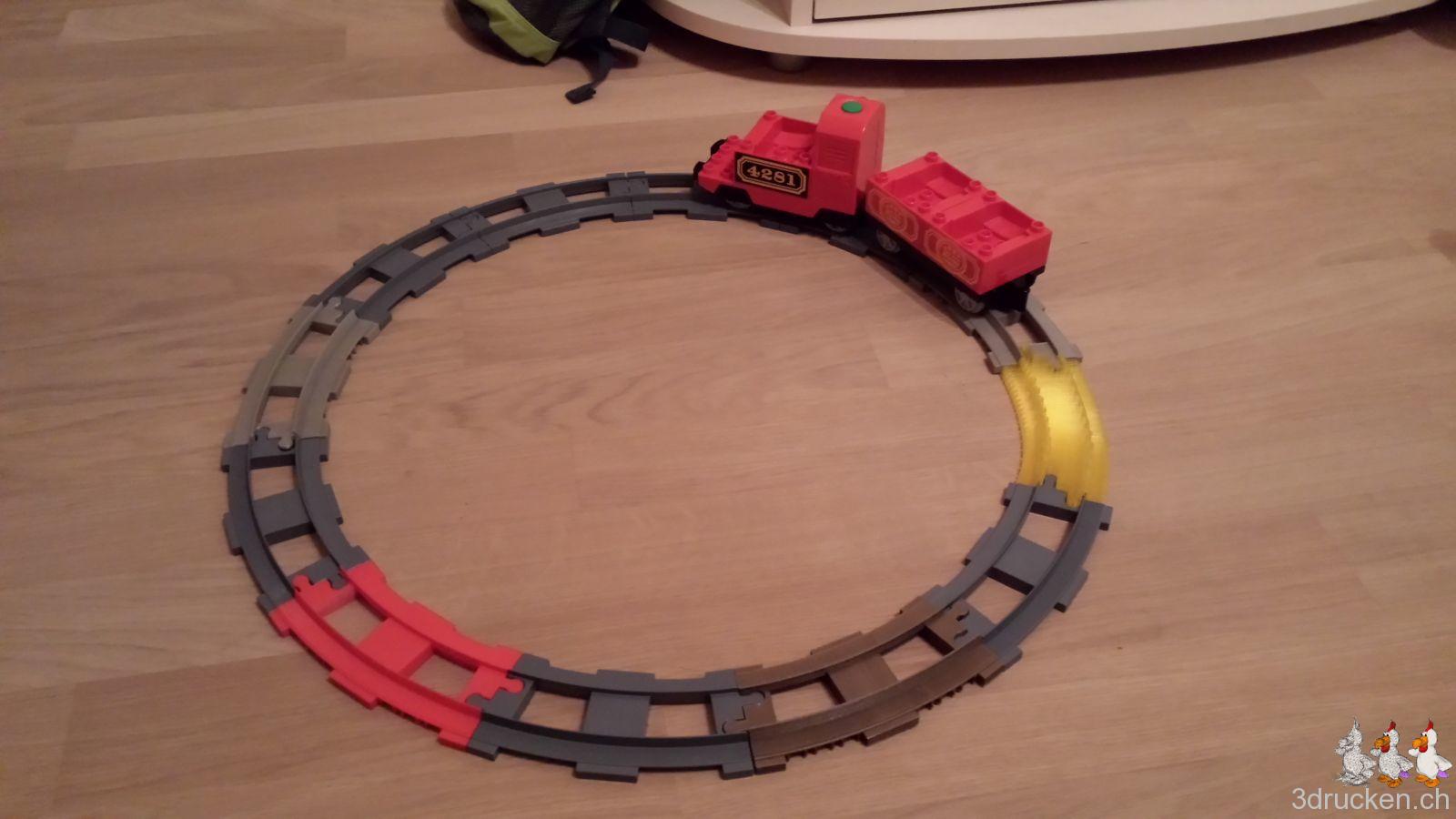 So schnell wie Roman werden wir die Schienen wohl auf unserem Drucker nicht herstellen können, trotzdem wäre ein solches Design unseren bisherigen Schienenerweiterungen um Längen überlegen und dazu beim Streckenbau noch flexibel einsetzbar. Und ja, es funktioniert, die Schiene kann ganz normal verbaut werden und der Zug fährt ohne Probleme drüber.