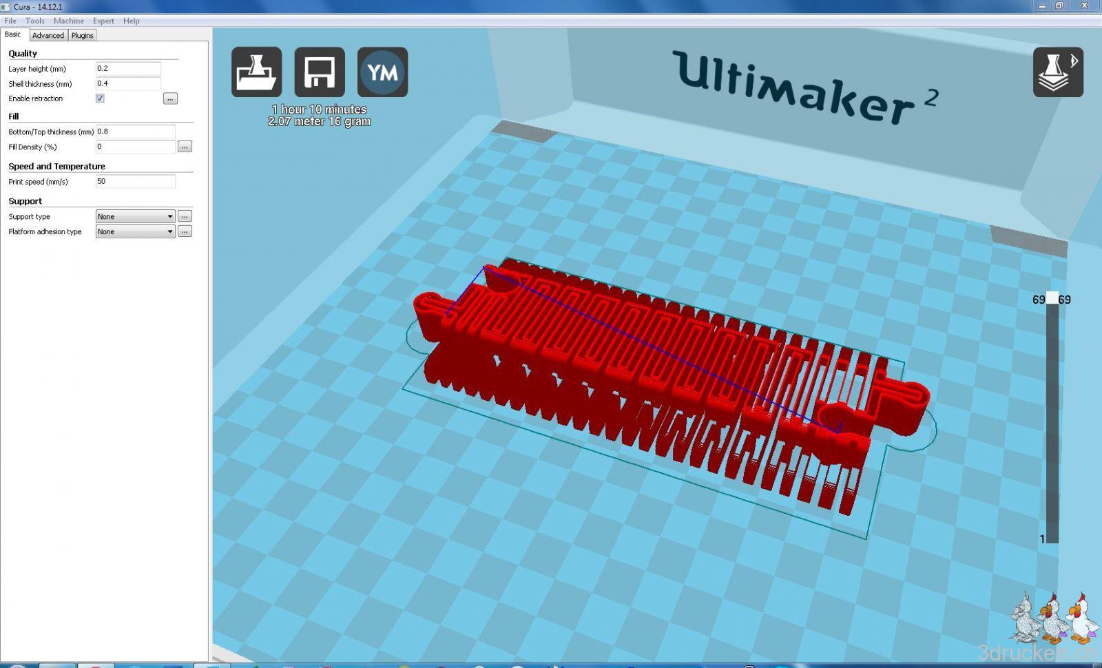 Hinzu kommt, dass durch das Design die Druckeinstellungen in Cura ohne Boden und Decke, sowie nur einer Umfahrung und der Option “Spiralize” unterstützt werden. So kann eine Schiene sehr schnell gedruckt werden, da das Objekt aus nur einem langen zusammenhängenden Pfad pro Ebene besteht.