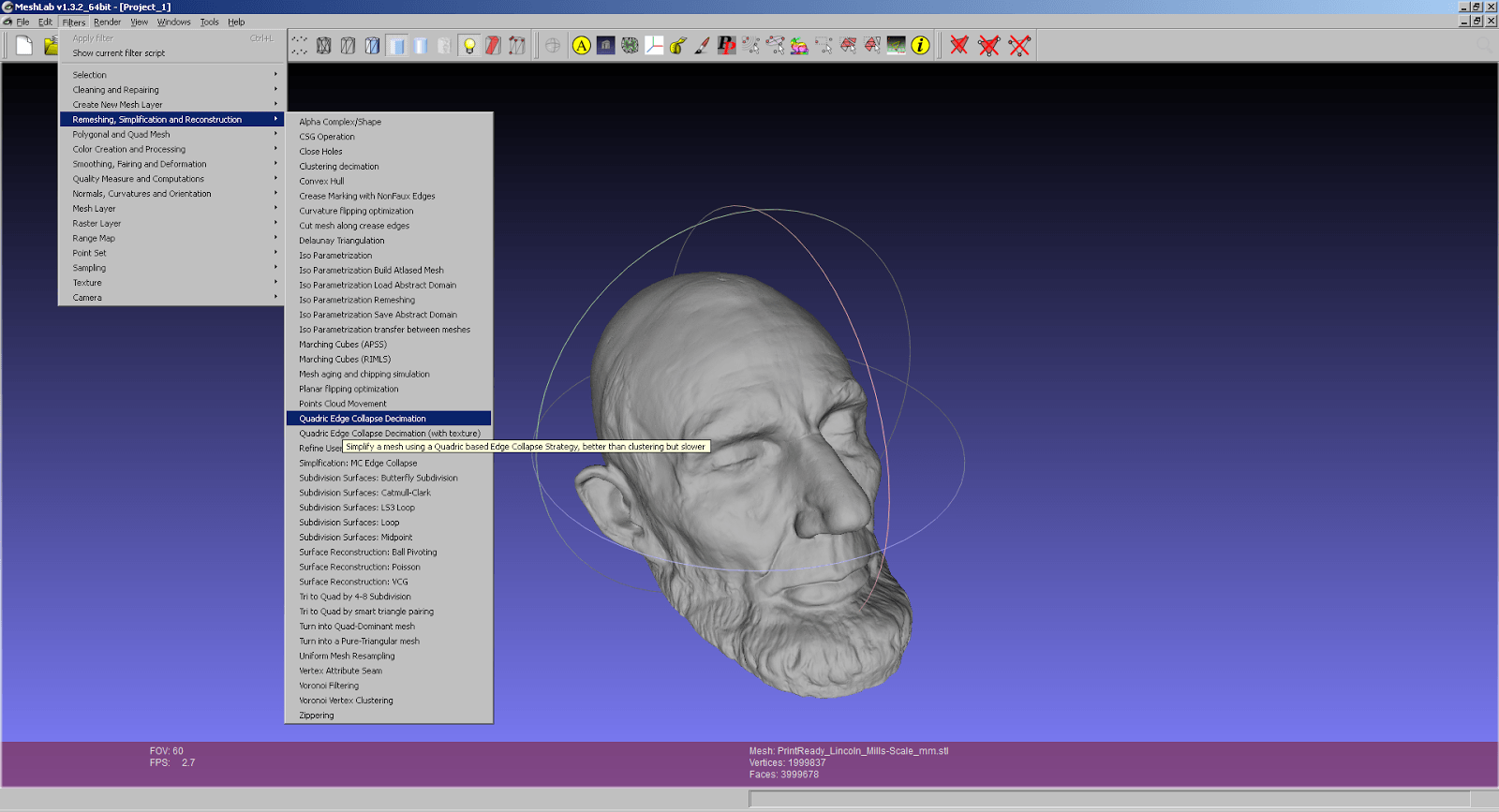 Reduzieren geht am einfachsten mit MeshLab, und zwar über Filters.Remeshing….Quadric Edge Collapse Decimation. Wir wählen 25 % Anzahl Faces und versuchen durch die Optionen möglichst die Form des Modells zu erhalten.