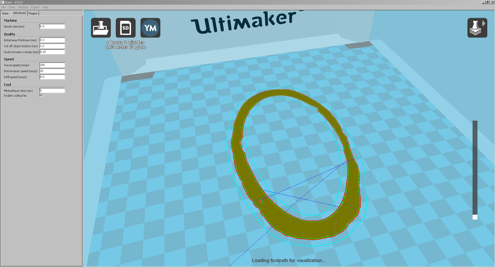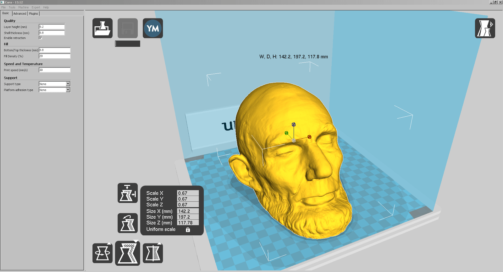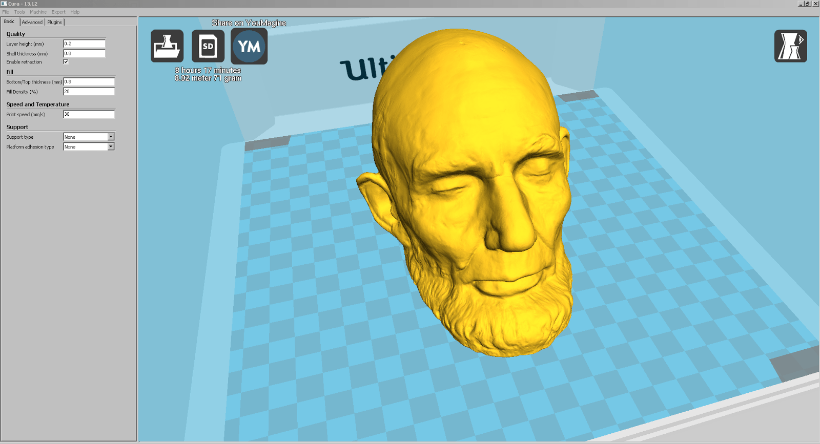 Trotzdem schafft es Cura 13.12 auf unserem Notebook mit 16GB RAM nicht, das Modell zu Slicen. Cura Engine stürzt bei jedem Versuch ab, ohne ein Resultat zu liefern. Wir verkleinern mal weiter um zu sehen, ob die Grösse (Komplexität) des Modells einen Einfluss darauf hat. Beim genauer betrachten fällt uns nun auf, dass Cura auch ein Problem damit haben könnte, dass die Maske ausgehöhlt ist. Wir deaktivieren mal die Option „Combine everything (Type-A)“ um das zu testen. Nun geht das Slicen, ev. lag es aber auch einfach daran, dass Cura zwischen dem Durchlauf der Engine und der Anzeige im GUI keine Rückmeldung geliefert hatte? Cura zeigt auch einen komischen äusseren Perimeter, den man auf dem ersten Screenshot oben gut erkennen kann. Wir müssen erst noch herausfinden wozu der gut ist. Solange der aber innerhalb der Maximaldimensionen bleibt, wird das Modell erfolgreich geslicet.