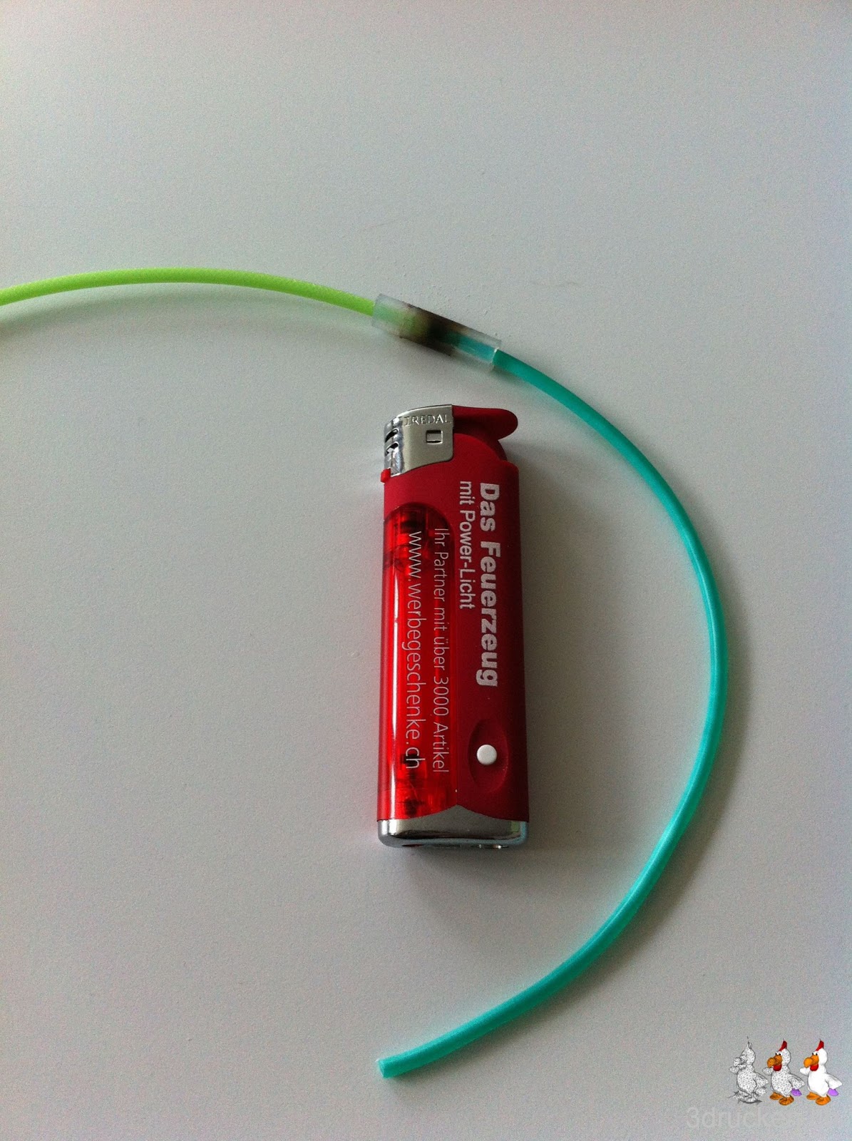 - Mit einem Feuerzeug den Schlauch mehrmals 2-3 Sekunden lang erhitzen. Die Drahtenden leicht zusammenstossen.