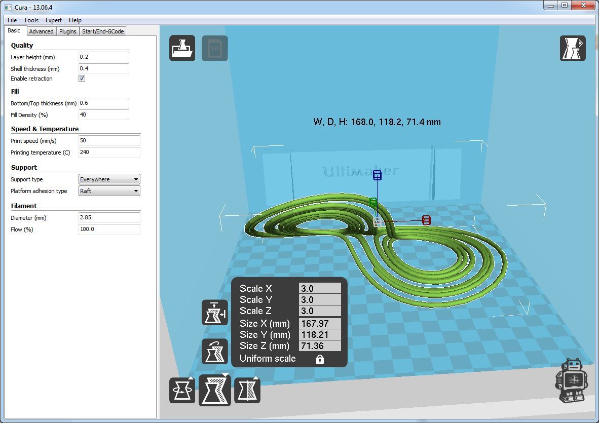 Wir skalieren in Cura auf 300 % und richten das Modell so aus, dass möglichst wenig Support nötig ist. Für einmal überlassen wir diese Aufgabe dem automatischen „Lay flat“. Die weiteren Einstellungen in Cura sieht man auf dem Screenshot unten.