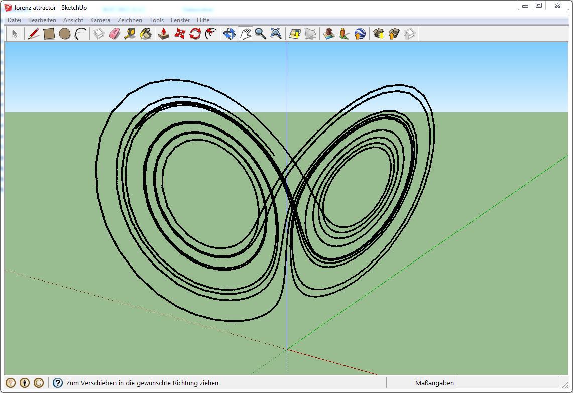 In der vorliegenden Form lässt sich unser Modell des Lorenz Attraktors nicht auf dem Ultimaker ausdrucken, denn die Pfade bleiben selbst nach dem Skalieren zu dünn. Wir versuchen die Pfade dicker zu machen und importieren das Modell dazu mit Hilfe des STL-Import Plugins nach Sketchup.