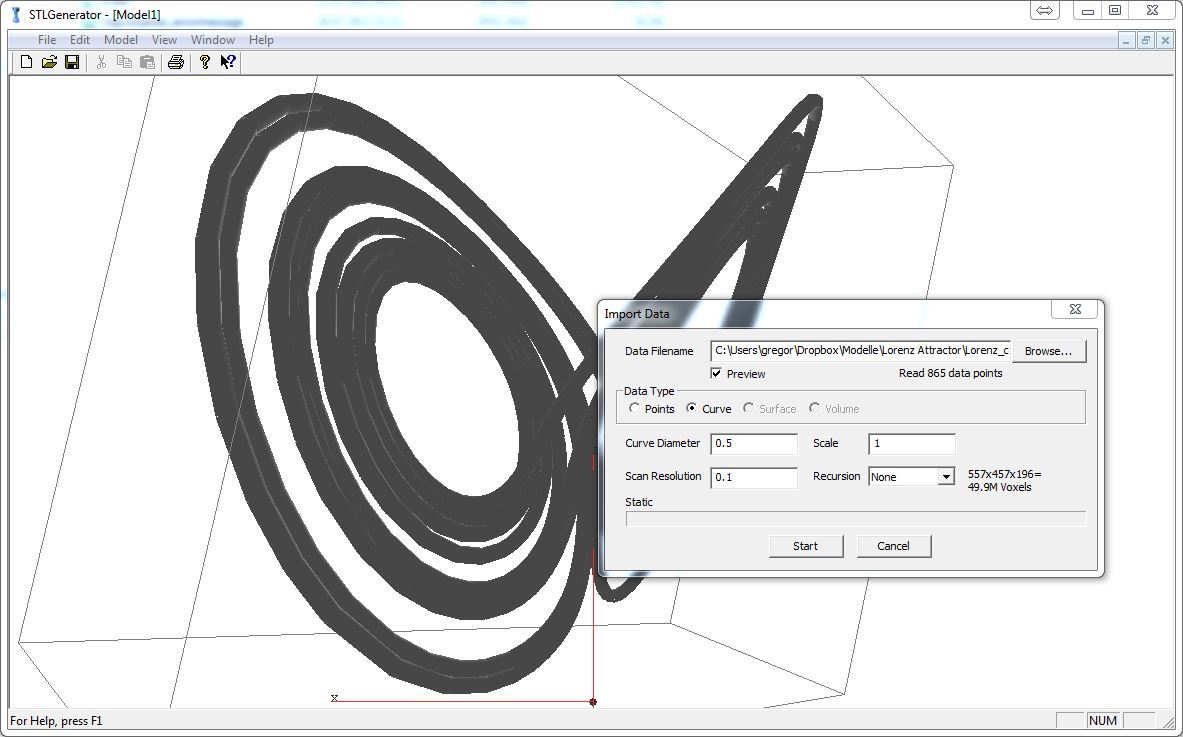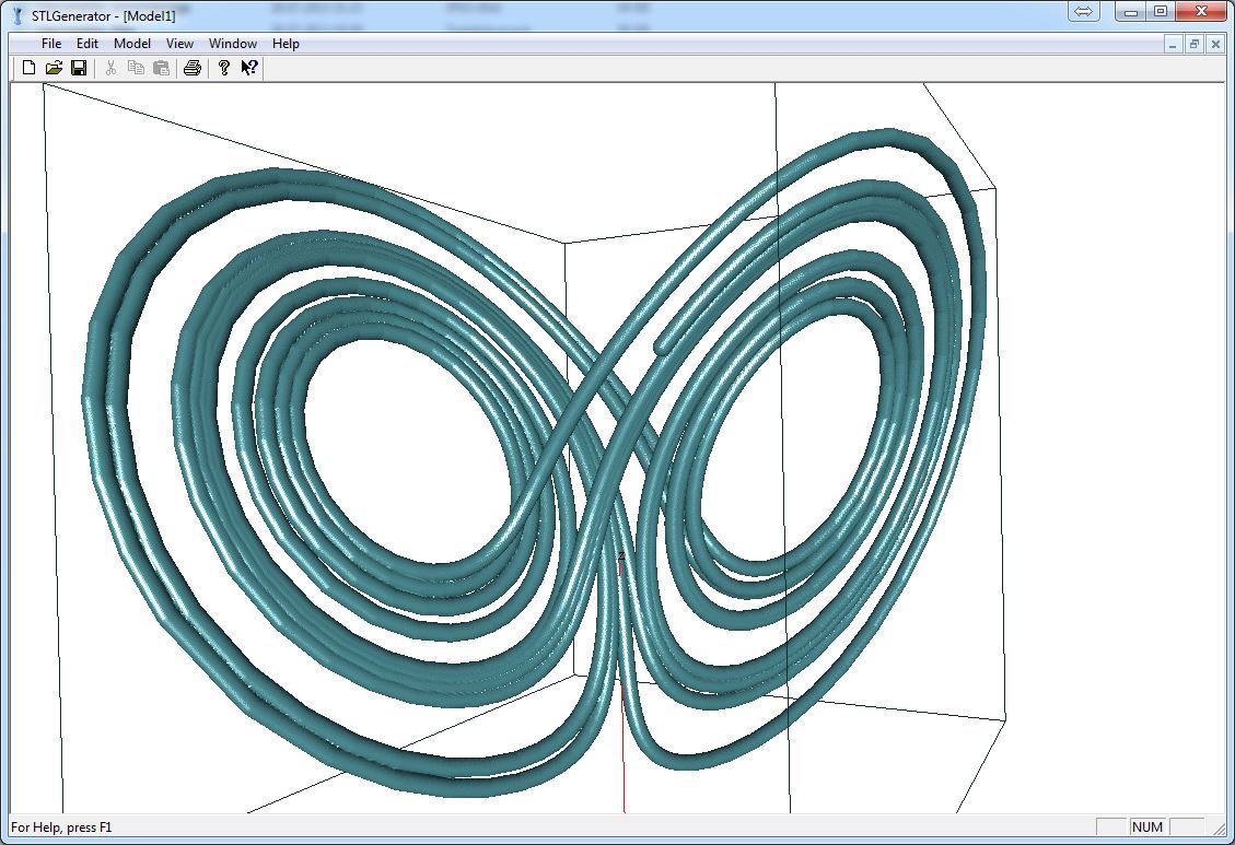 Dadurch erhalten wir ein Modell des Lorenz Attraktors mit dickeren Pfaden, das wir als STL exportieren können.