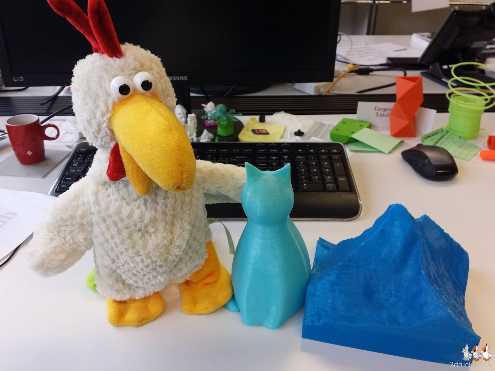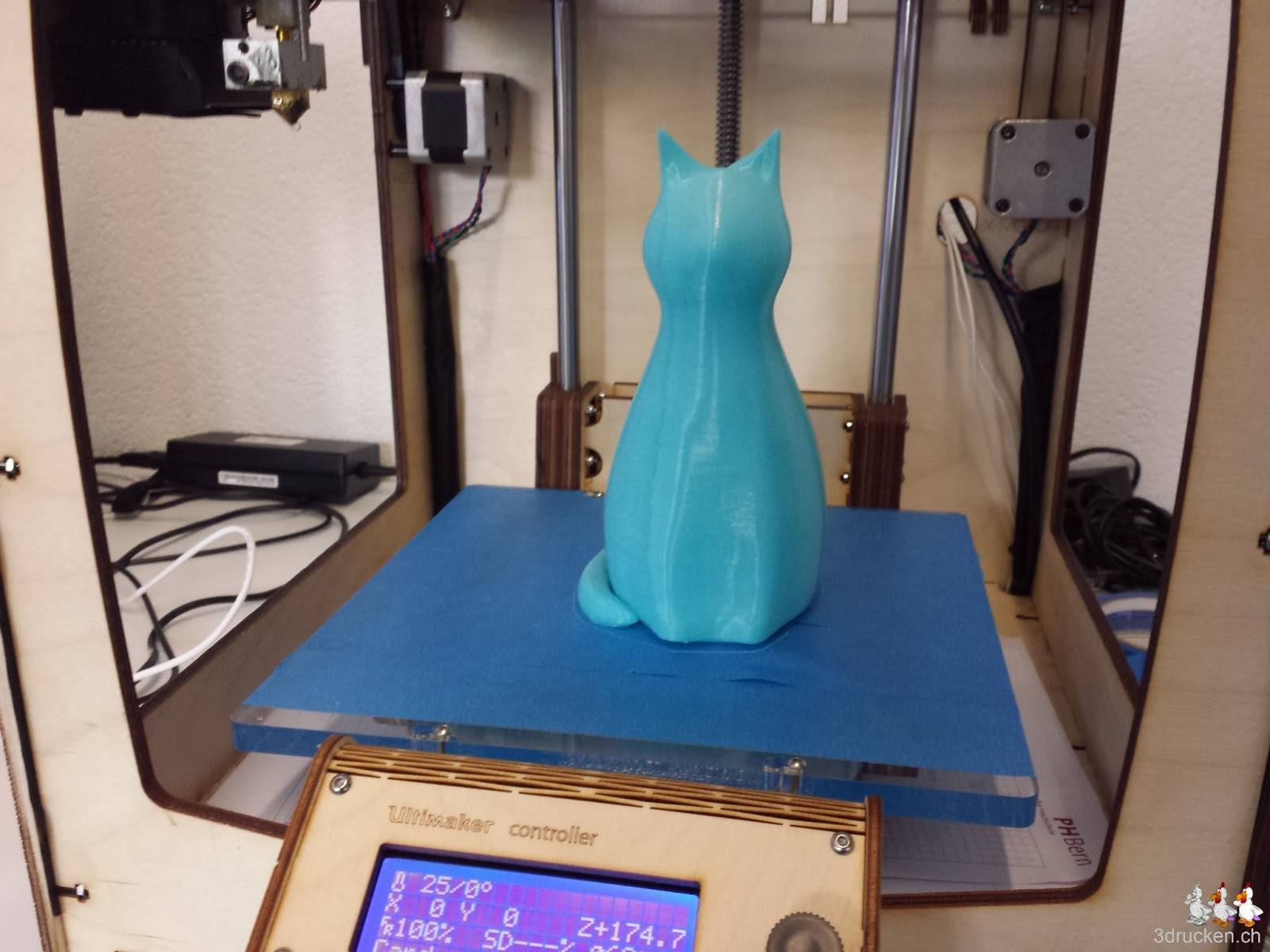 Noch mehr Katzen, der Güggel scheint sie zu mögen. Gruppenbild mit Güggel und Matterhorn. Druckzeit nicht mehr ablesbar, da Fabian Zurbuchen heute wieder mal zu schnell gearbeitet, und die SD-Karte deshalb bereits entfernt hat. Mit 5 % Füllung erreichten wir zudem auch, dass die grosse Lucy oben am Kopf keine Löcher hat, wie die kleine Lucyi, die wir zuvor gedruckt hatten.
