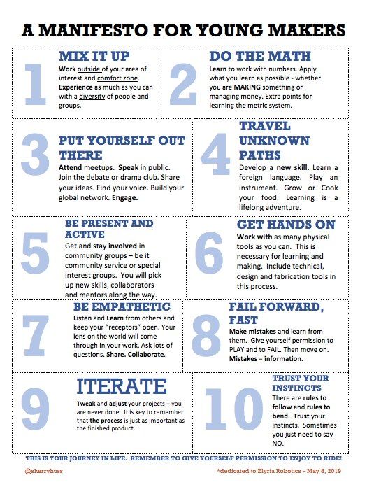 Sherry Huss hat der globalen Community freundlicherweise eine Sammlung von 10 Punkte, ein Manifest als Vorlage zur Verfügung gestellt. Es ist aus Inputs von der Community, angereichert durch ihre eigene Auffassung entstanden. Sie möchte das Manifest als Inspiration und Motivation verstanden wissen, damit (junge) Maker angeregt werden, ihr eigenes Manifest zu erstellen. Der Prozess bei der Findung der eigenen Punkte, beschreibt sie als wertvoll bei der Klärung, Orientierung und Identitätsfindung eines jeden Einzelnen.