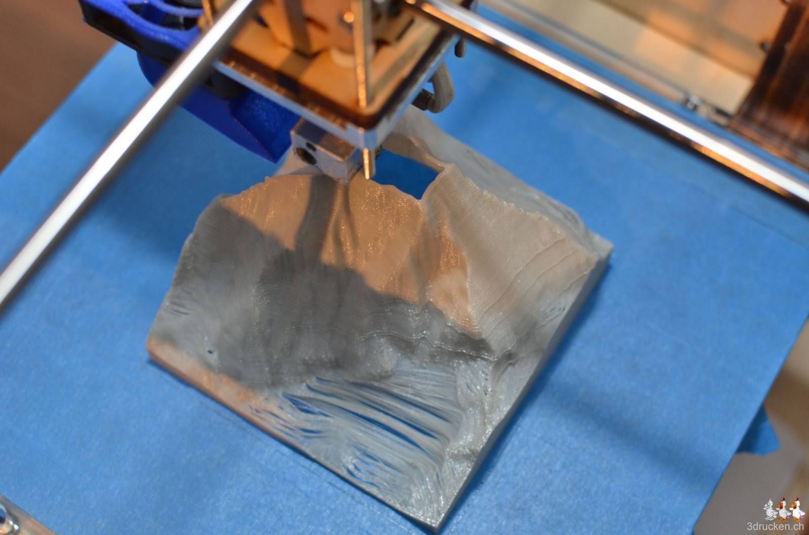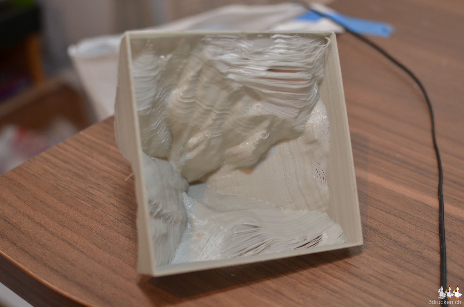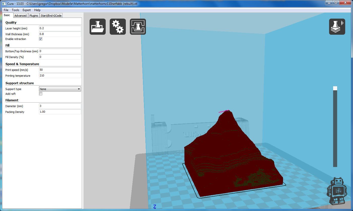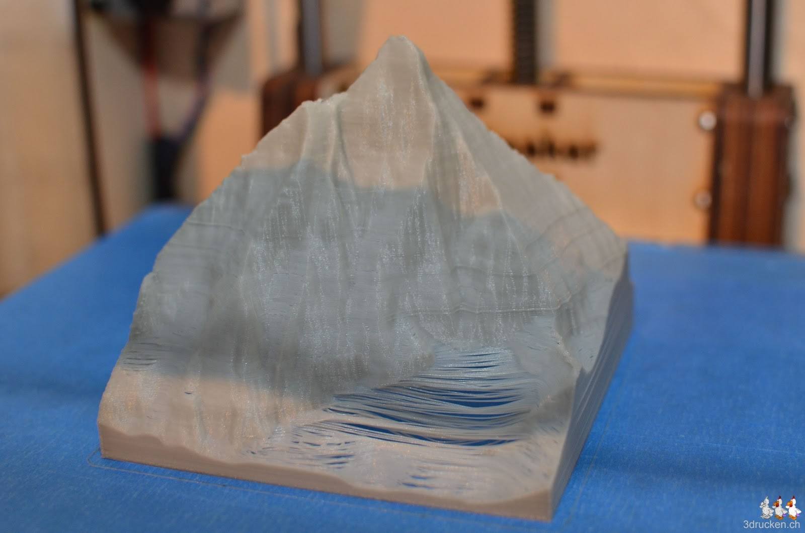 In Kombination mit 0 % Füllung bekommen wir in unserem Fall ein vollständig ausgehöhltes Matterhorn. Leider sind die Überhänge für die Grösse von 100 x 100 x 85 mm etwas zu gross. Nimmt man aber ein Modell ohne grosse Überhänge, kann man so viel Zeit und Material sparen. Beim Matterhorn sind es geschätzte 1 h 25 min, oder die doppelte Druckzeit. Der Materialverbrauch reduziert sich auch auf die Hälfte, und in nur 1 h 25 min ist das Matterhorn fertig gedruckt. Weitere Vorteile: Das Objekt verzieht sich praktisch nicht, und lässt sich gut vom Tisch lösen.