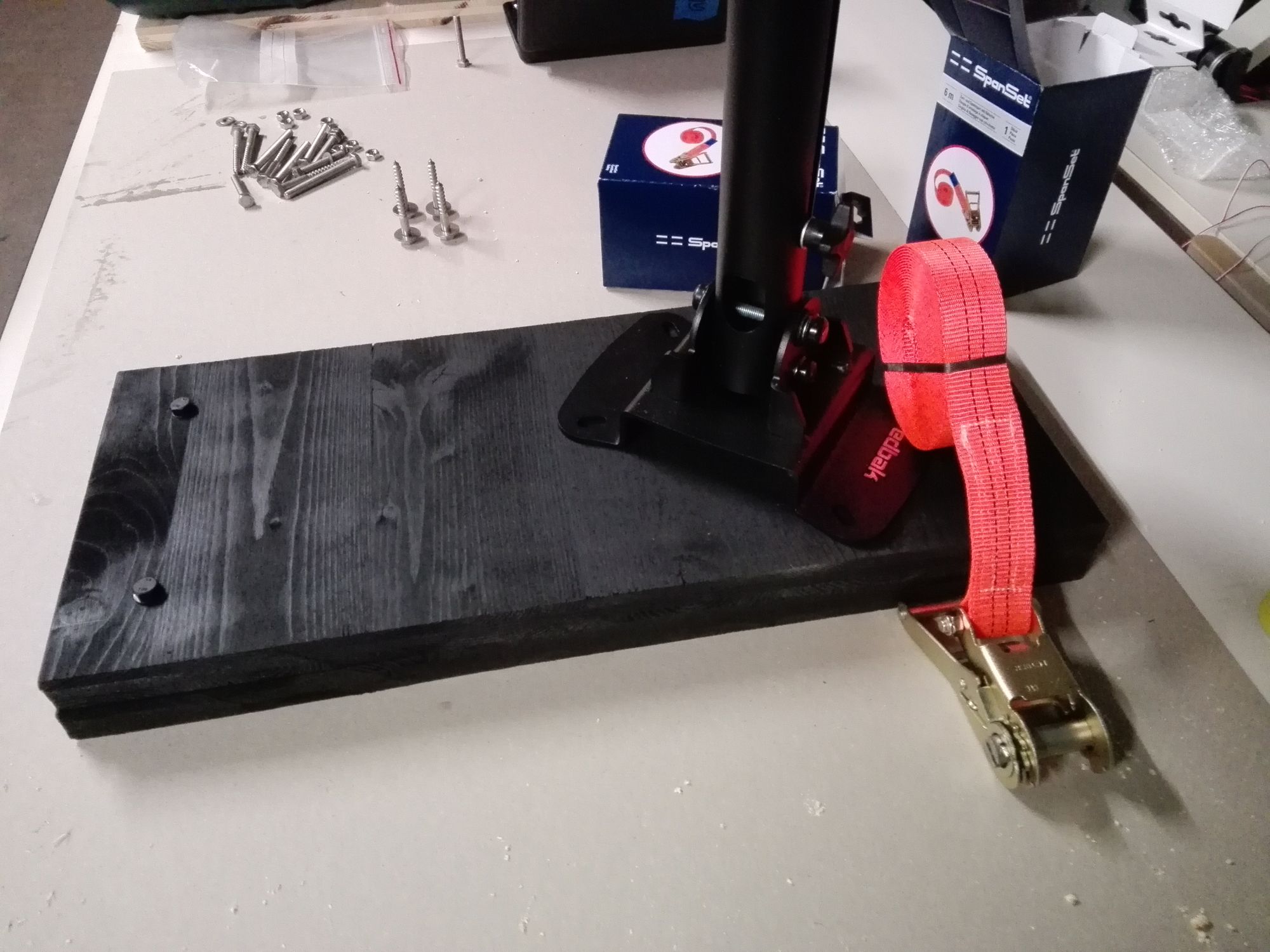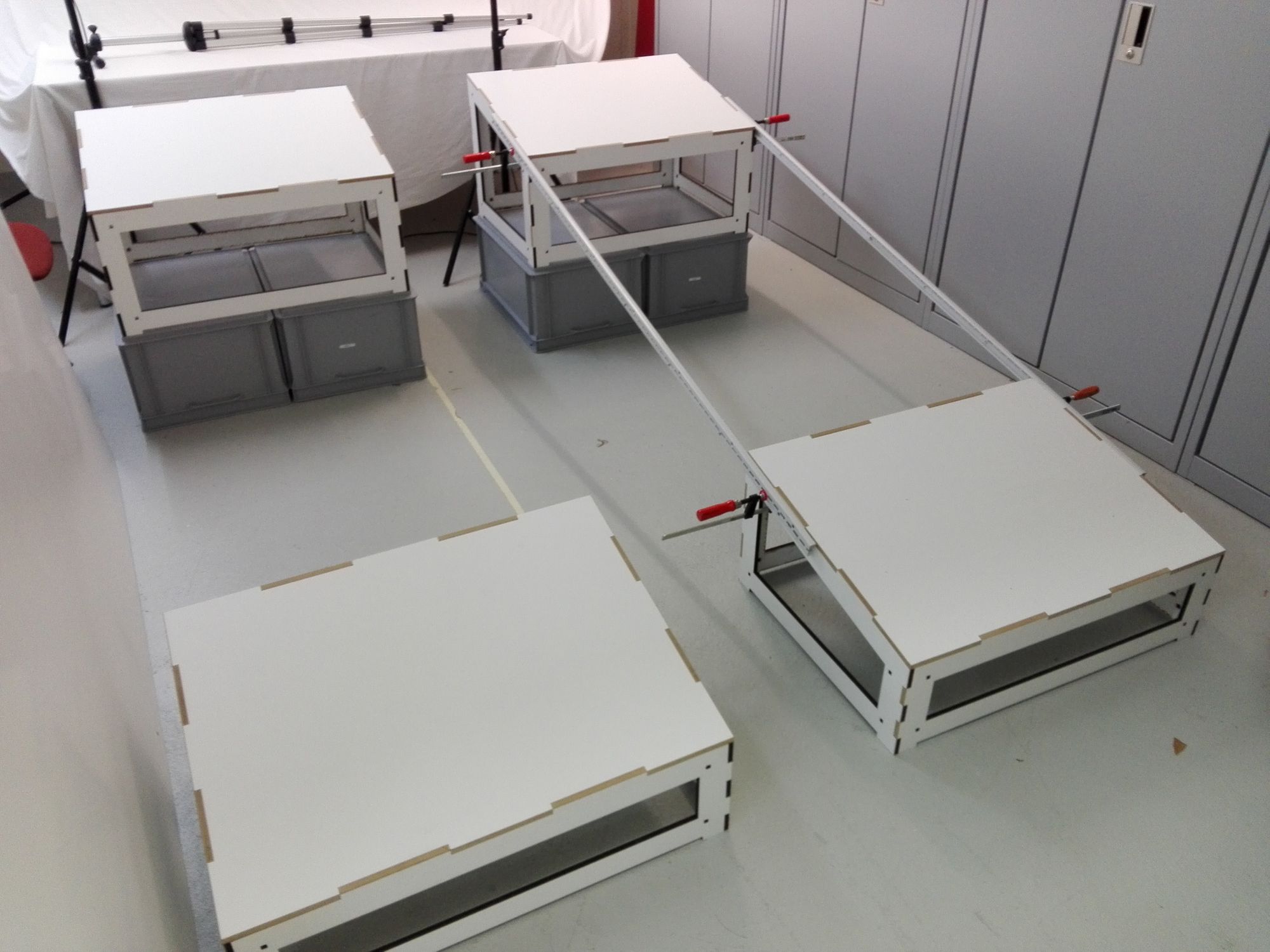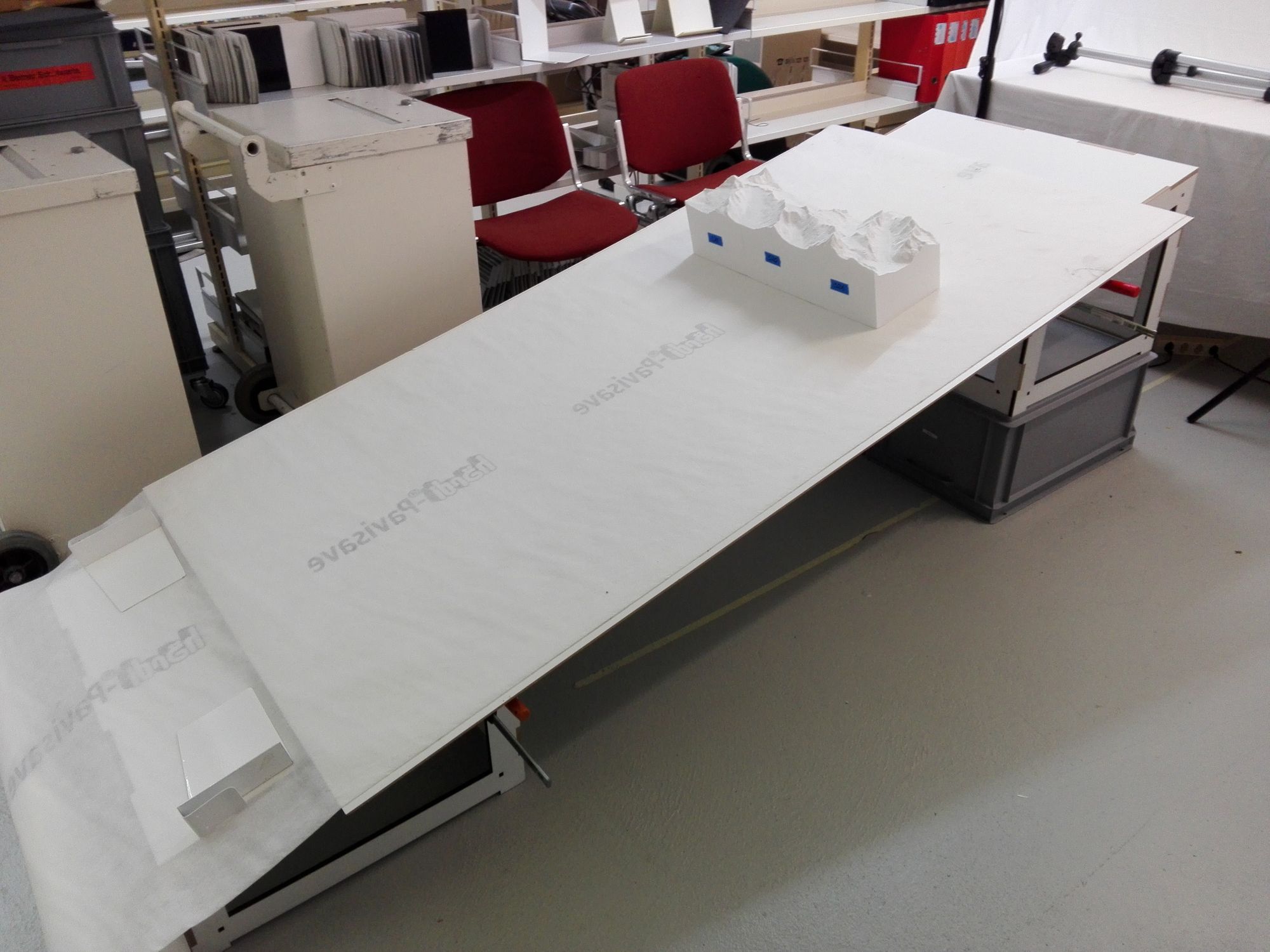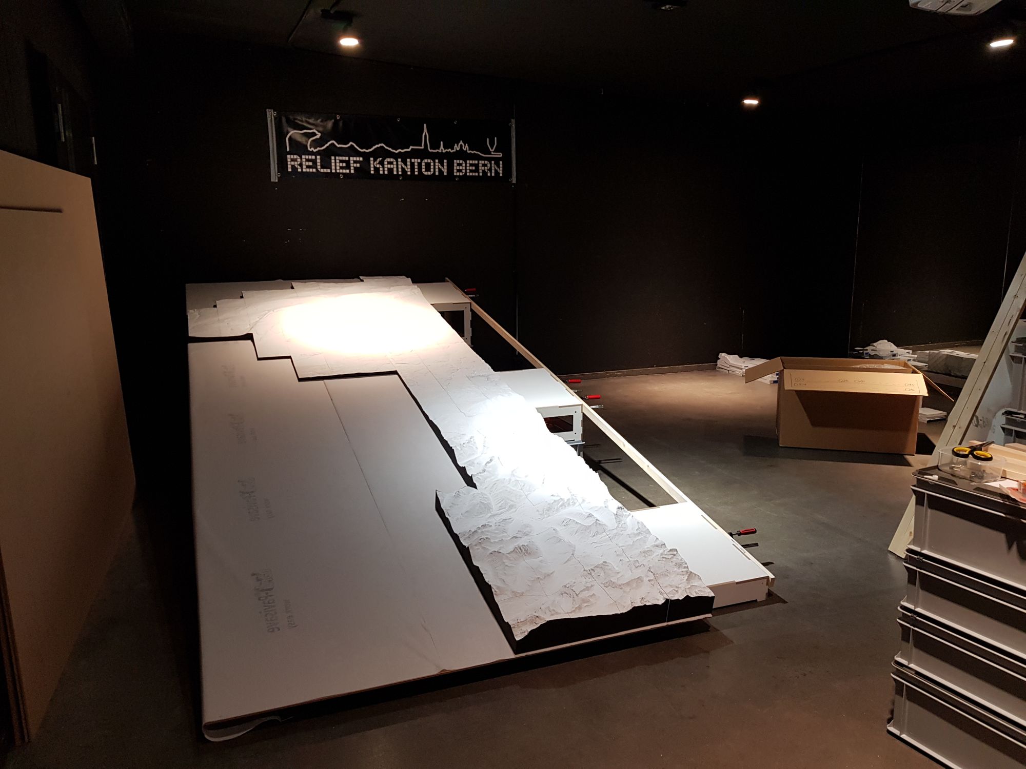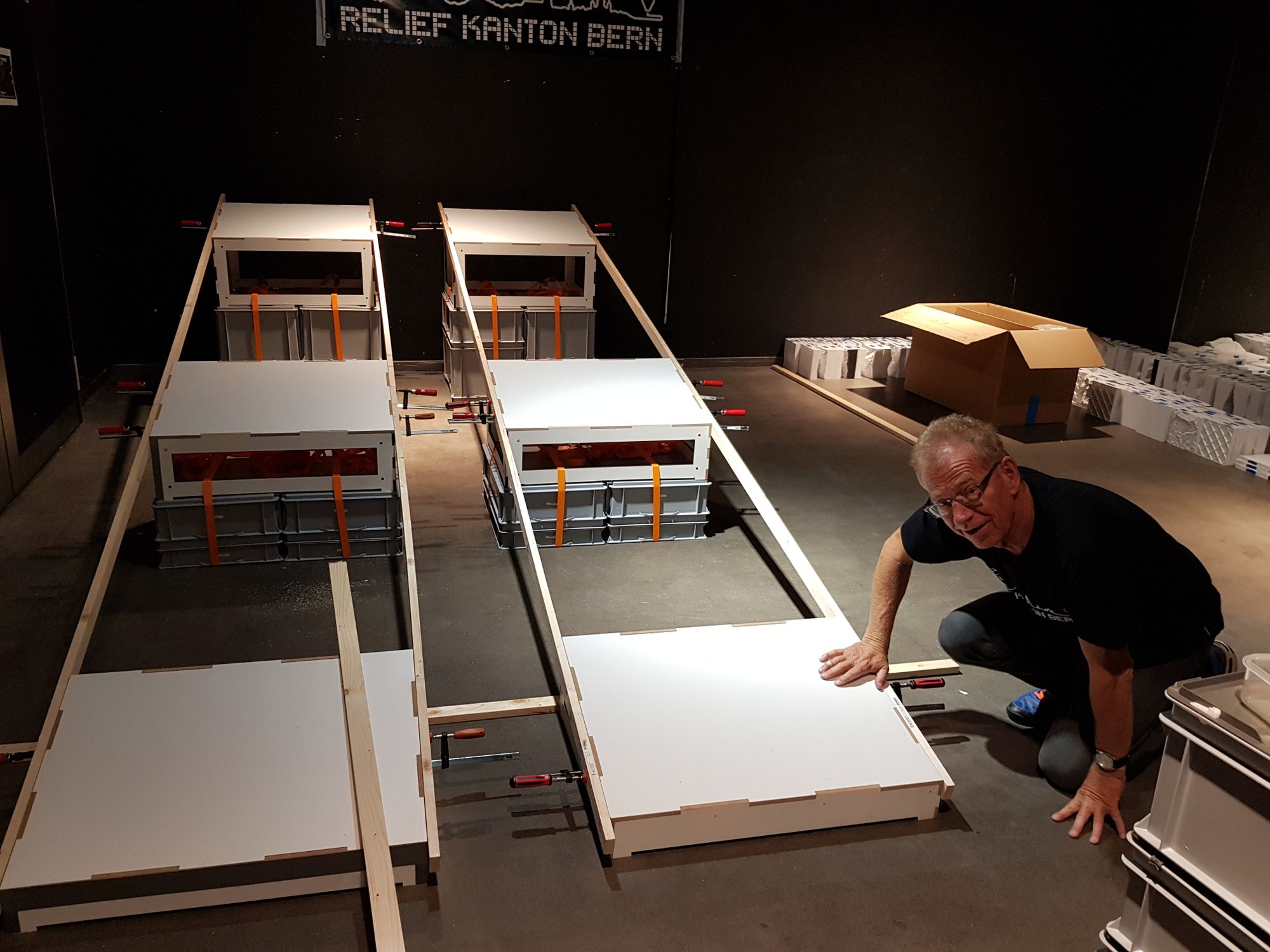 die Entwicklung und der Bau eines Podests für das Relief, wobei wir die bestehenden Podestteile von der Ausstellung des Reliefs im Rahmen des GeoSummit 2016 als Grundlage genommen haben, diese je nach Position auf verschieden hohe RAKO Kisten gestellt haben, und schliesslich mit Span-Gurten fixiert haben