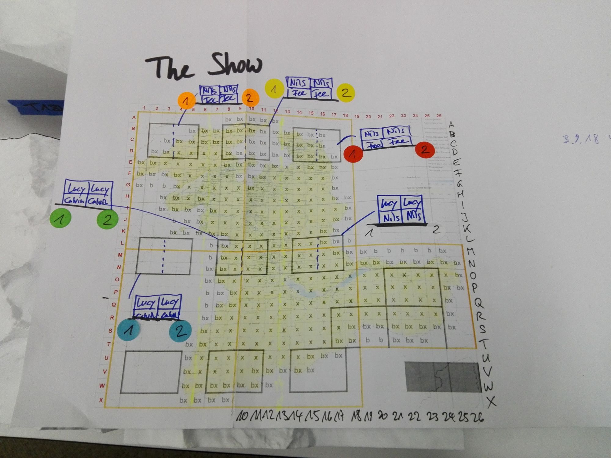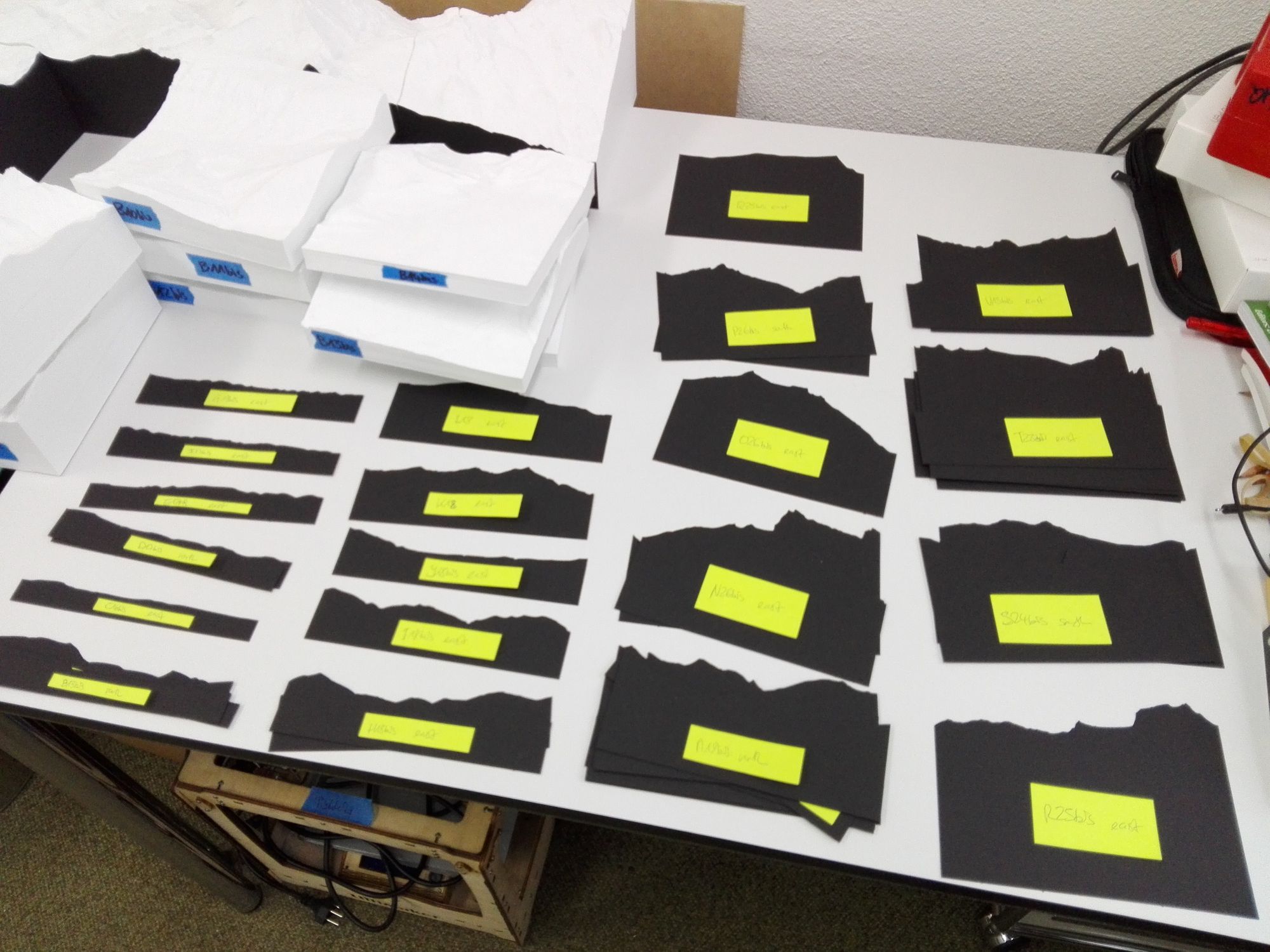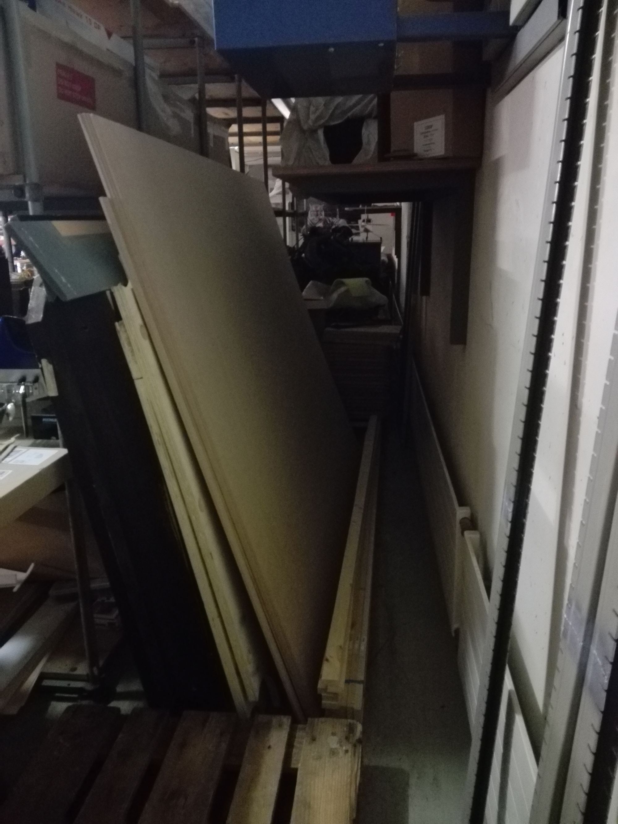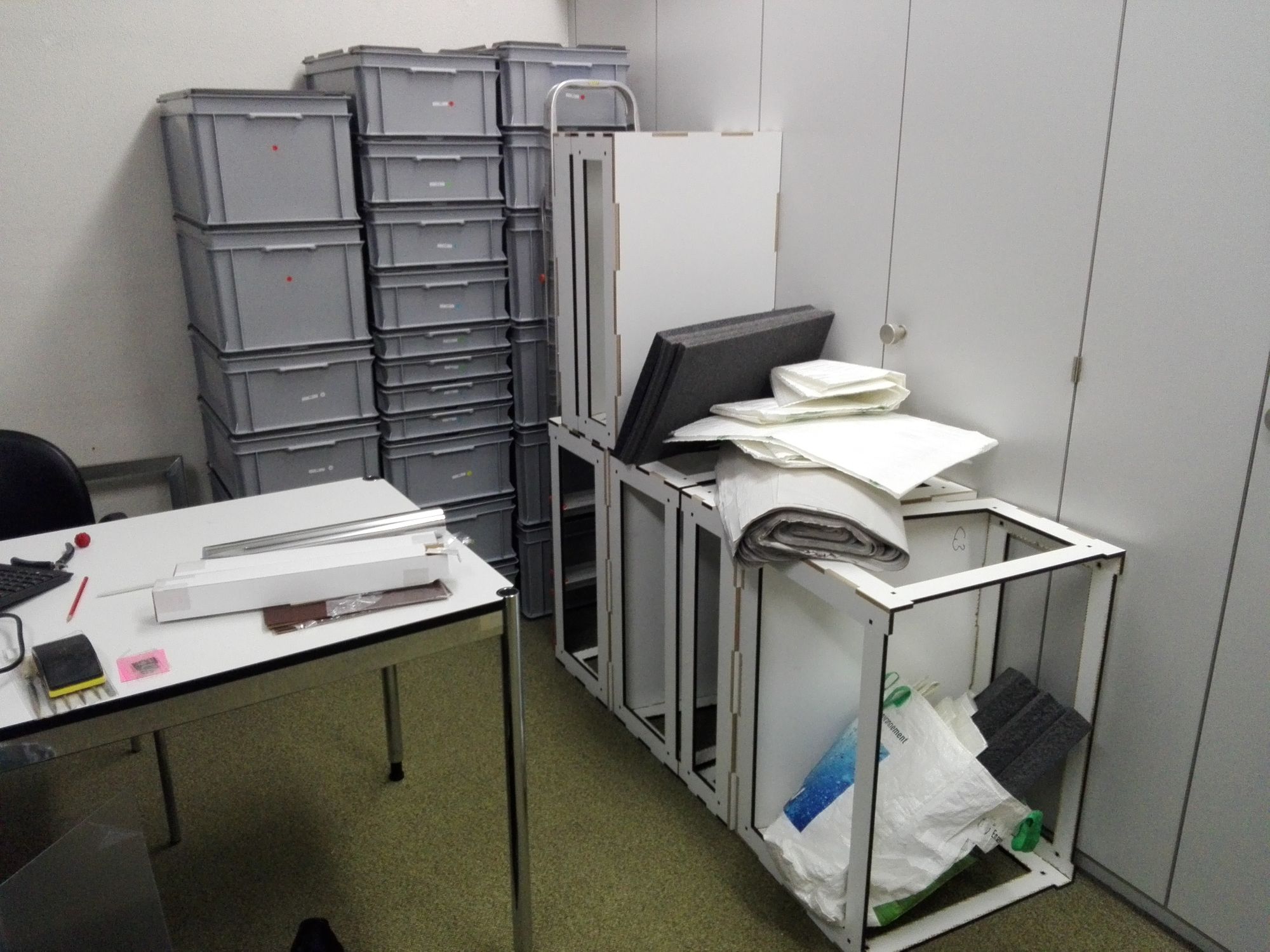 Waren die Vorbereitungsarbeiten erst mal abgeschlossen, ging es ans Hauptwerk, an den Bau des Podests, dessen Verkleidung, und den Aufbau der 360 Reliefteile auf diesem Podest. Res, unser Edelhelfer, war zwar vom Konzept unseres Podestaufbaus begeistert, allerdings hatte unsere Idee, die für das Fundament des Podests vorgesehenen Kisten gleichzeitig auch für den Transport der Reliefteile zu verwenden, den entscheidenden Nachteil, dass wir die Kisten zuerst auspacken mussten, bevor wir sie für den Podestbau verwenden konnten. Die Reliefteile haben wir in der rechten hinteren Ecke des Raums vorerst einmal zwischengelagert.