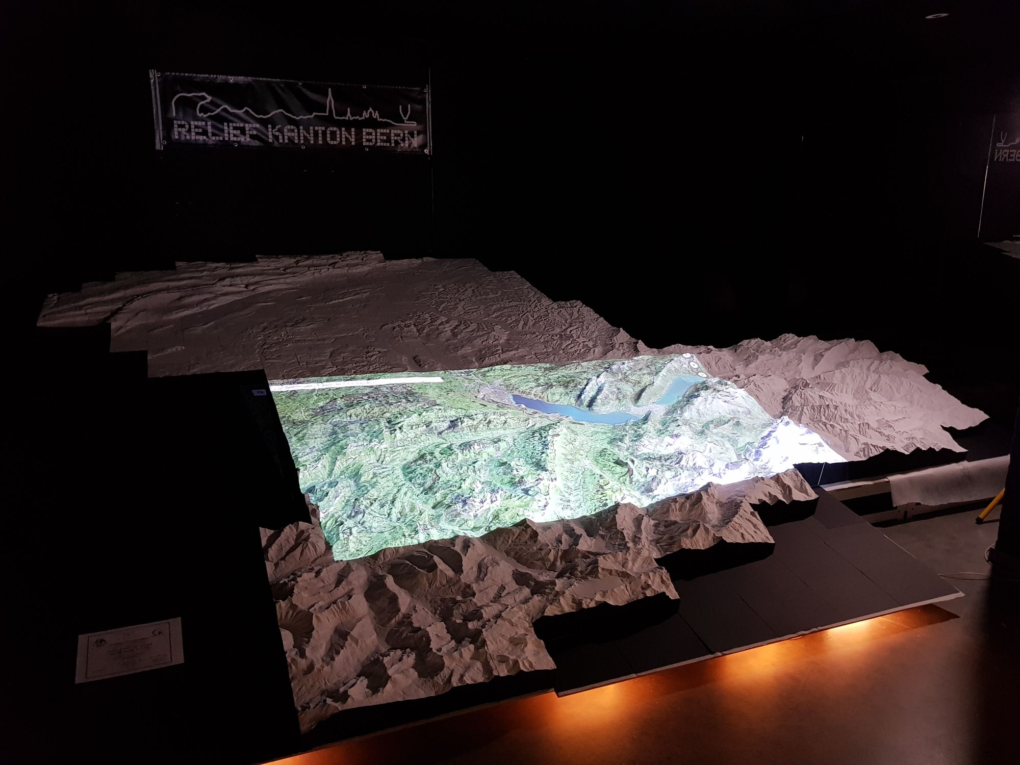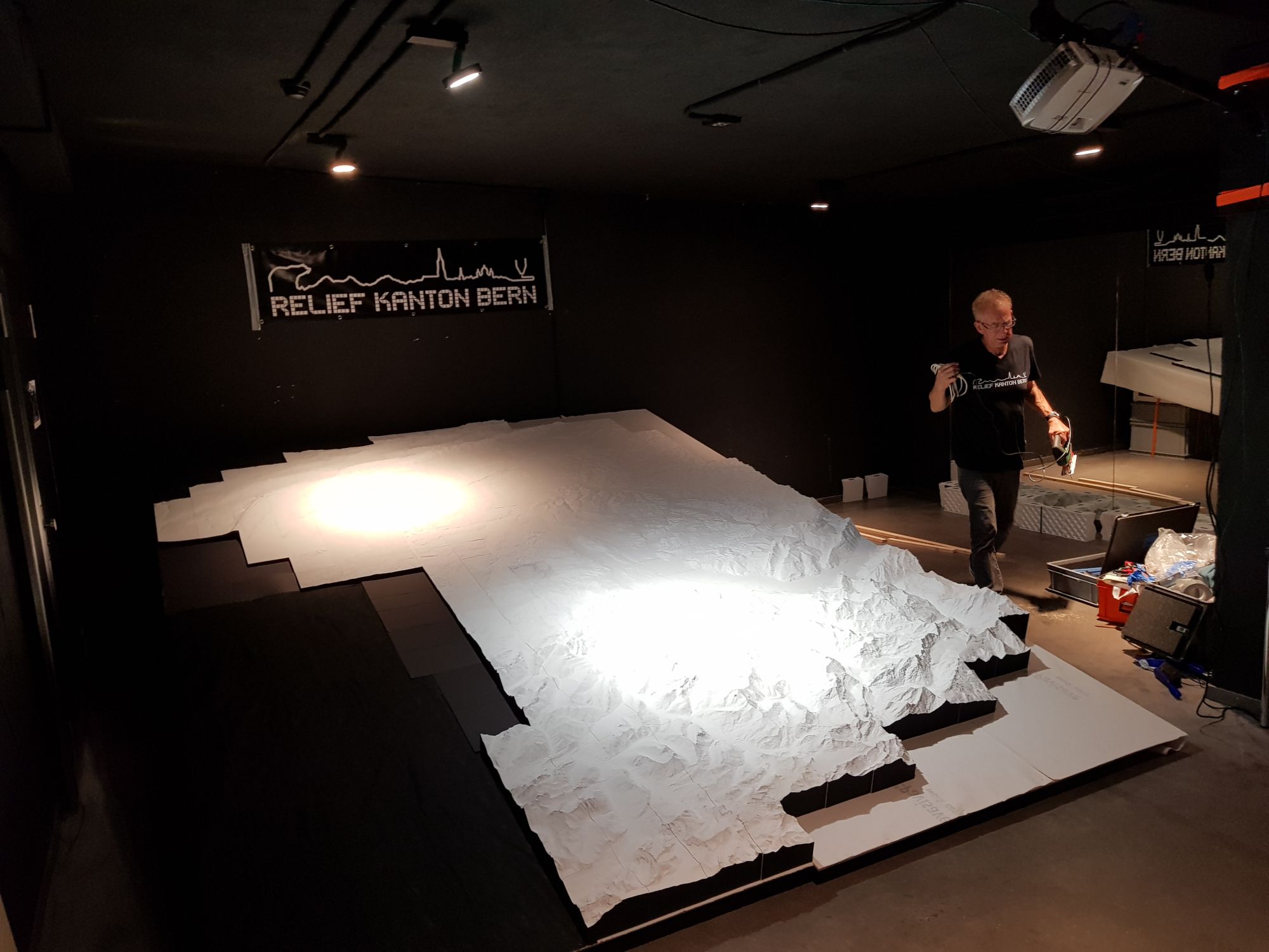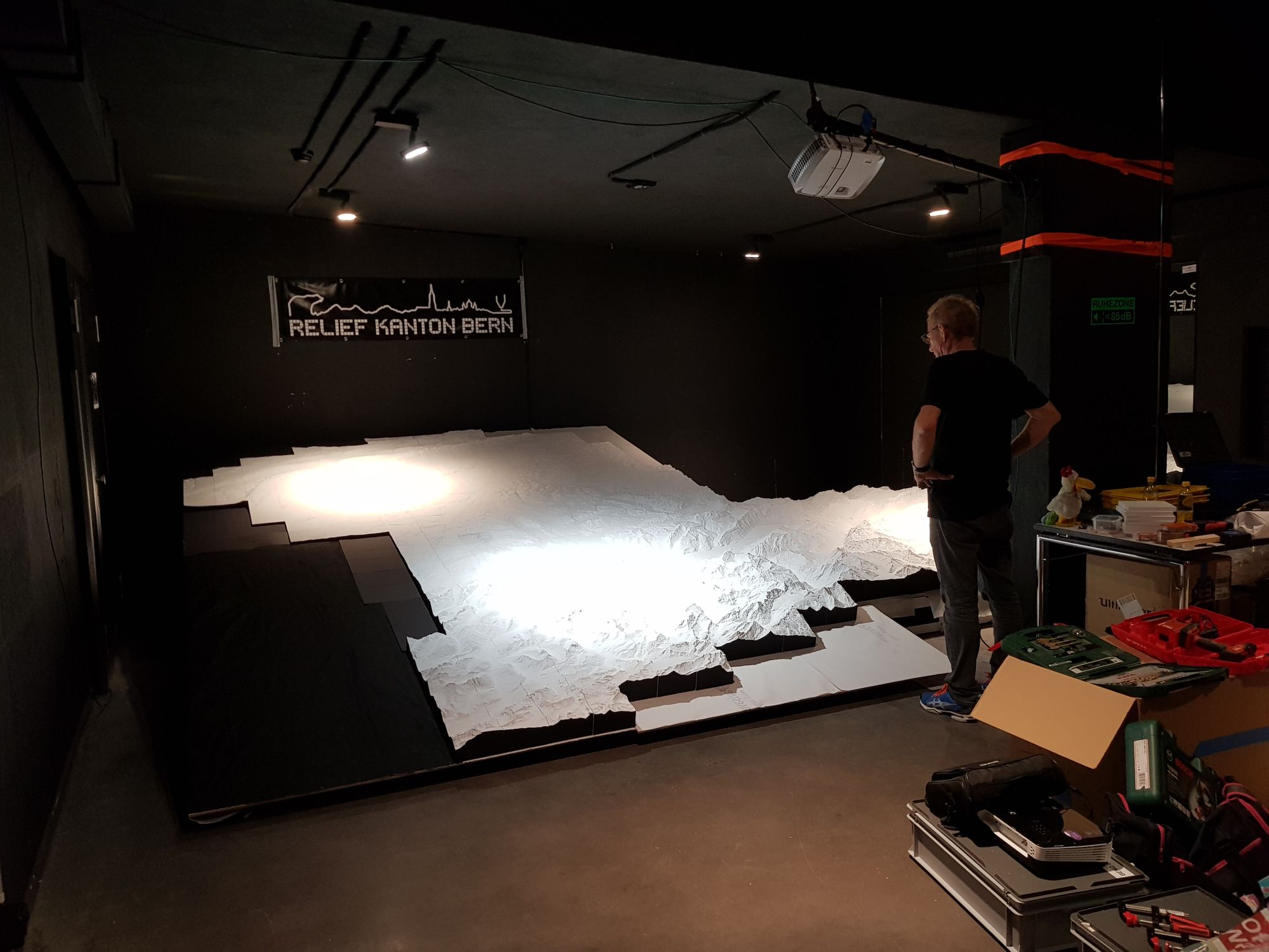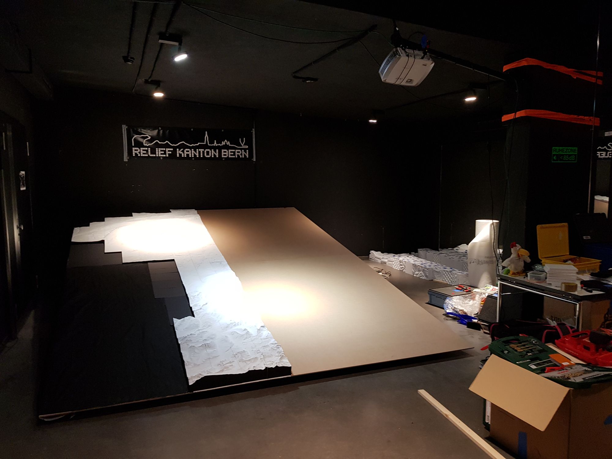 Die Beleuchtung unter dem Relief wollte angebracht, das Beamerbild auf dem Relief eingepasst sein,