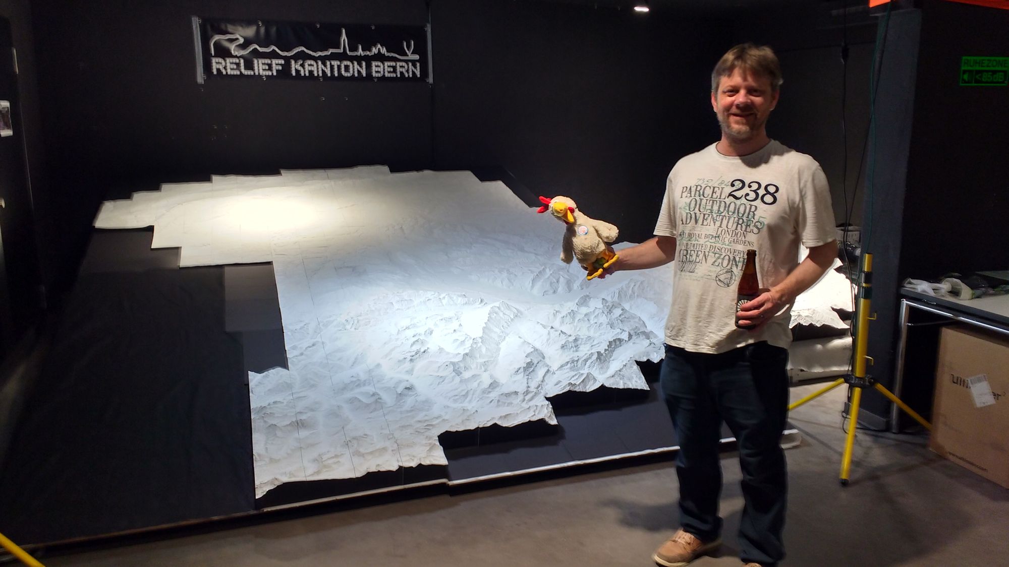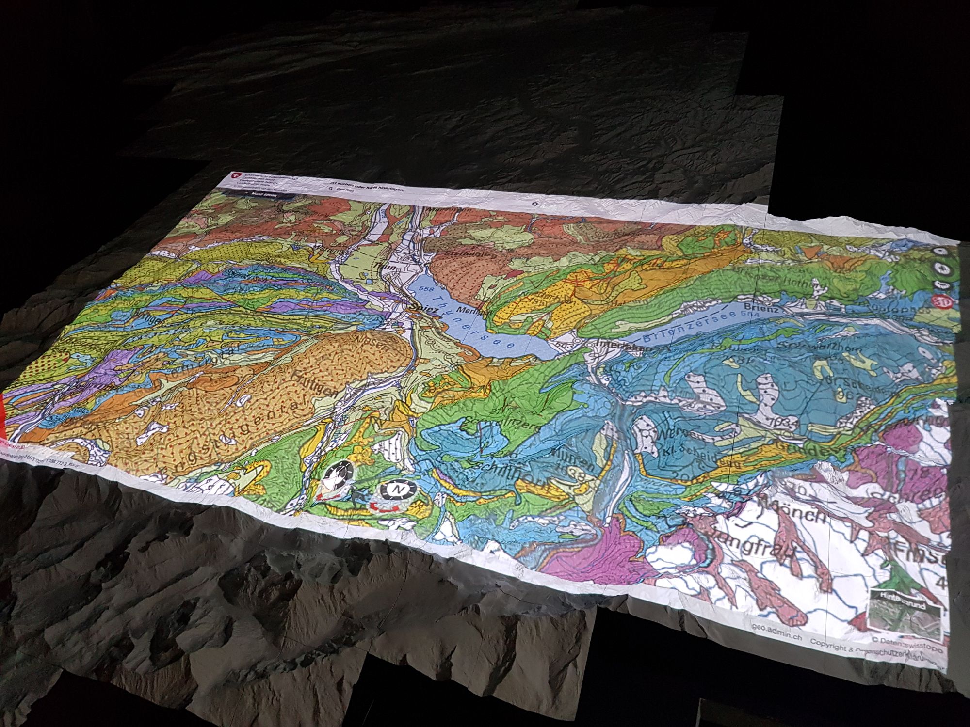 Am Sonntag hat uns kurzfristig und spontan unser Arbeitskollege Nico in Zürich unterstützt. Er brachte mit seinem Apple-Computer das Bild des Beamers durch das eingebaute adaptive Zooming passgenauer auf das Relief, was eine deutliche Verbesserung darstellte. Ebenso freute es uns, den zweiten Tag mit Nico teilen zu dürfen, und etwas Zeit zusammen zu verbringen.