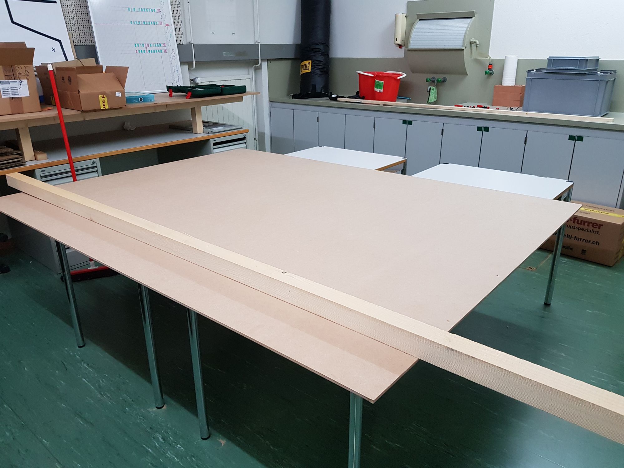 Am nächsten Tag trafen wir früh am Morgen unseren Edelhelfer Res Urfer am Bahnhof in Interlaken, von wo aus wir in die Werkstatt gefahren sind, wo weiteres Material darauf wartete, eingeladen zu werden. Es waren dies hauptsächlich die grossen MDF-Platten und die Dachlatten für den Bau des Podests.